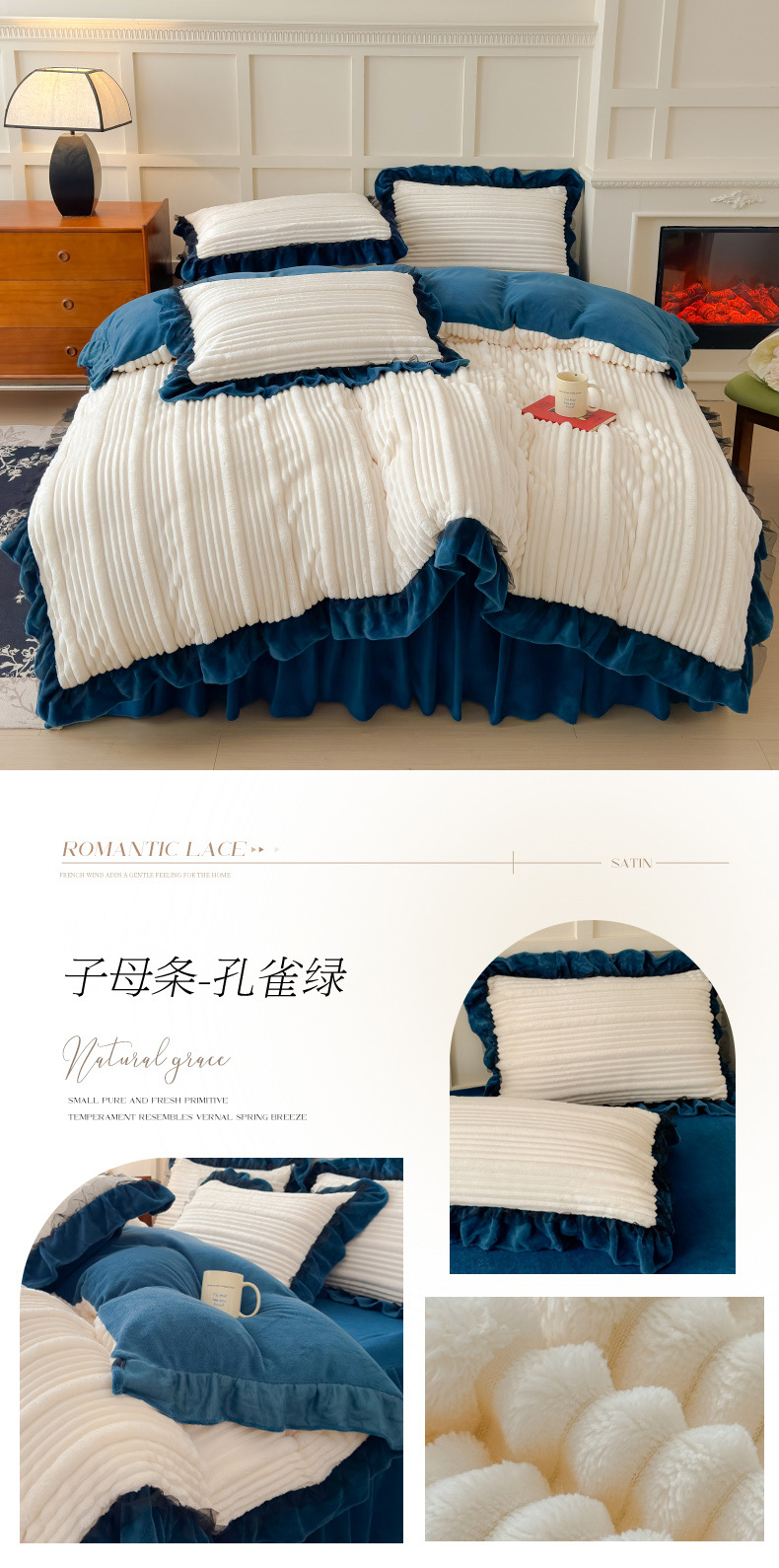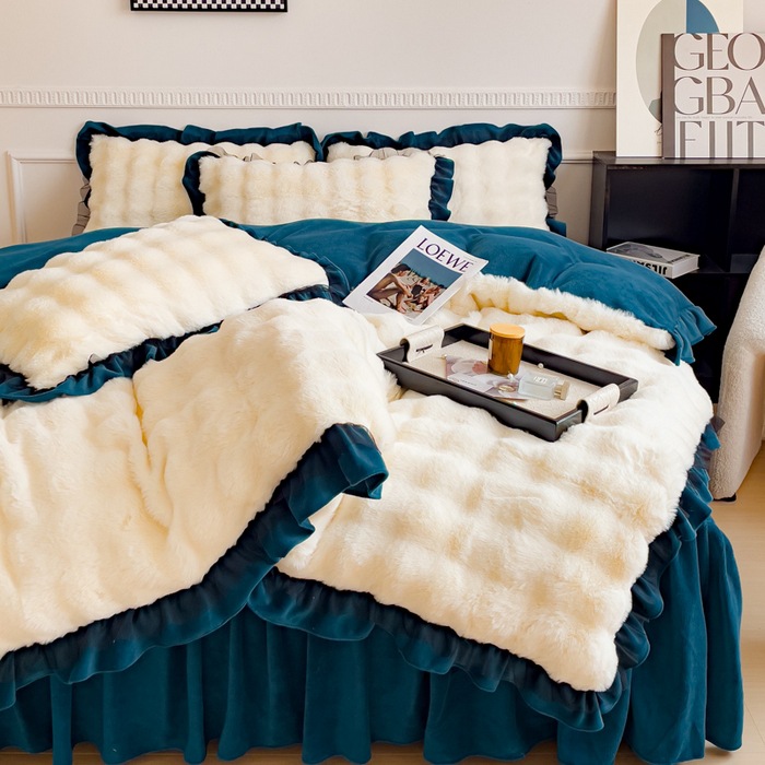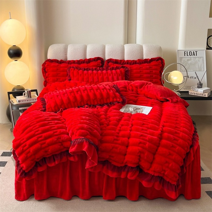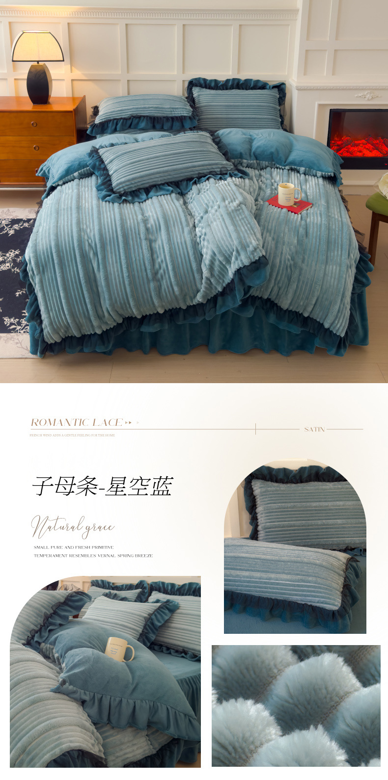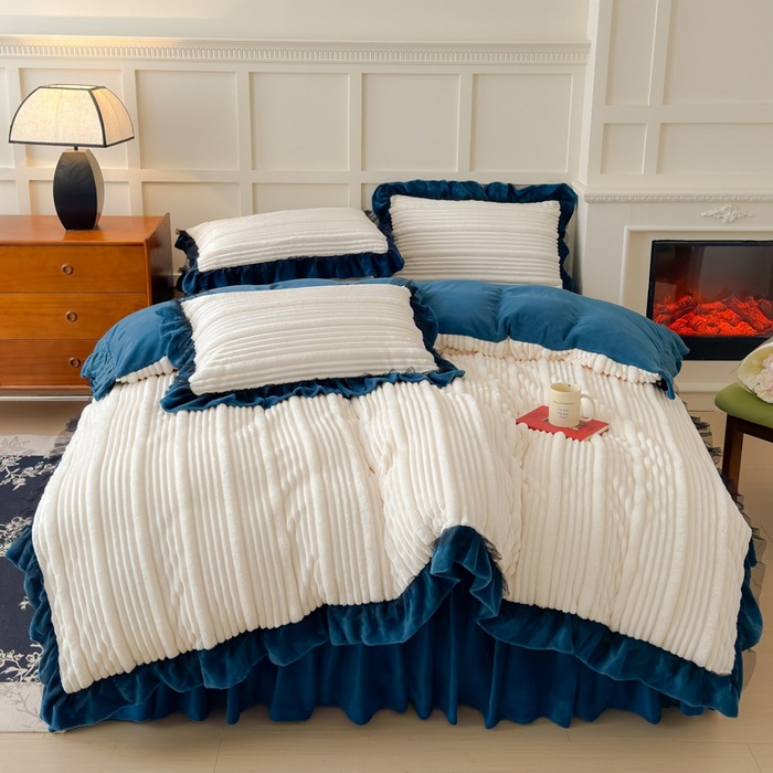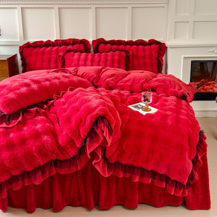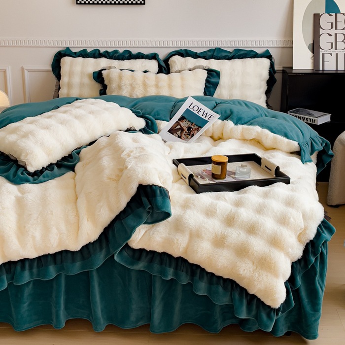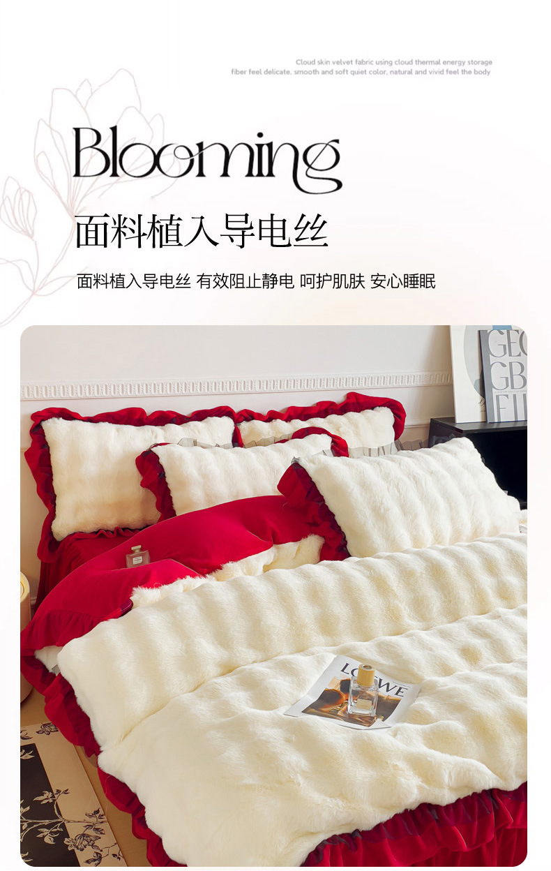 두꺼운 따뜻한 토끼 토끼 벨벳 우유 벨벳 침대 스커트 시트 4 피스 세트의 2024 새로운 한국어 버전