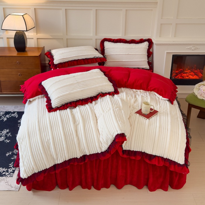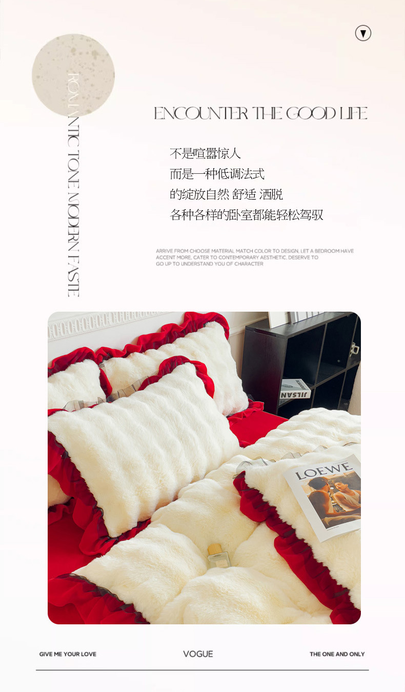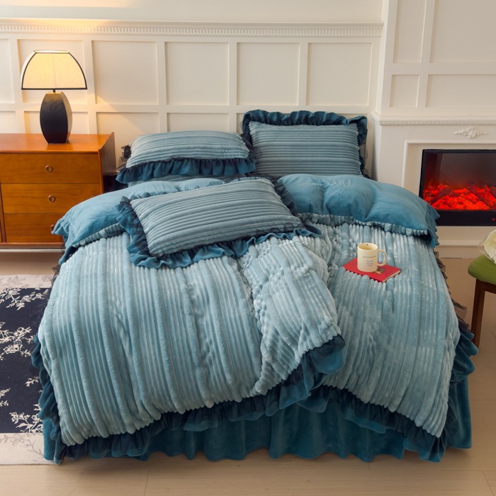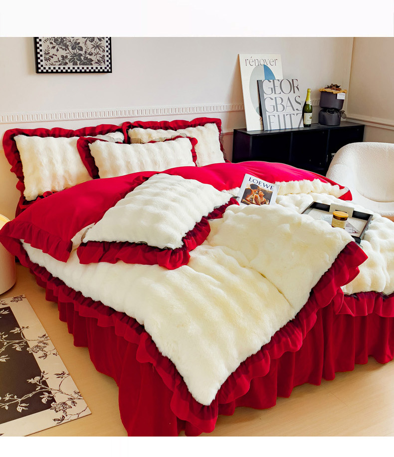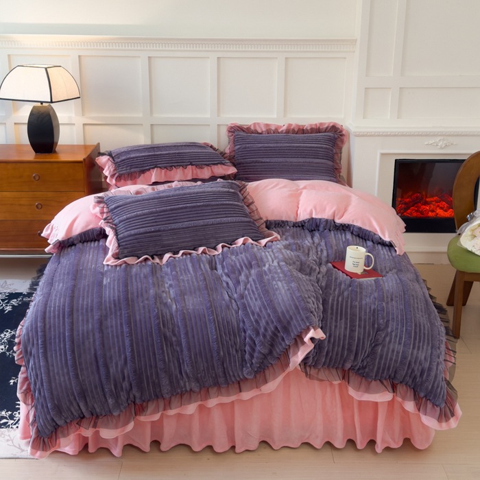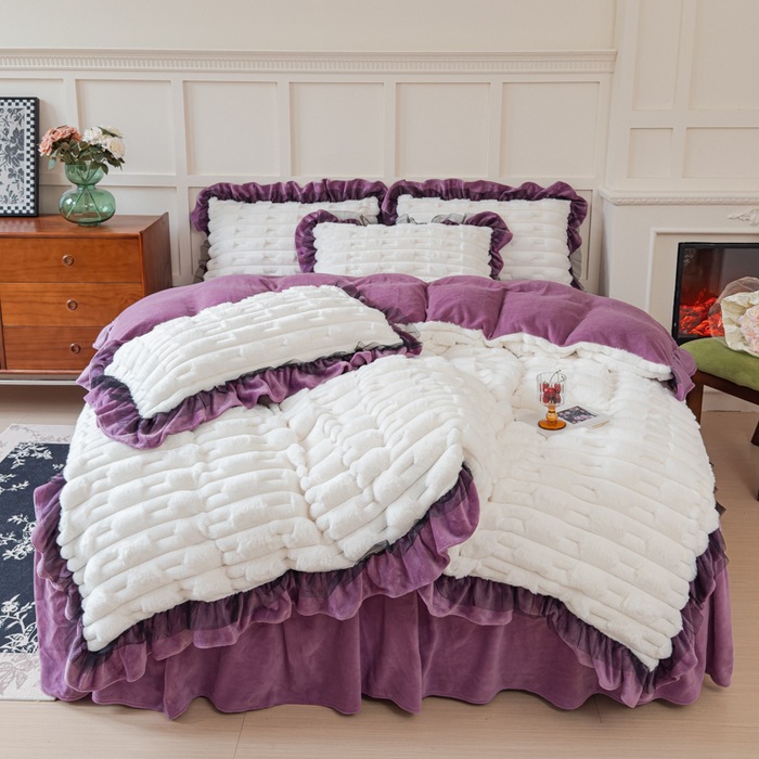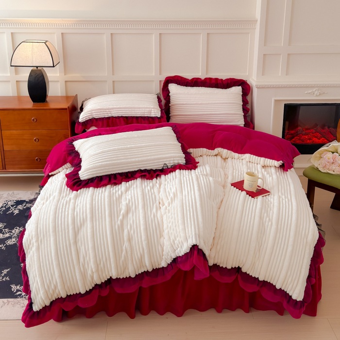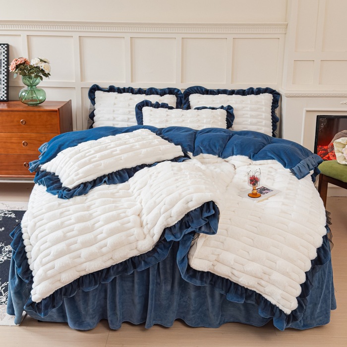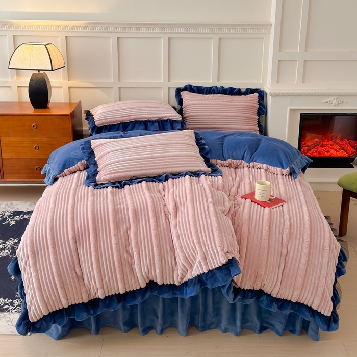 두꺼운 따뜻한 토끼 토끼 벨벳 우유 벨벳 침대 스커트 시트 4 피스 세트의 2024 새로운 한국어 버전