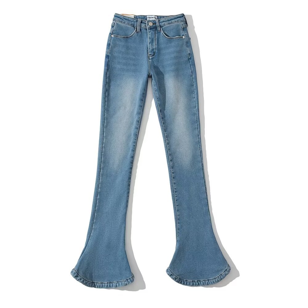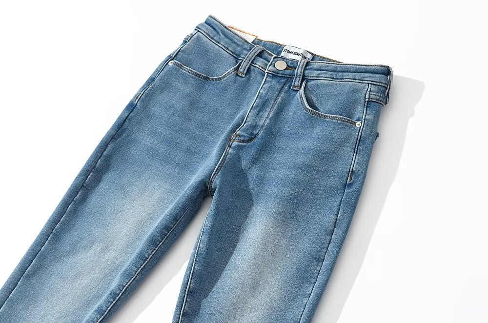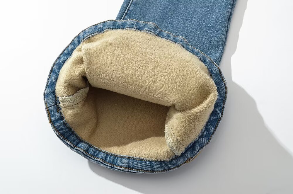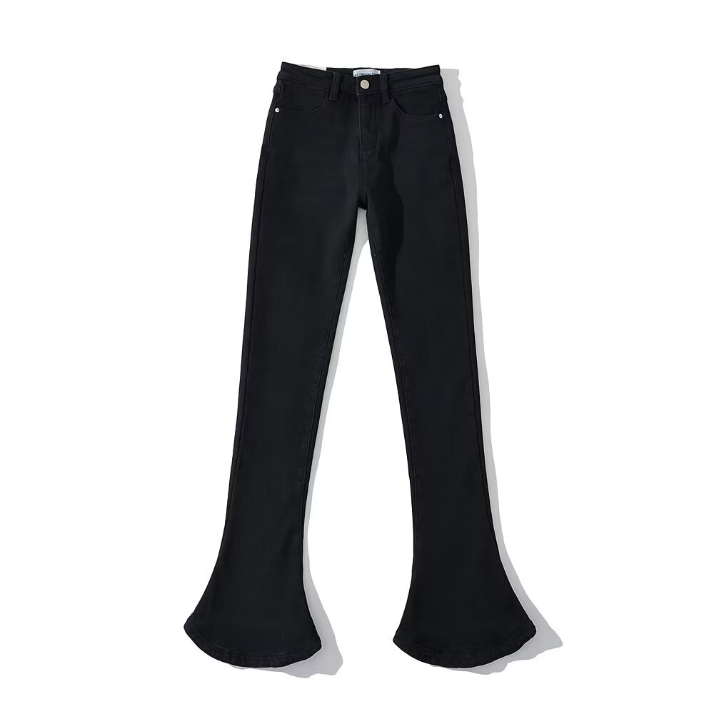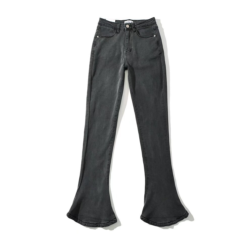 가을과 겨울 두꺼운 기모 아메리칸 스타일 레트로 높은 허리 탄성 슬림 핏 다리 긴 말굽 바지 여성용 마이크로 플레어 데님 바지스토어 가기