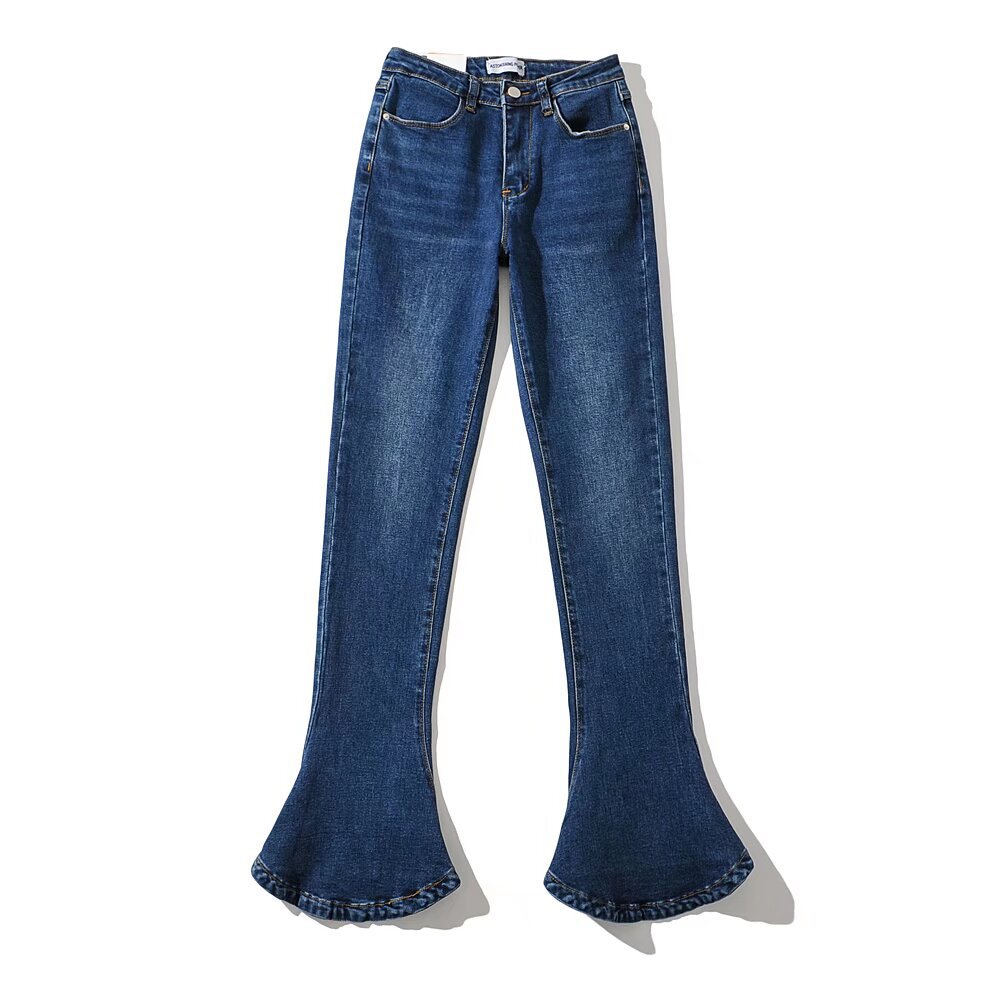 가을과 겨울 두꺼운 기모 아메리칸 스타일 레트로 높은 허리 탄성 슬림 핏 다리 긴 말굽 바지 여성용 마이크로 플레어 데님 바지