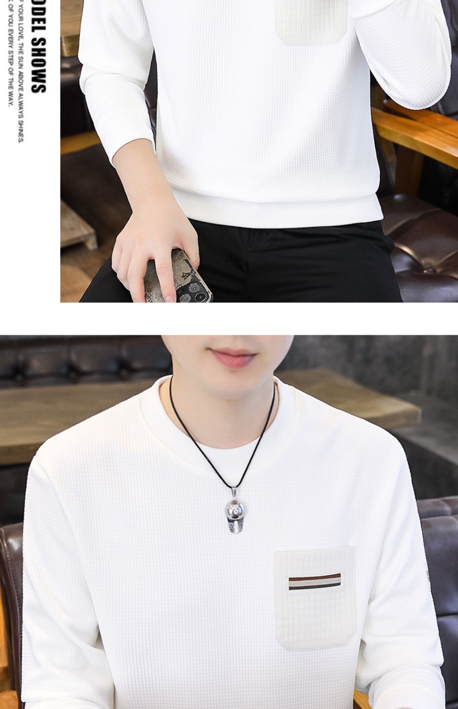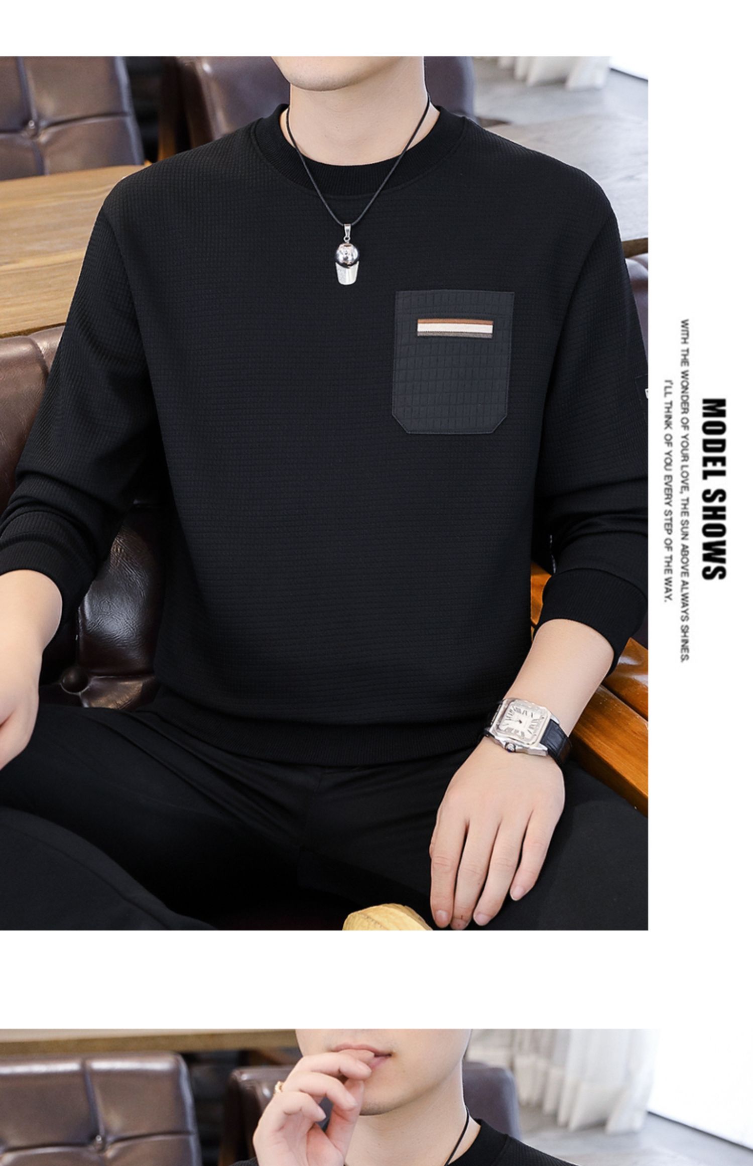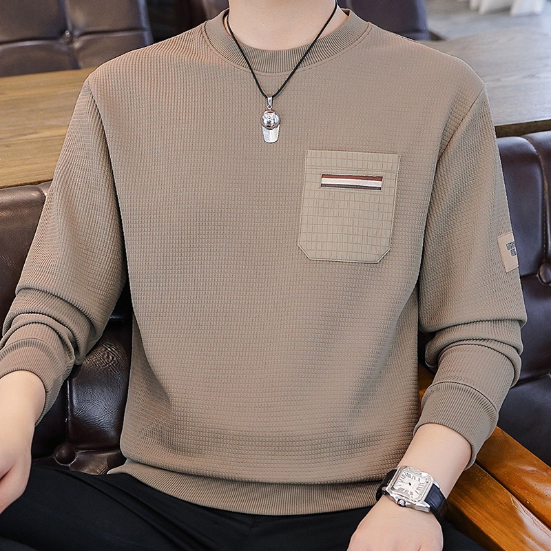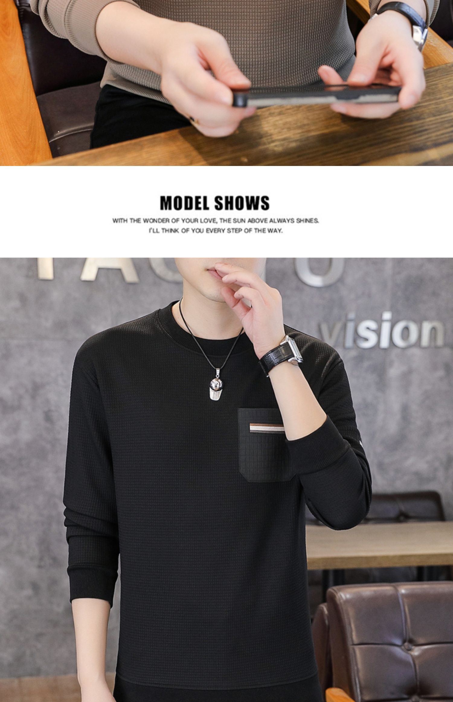 남자 긴팔 티셔츠 봄과 가을 느슨한 올매치 와플 스웨터 독특한 가슴 포켓 라운드 넥베이스 셔츠