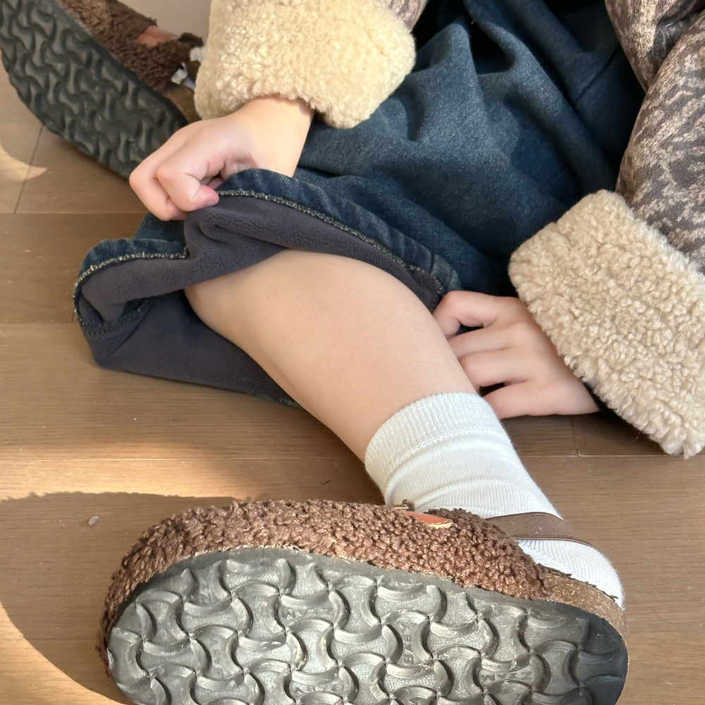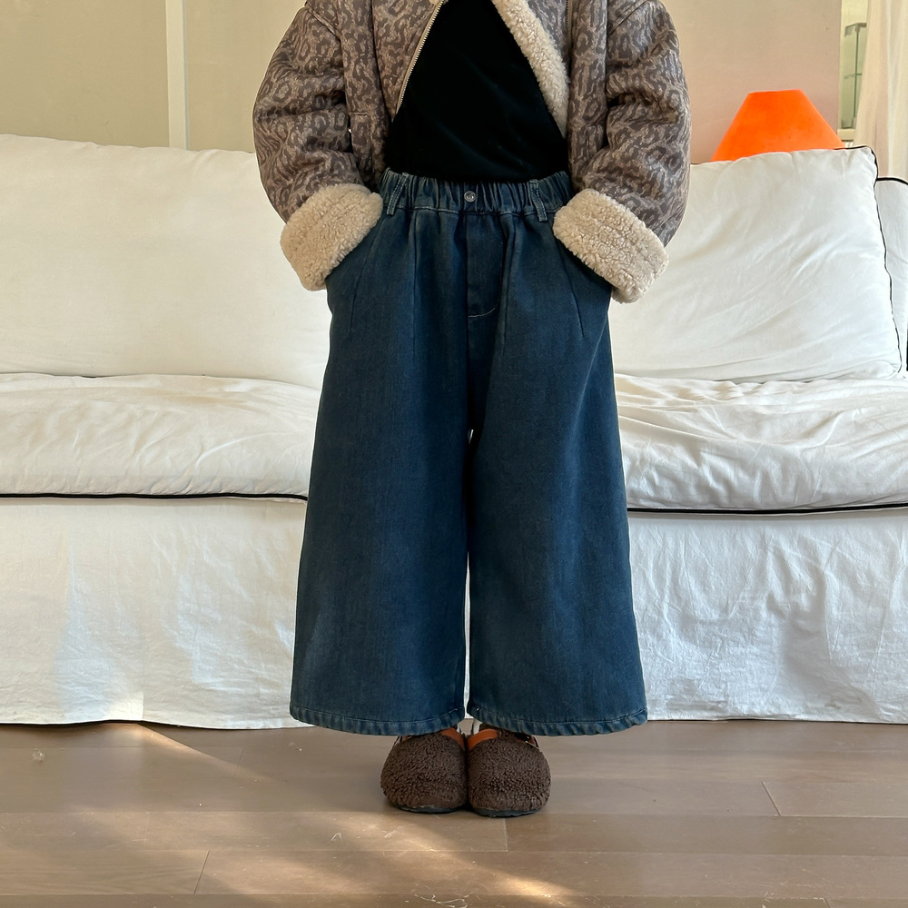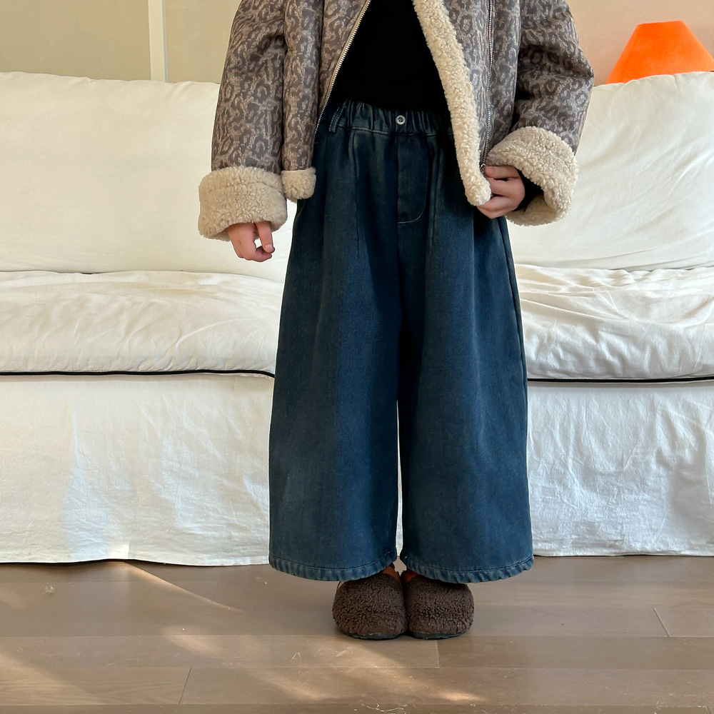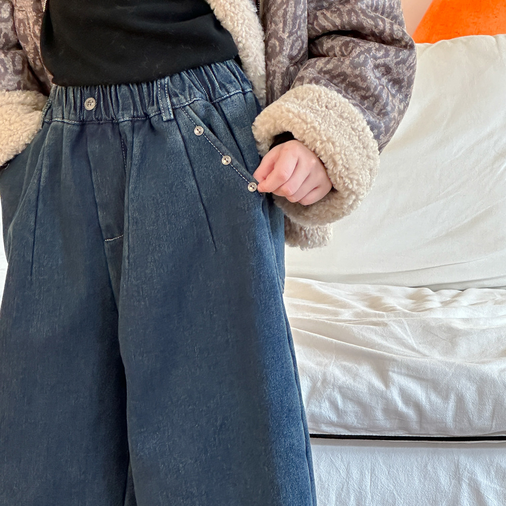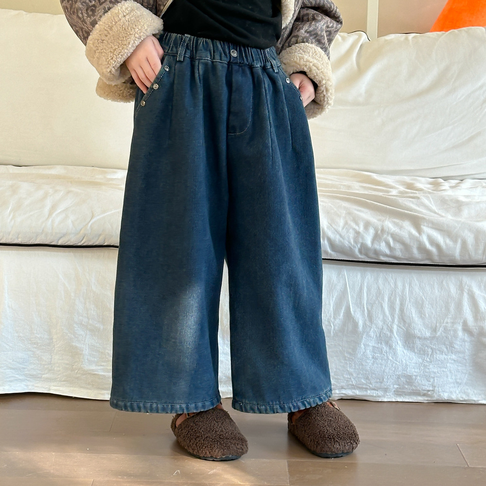 아동용 바지 2025 겨울 여아용 한국 스타일 단색 디자인 데님 바지 아동용 플리스 안감 캐주얼 루즈핏 스트레이트 롱 팬츠스토어 가기