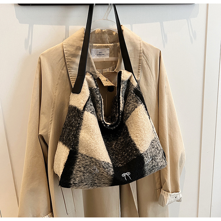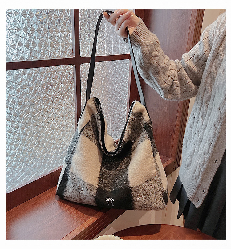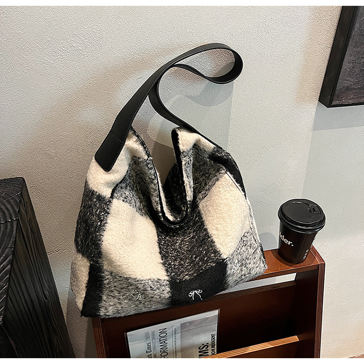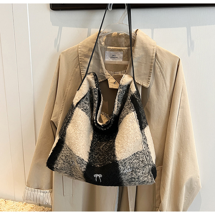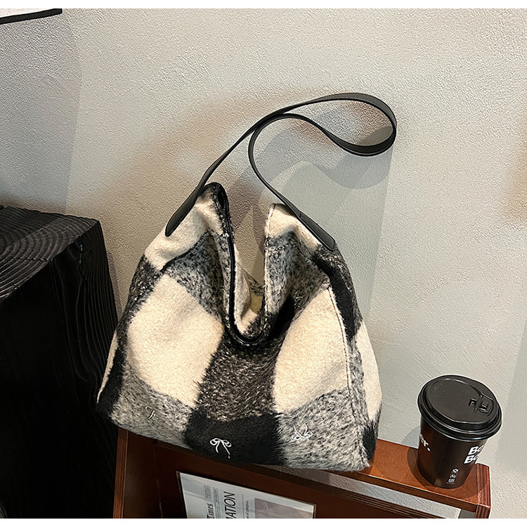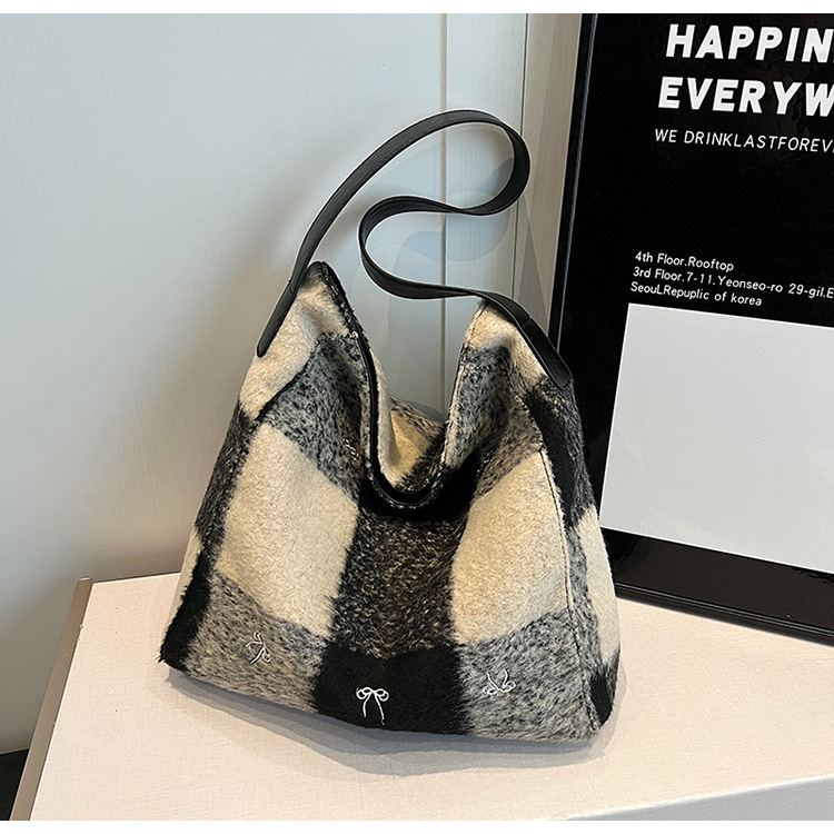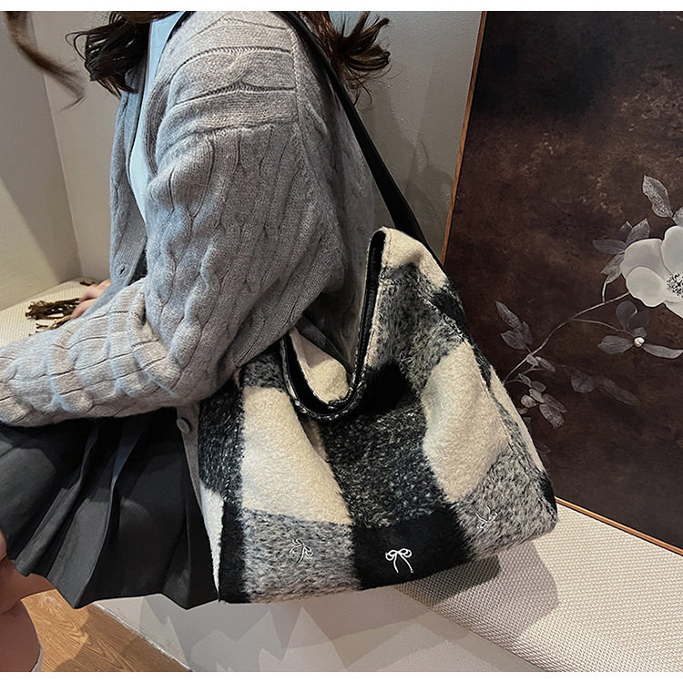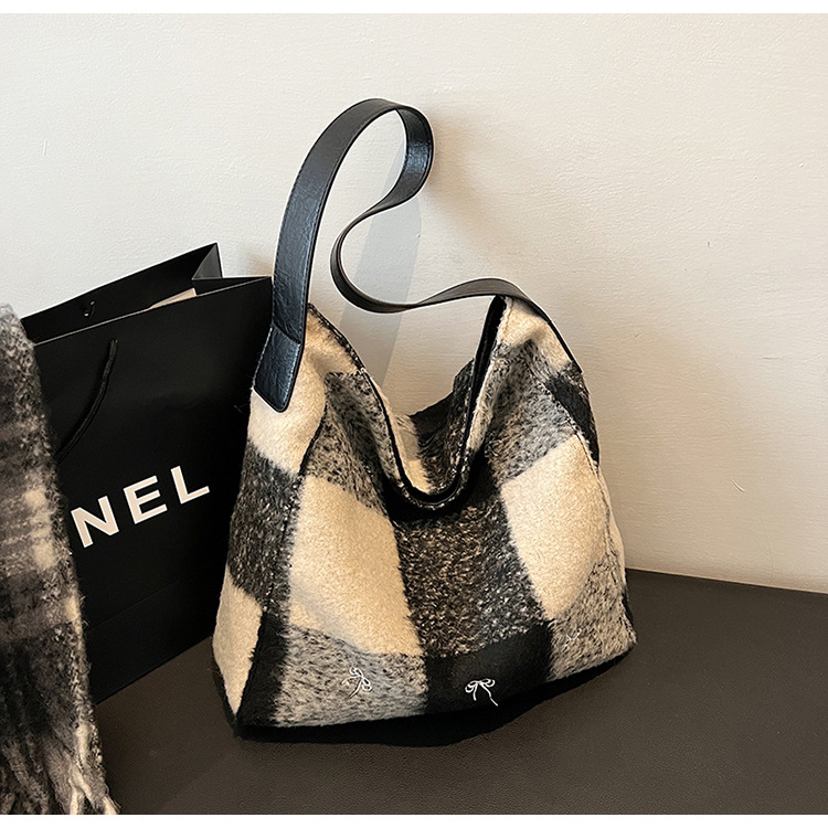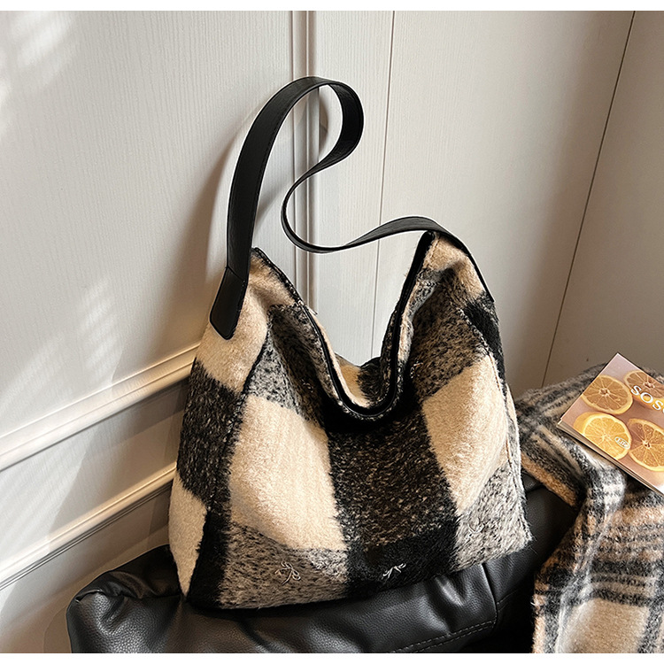 외부 싱글 울 대용량 가방 여성의 2024 가을 및 겨울 새 어깨 가방 빈티지 체크 통근 모든 매치용 버킷 가방스토어 가기