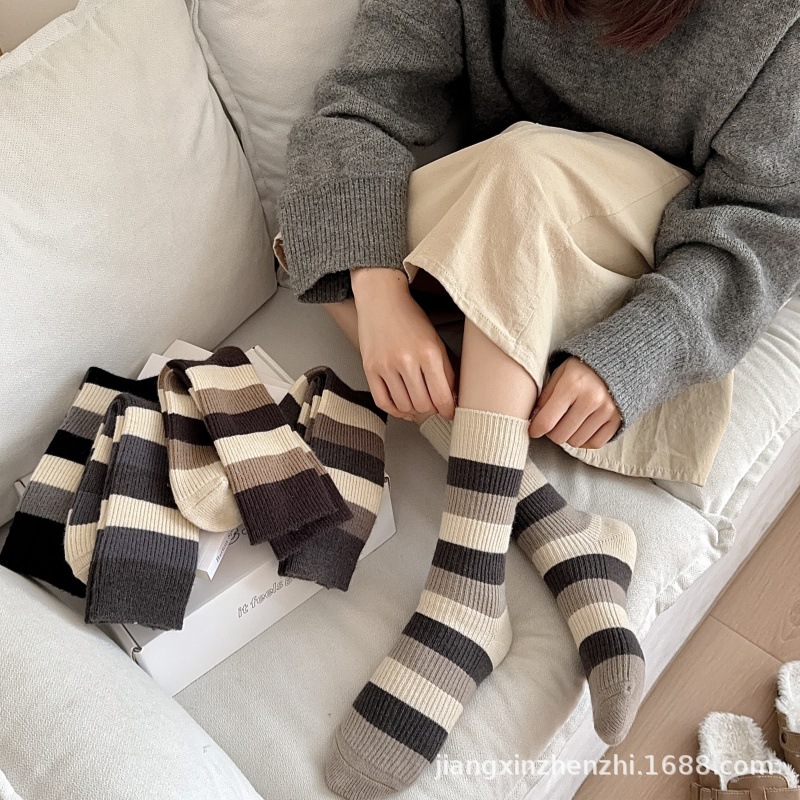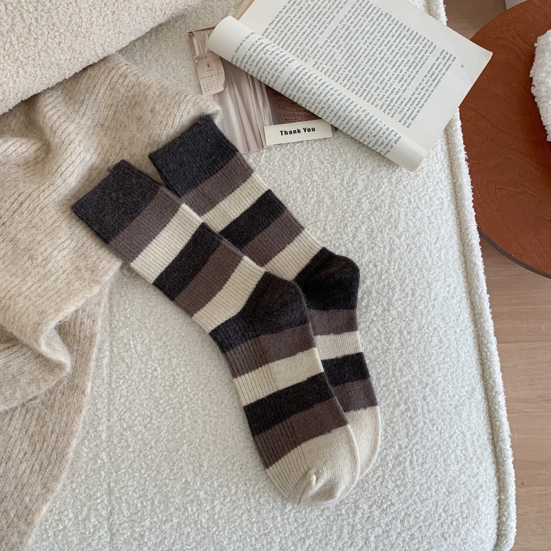 24년 와이드 스트라이프 모조 캐시미어 여성용 양말 가을 겨울 메일라드 아카데미 여성용 종아리 중간 양말 복고풍 스트라이프 캐주얼 양말스토어 가기