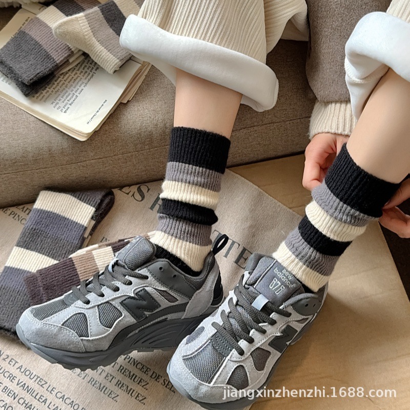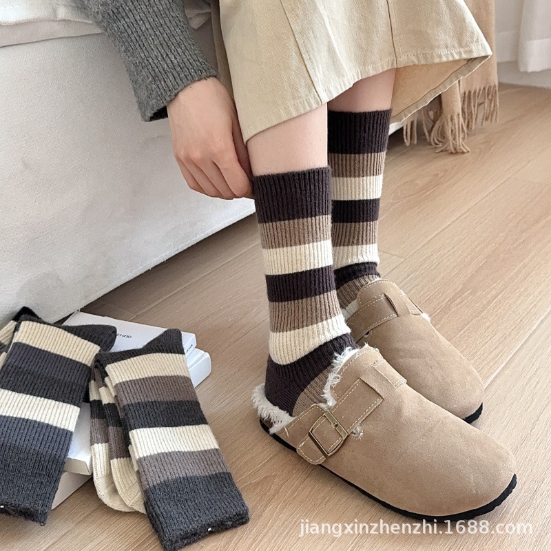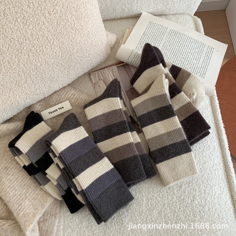 24년 와이드 스트라이프 모조 캐시미어 여성용 양말 가을 겨울 메일라드 아카데미 여성용 종아리 중간 양말 복고풍 스트라이프 캐주얼 양말