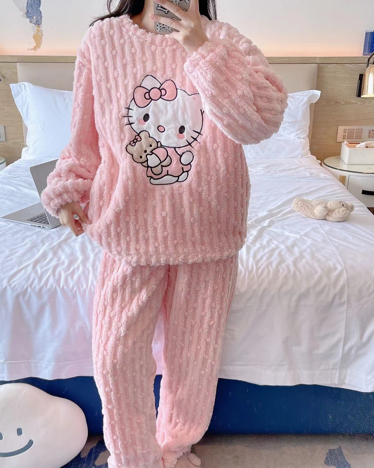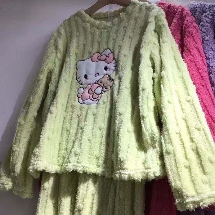 만화 귀여운 헬로 키티 산호 벨벳 잠옷 세트 달콤한 학생 소녀 간단한 라운드 넥 홈웨어 투피스 세트스토어 가기