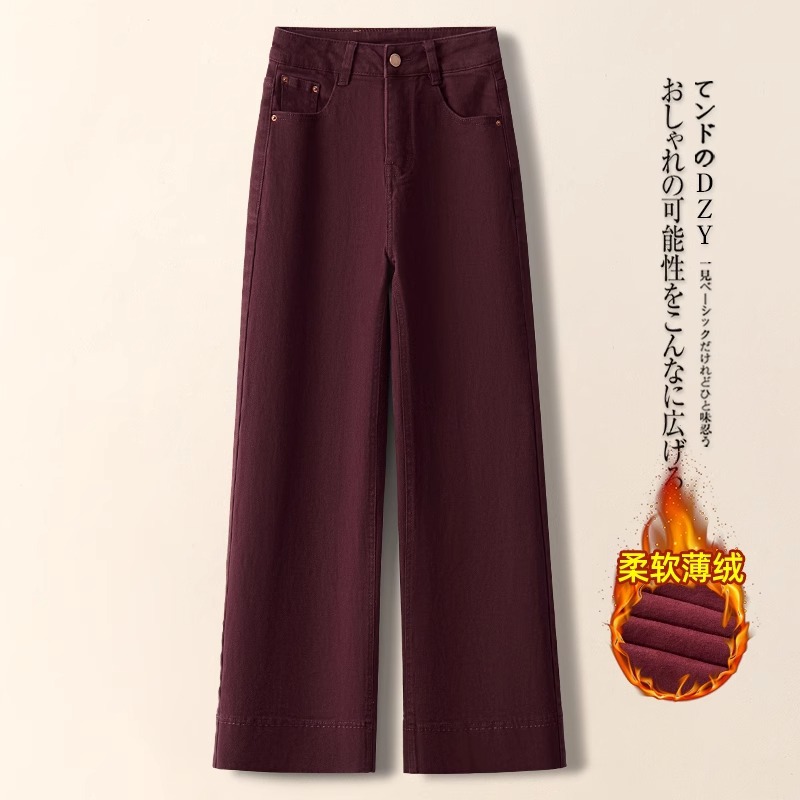 2025 하이웨이스트 루즈핏 플리스 안감 9부 스트레이트 팬츠 레트로 다크블루 와이드 데님 팬츠 여성 가을 겨울 출퇴근룩
