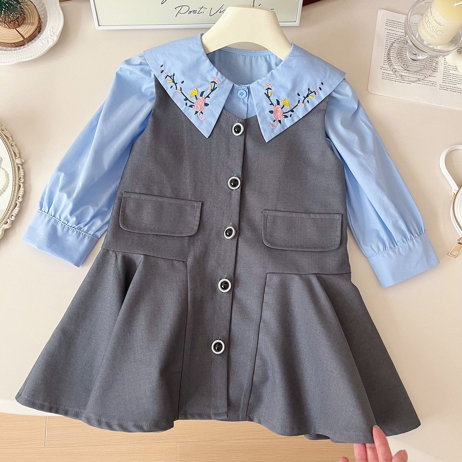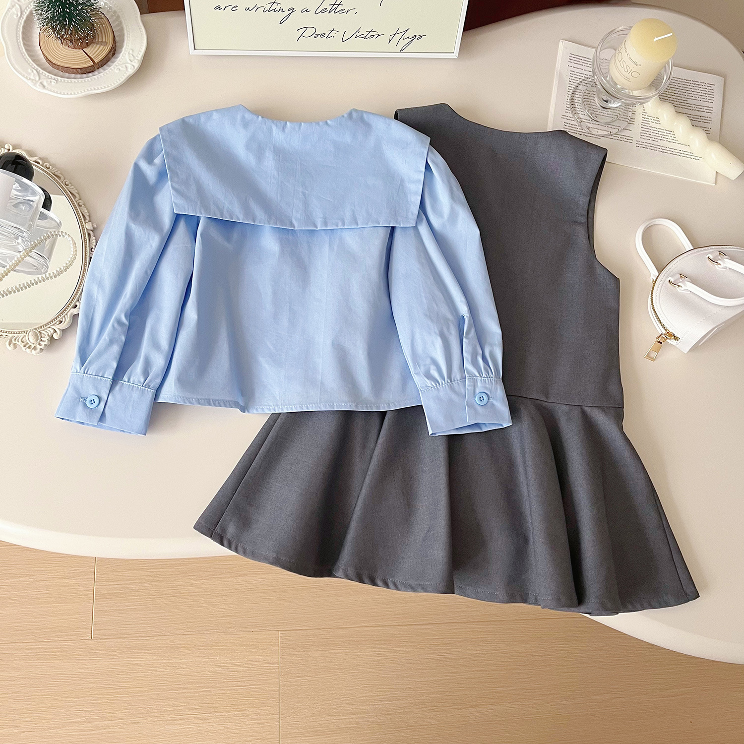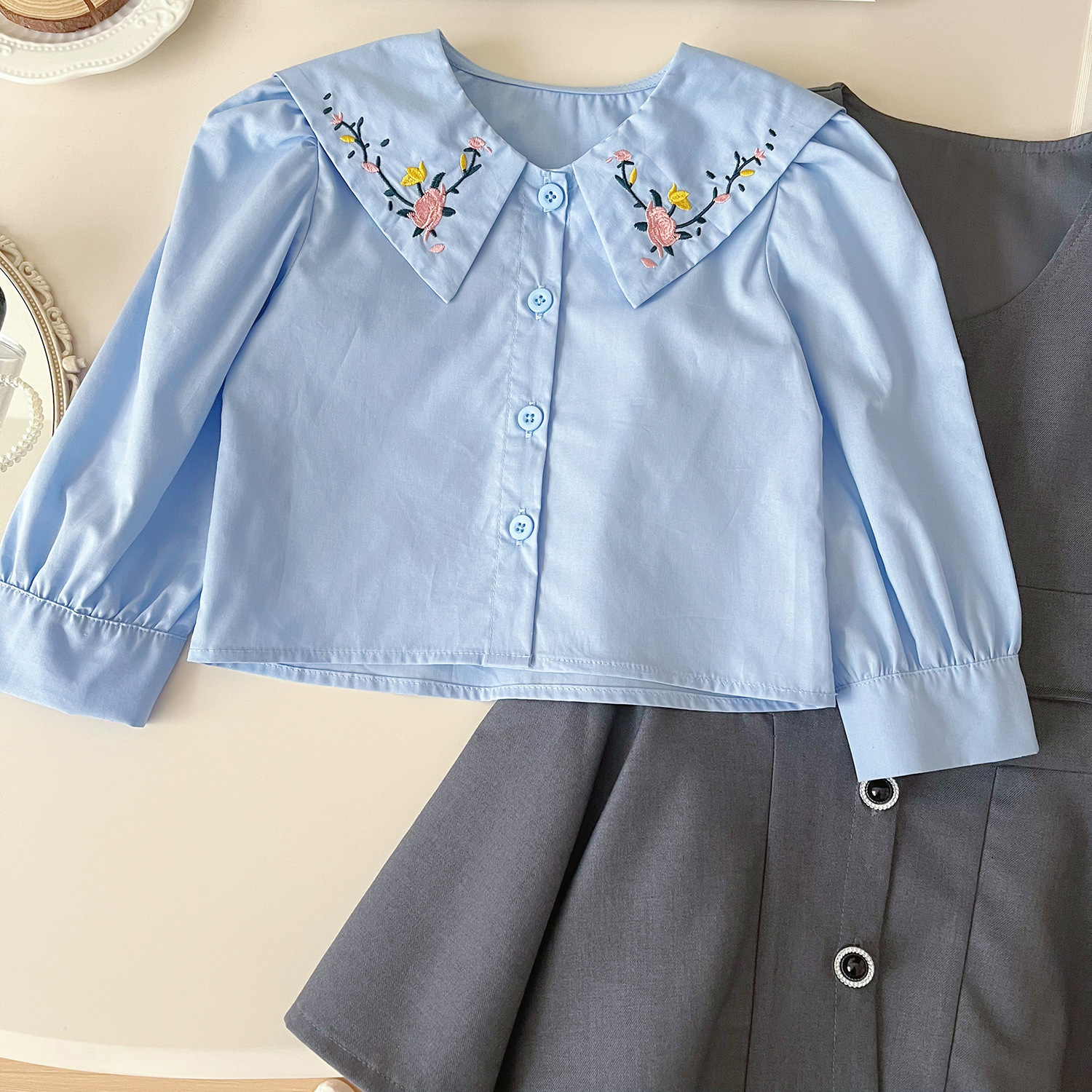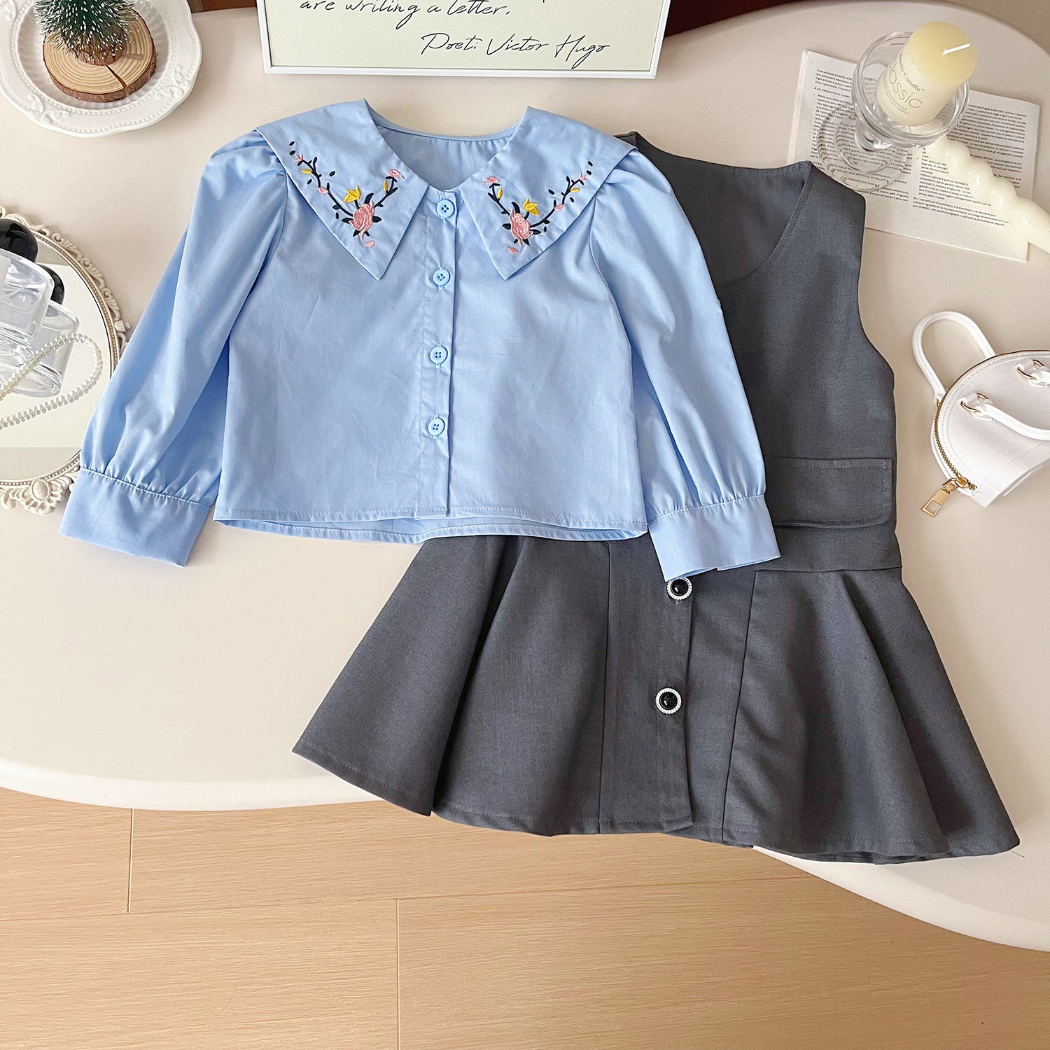 가을 2024 새로운 한국 여자 긴팔 옷깃 셔츠 조끼 스커트 투피스 아기 자수 칼라 도매스토어 가기