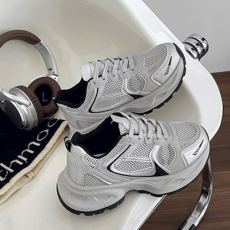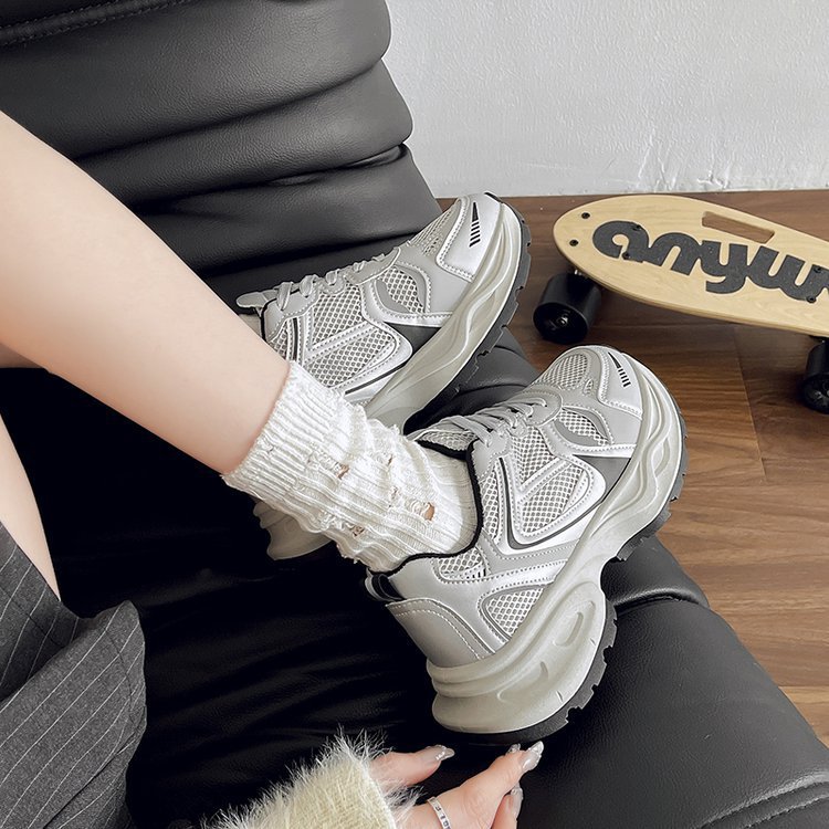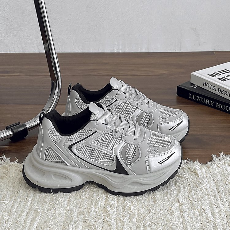 두꺼운 밑창 실버 신발 여성의 2024 봄 새로운 라운드 헤드 편안한 높이 올 매치 스포츠 캐주얼 스케이트 신발 아빠 신발스토어 가기