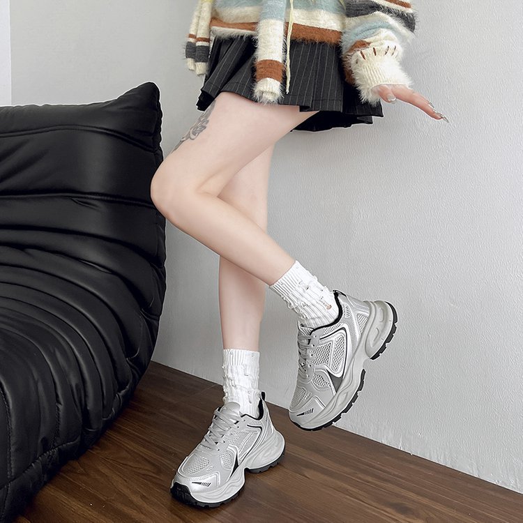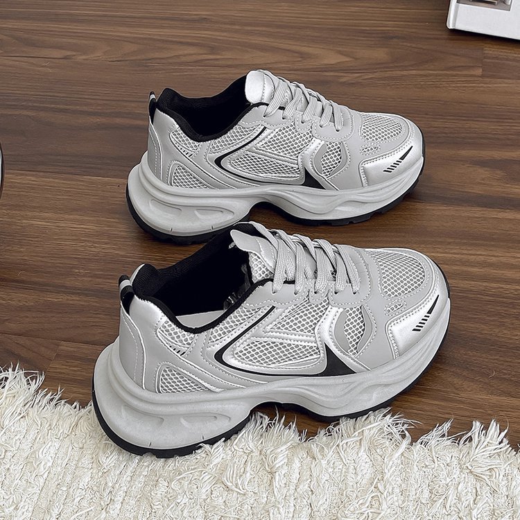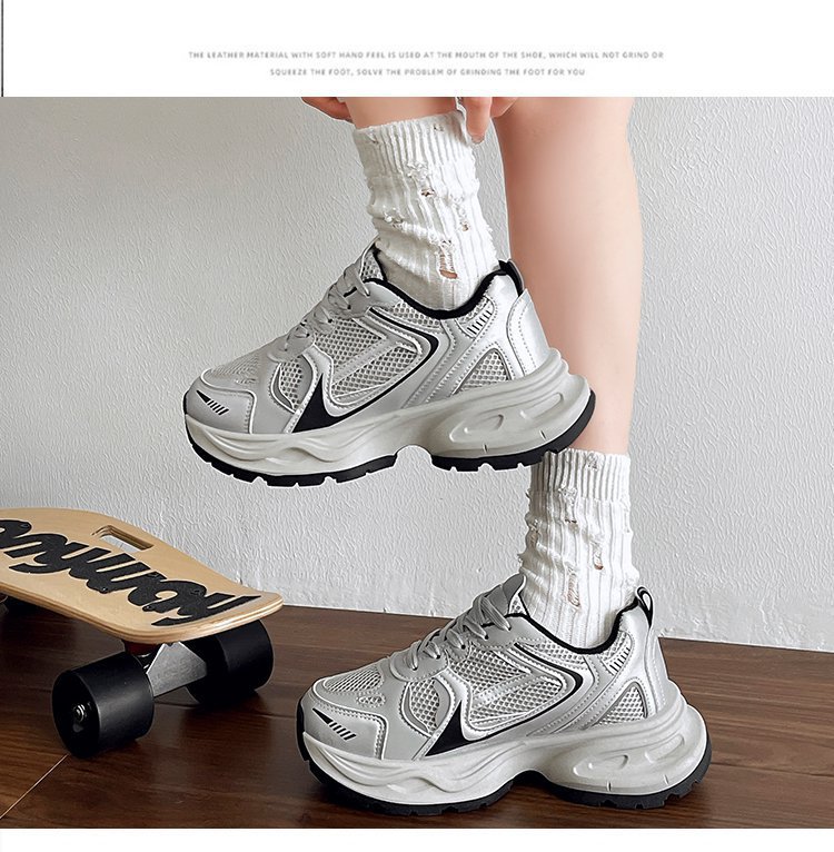 두꺼운 밑창 실버 신발 여성의 2024 봄 새로운 라운드 헤드 편안한 높이 올 매치 스포츠 캐주얼 스케이트 신발 아빠 신발