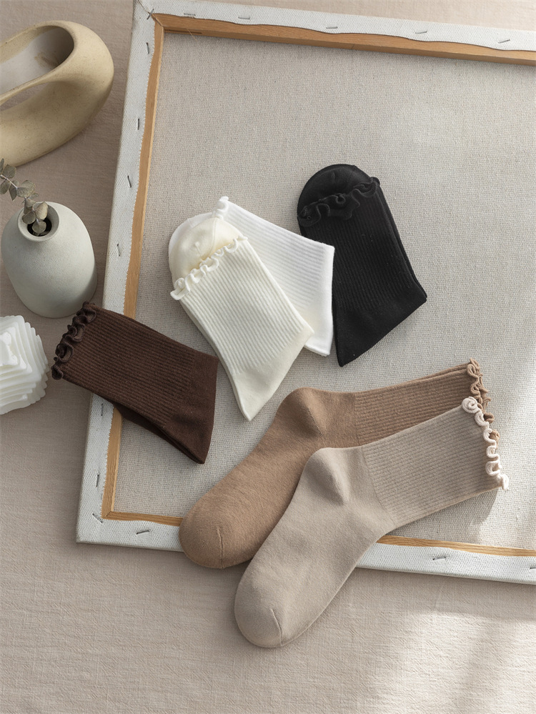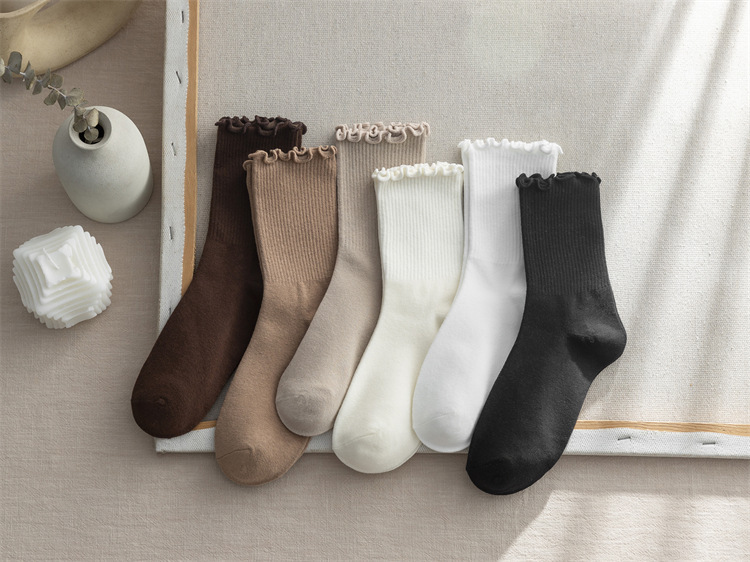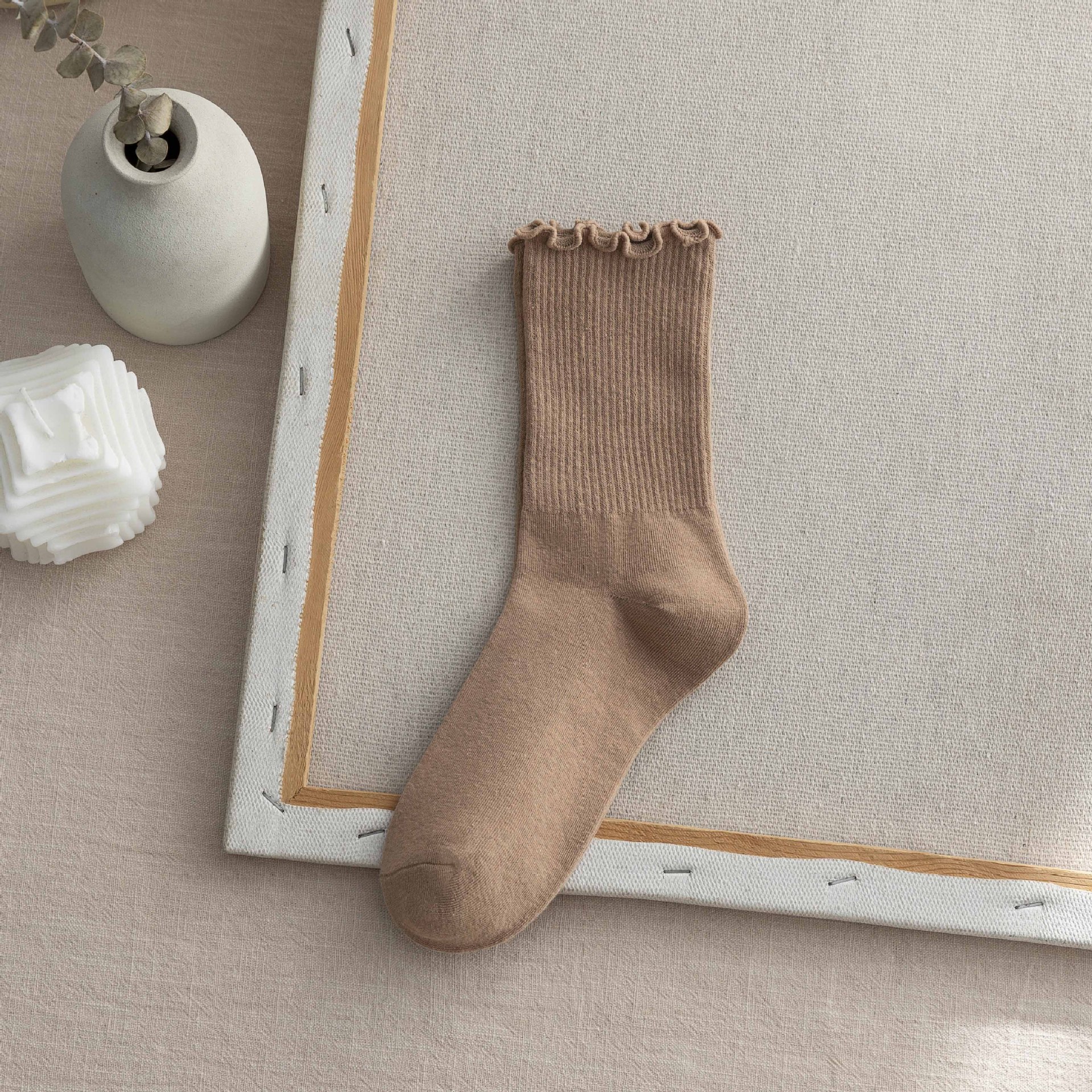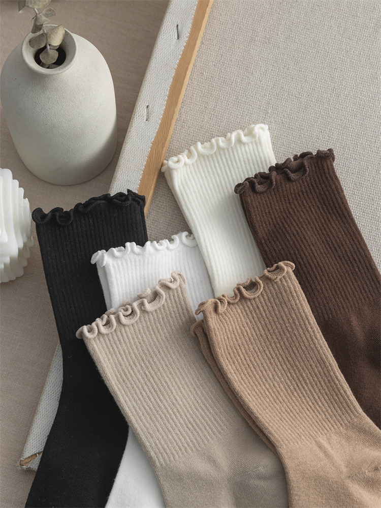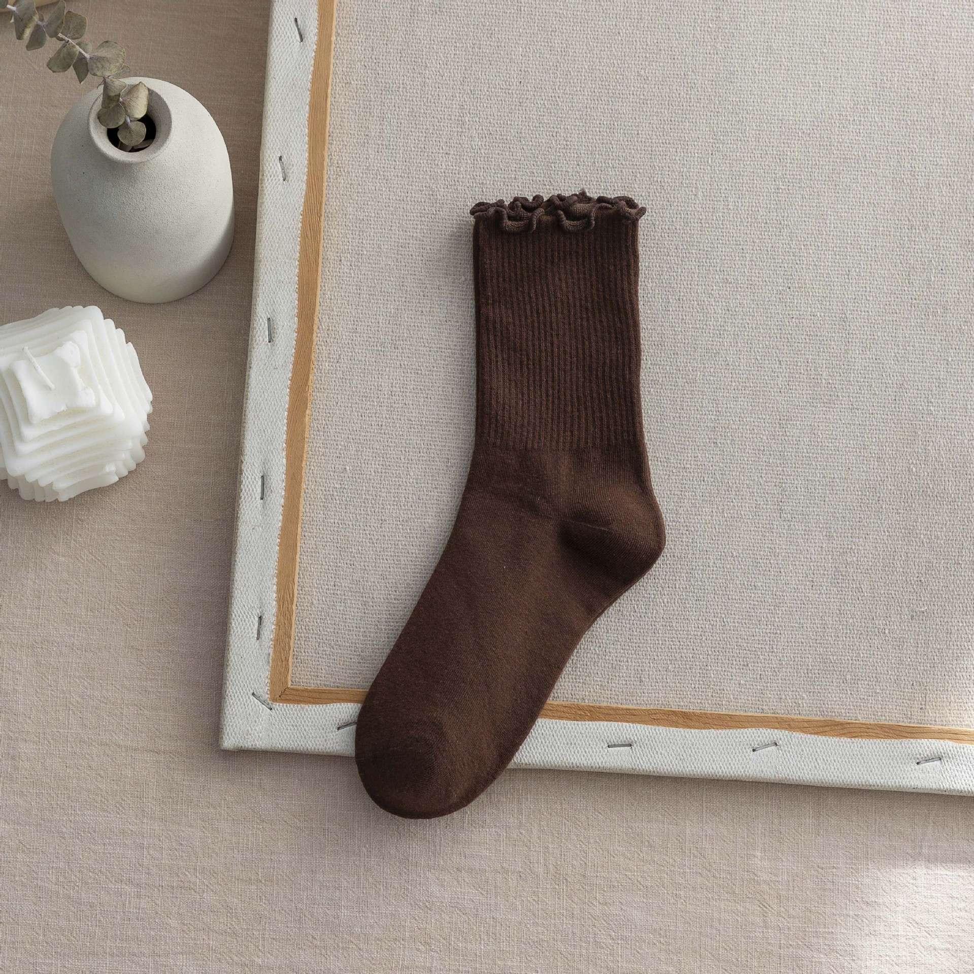 봄과 가을 면화 여성용 양말 다크 브라운 시리즈 수직 줄무늬 느슨한 중간 길이 양말 일본 JK 우드 이어 레이스 양말