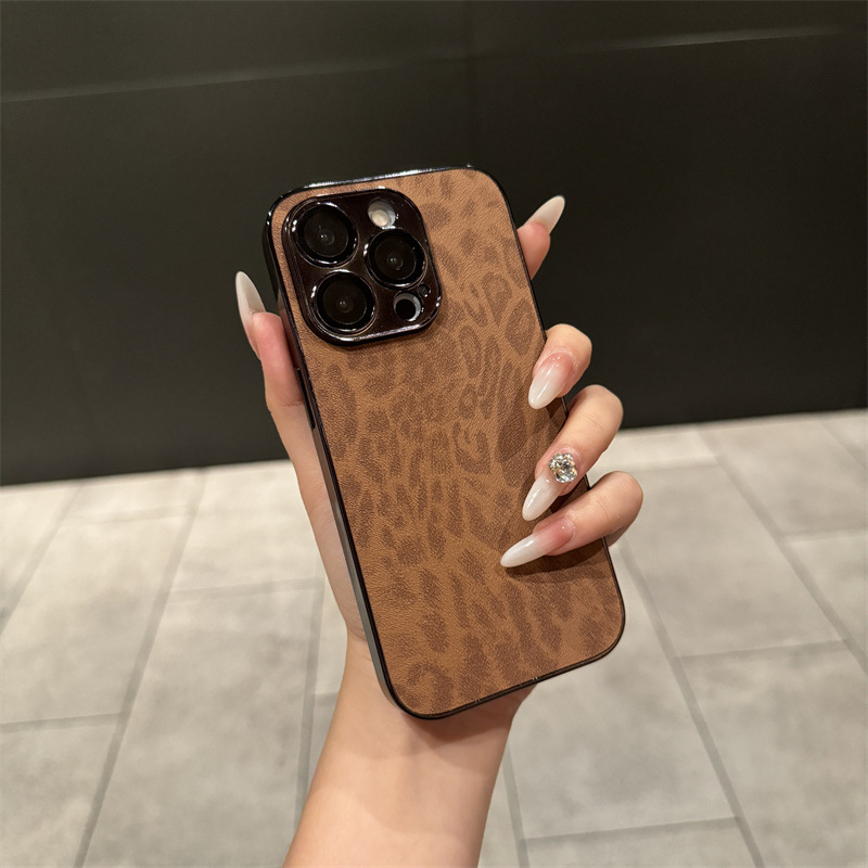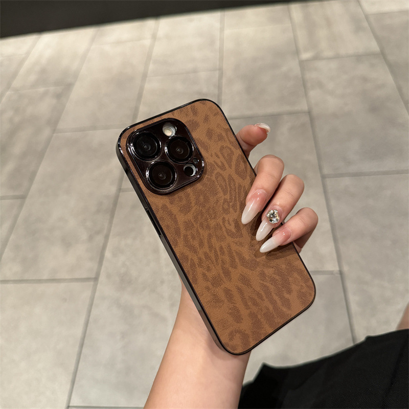 iPhone17Pro 휴대폰 케이스에 적합, 16pro 전기도금 가죽 표면 레오파드 패턴, Apple 15 전체 렌즈 보호 필름, 14pro스토어 가기
