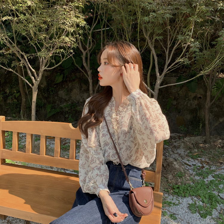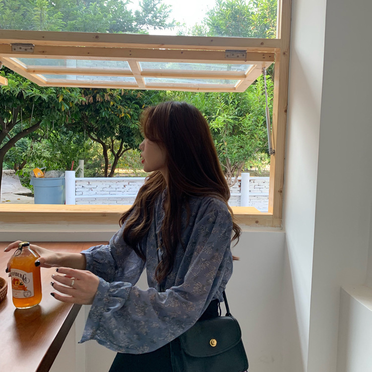 2024 새로운 스타일 셔츠 한국 스타일 서양식 부드러운 스타일 꽃 쉬폰 셔츠 여성용 긴 소매베이스 셔츠 퍼프 슬리브 탑스토어 가기