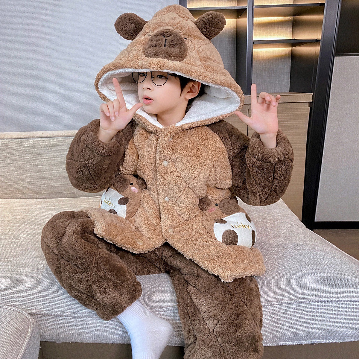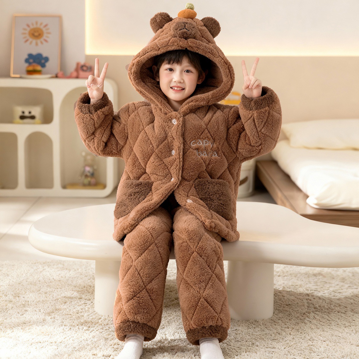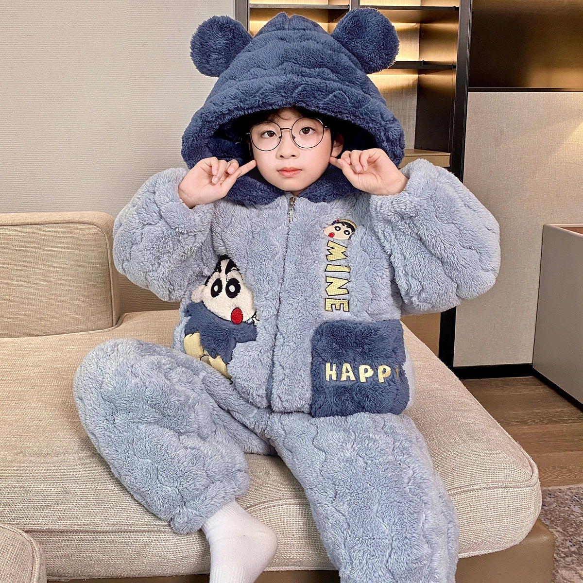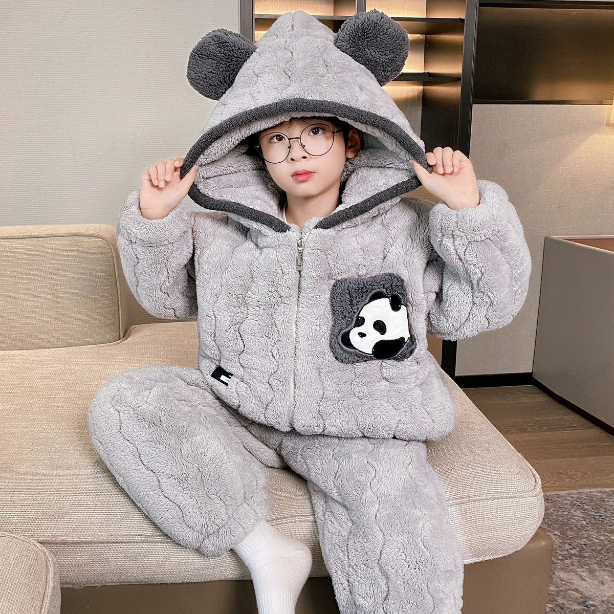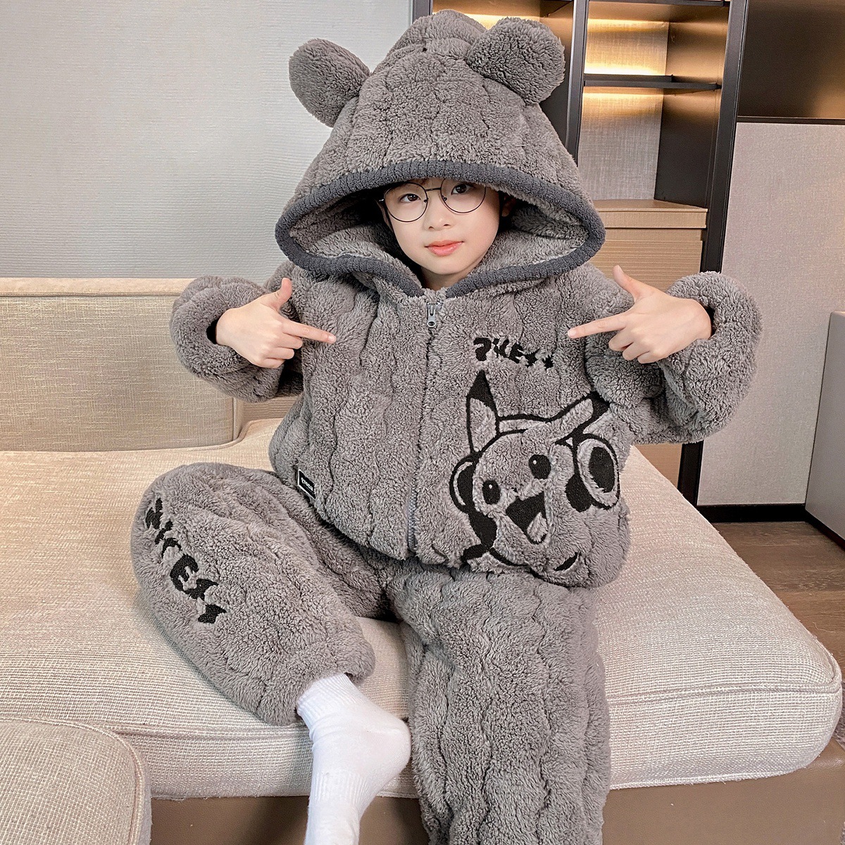 3 층 면화 기모 두꺼운 산호 양털 소년 겨울 새로운 대형 어린이 가정 옷 세트 두꺼운 후드 12스토어 가기