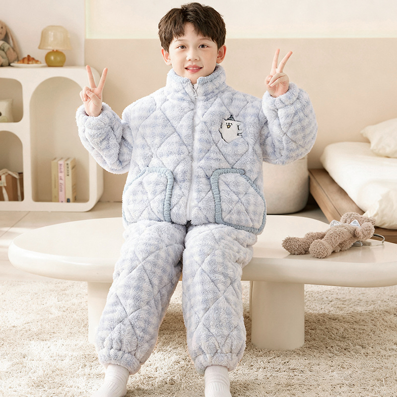 男童冬季新款三层夹棉加绒加厚中大童家居服套装