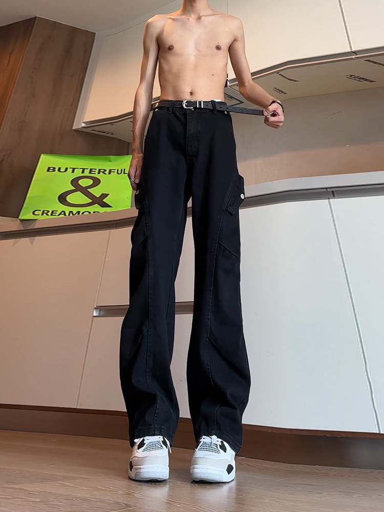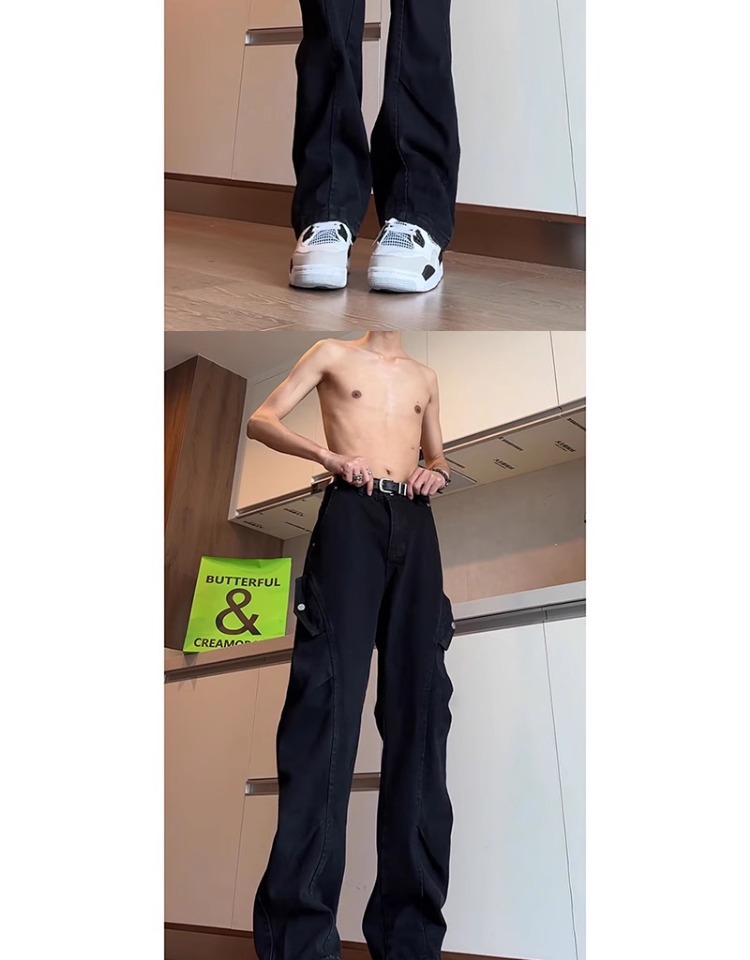 블랙 툴링 청바지 남자의 봄과 가을 강아지 잘 생긴 고급 마체테 바지 디자인 바느질 스트레이트 바지