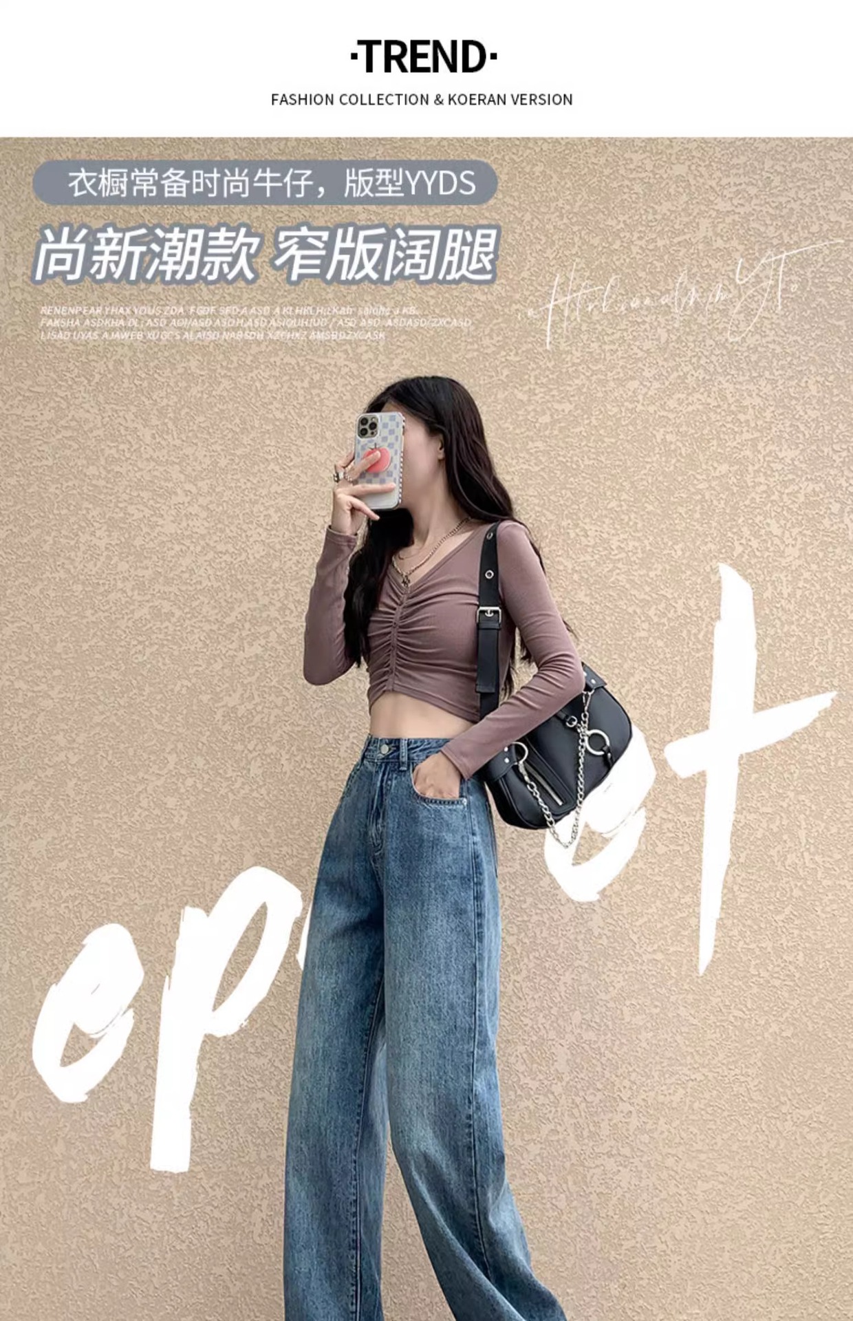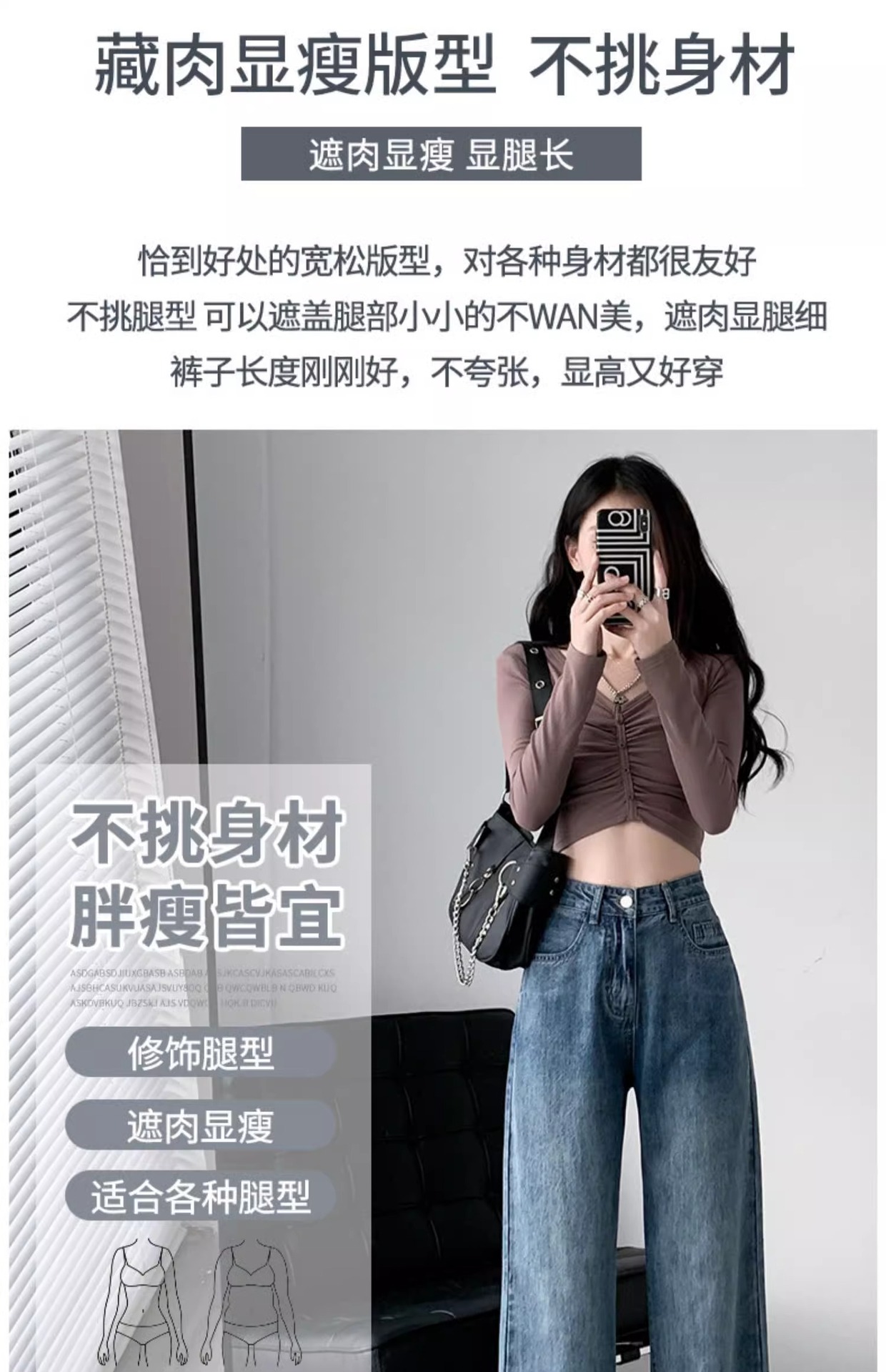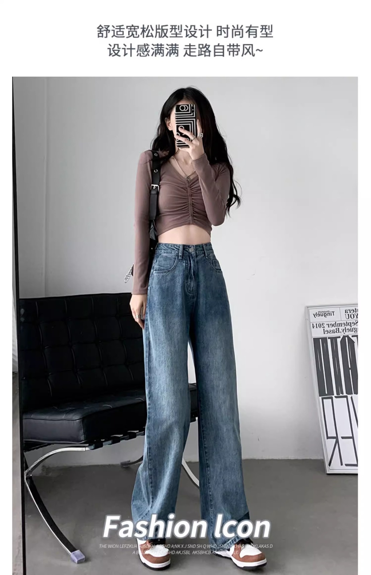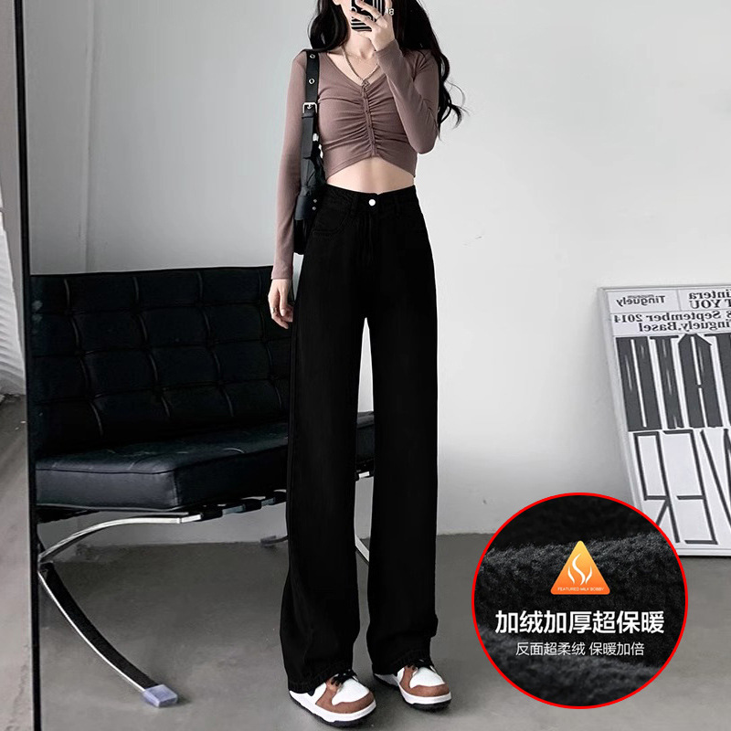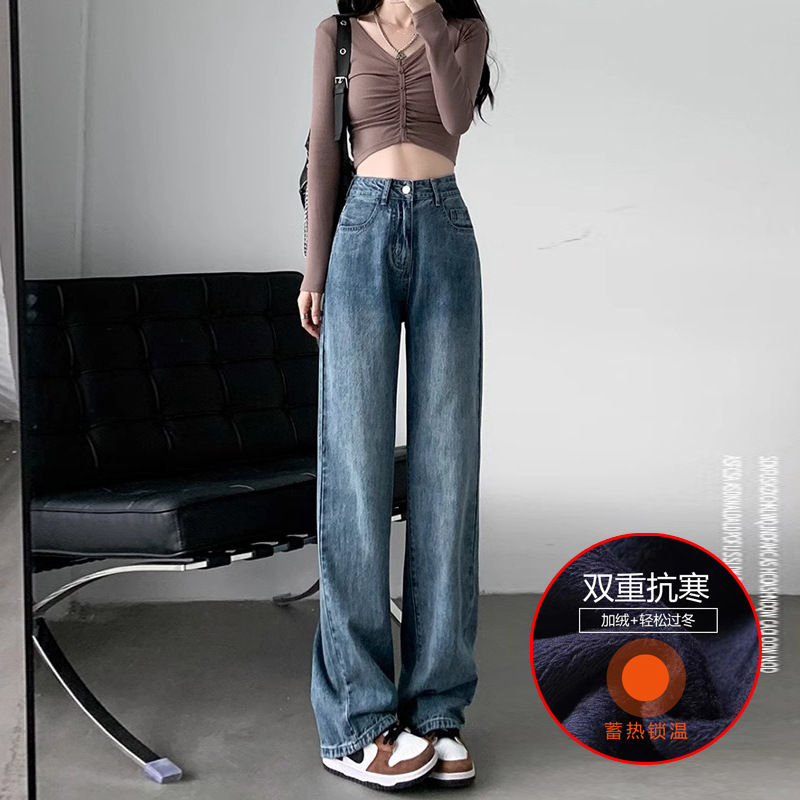 2024 겨울 새로운 빈티지 기모 넓은 다리 청바지 여성용 플립 헤드 하이 허리 스트레이트 바지스토어 가기
