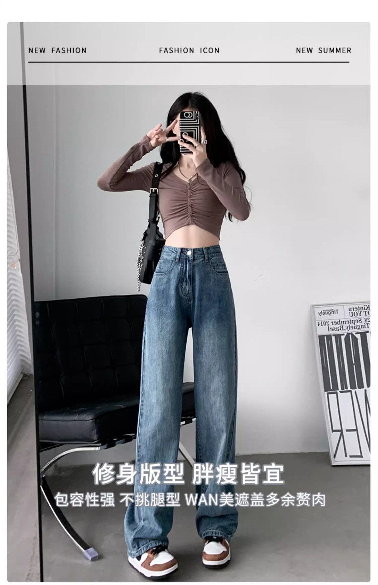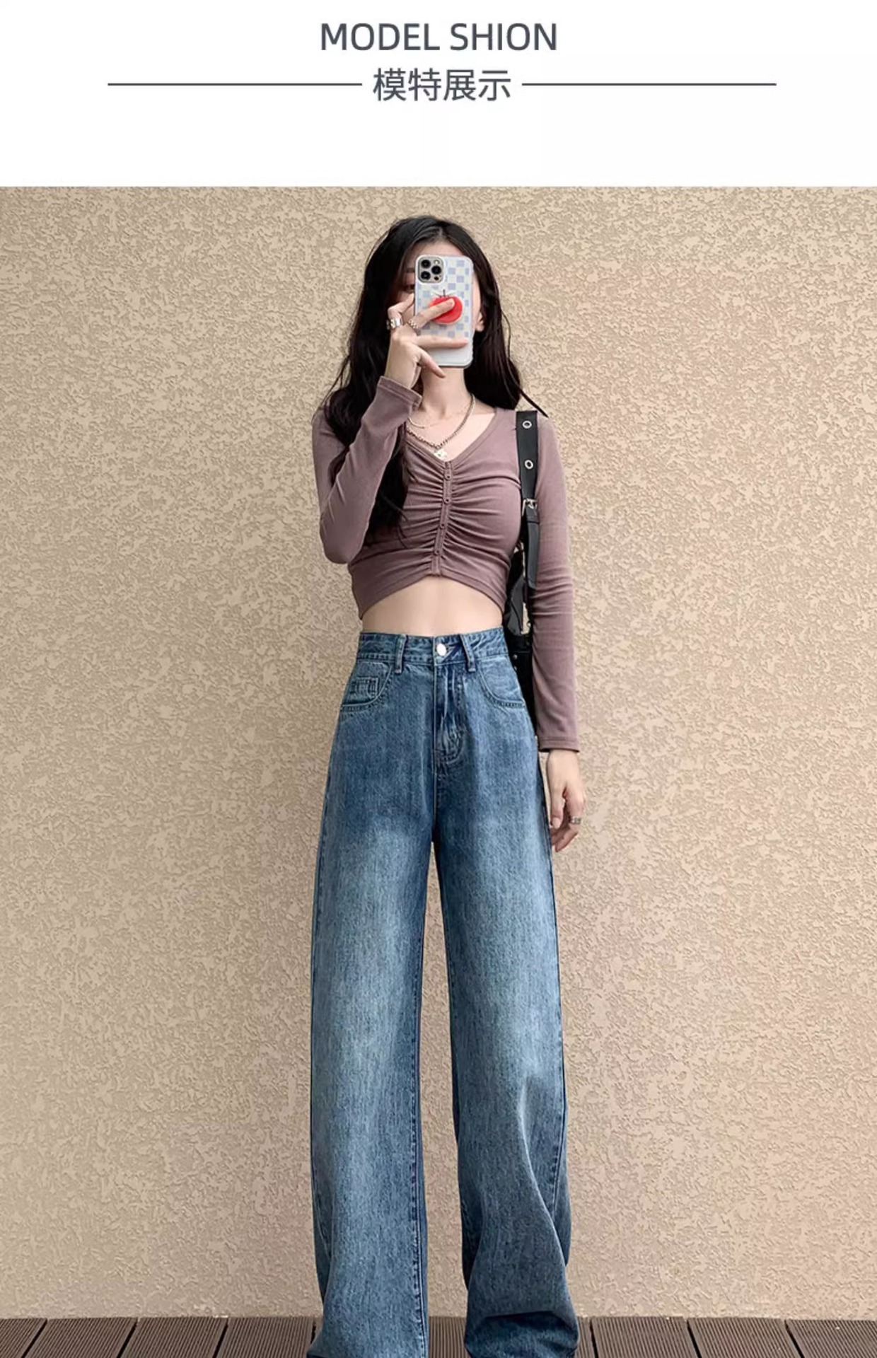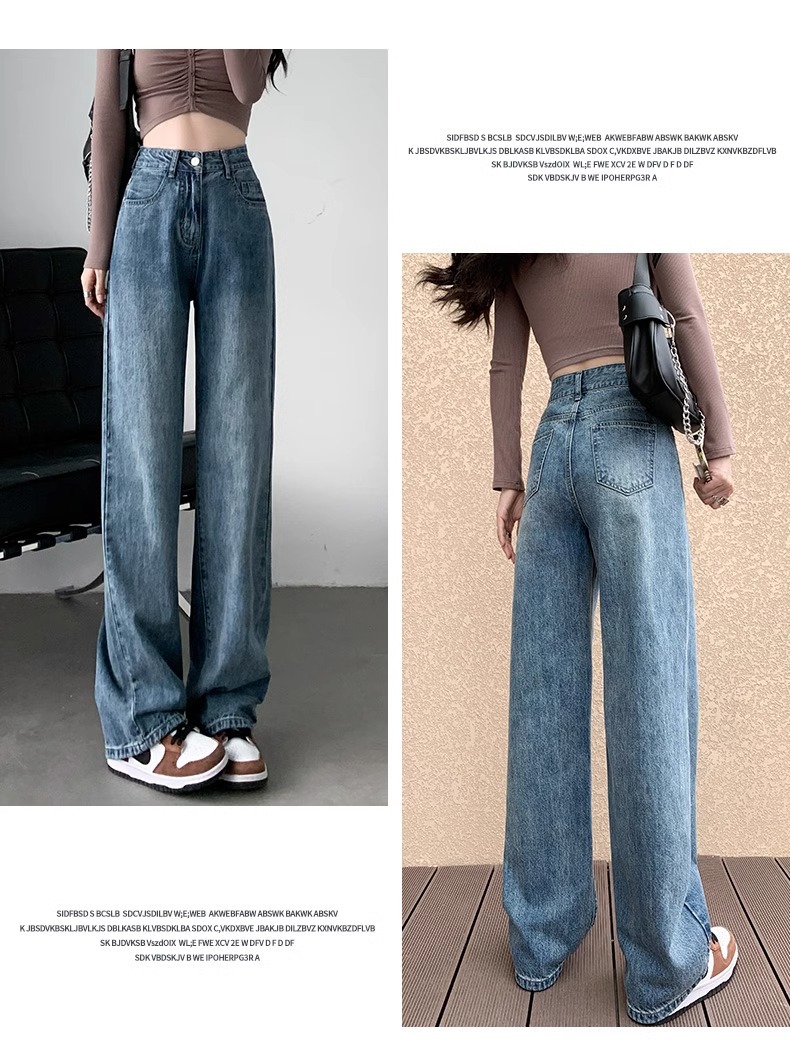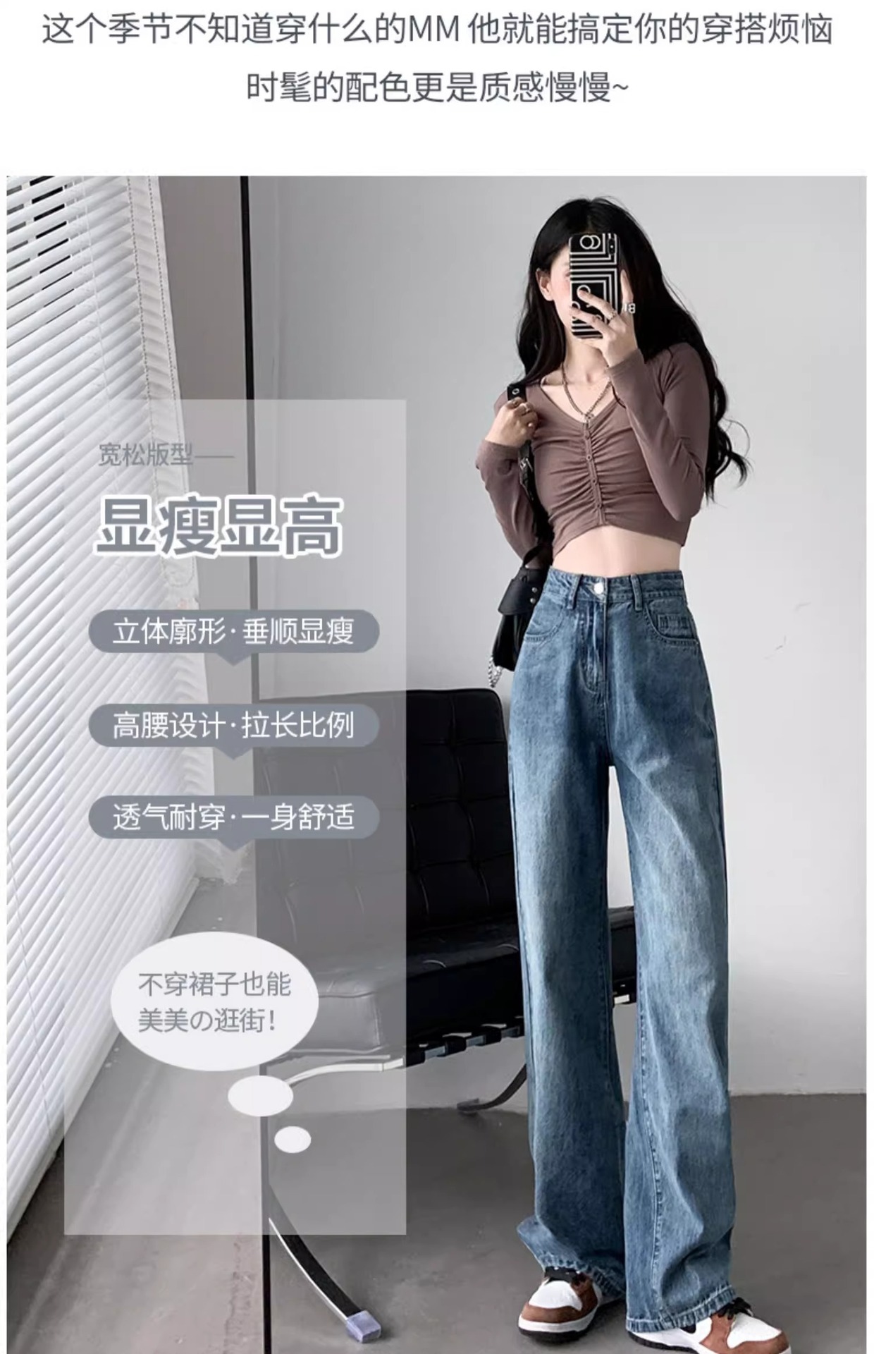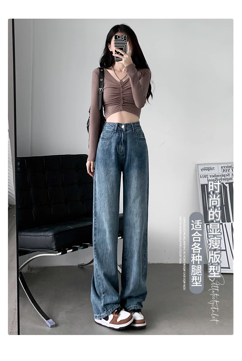 2024 겨울 새로운 빈티지 기모 넓은 다리 청바지 여성용 플립 헤드 하이 허리 스트레이트 바지스토어 가기