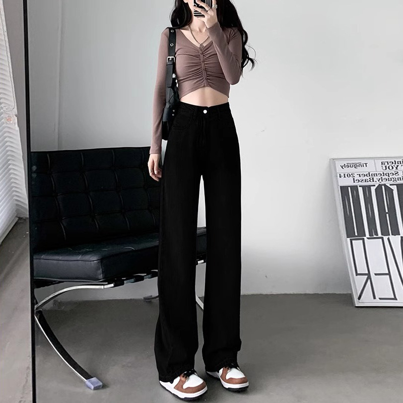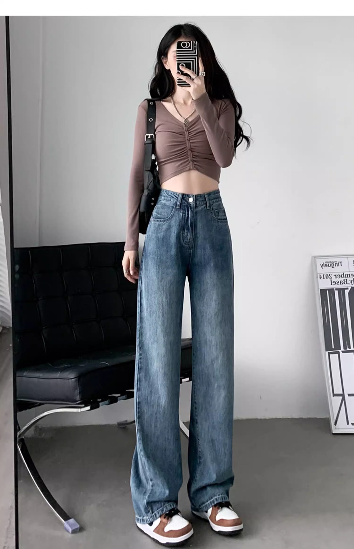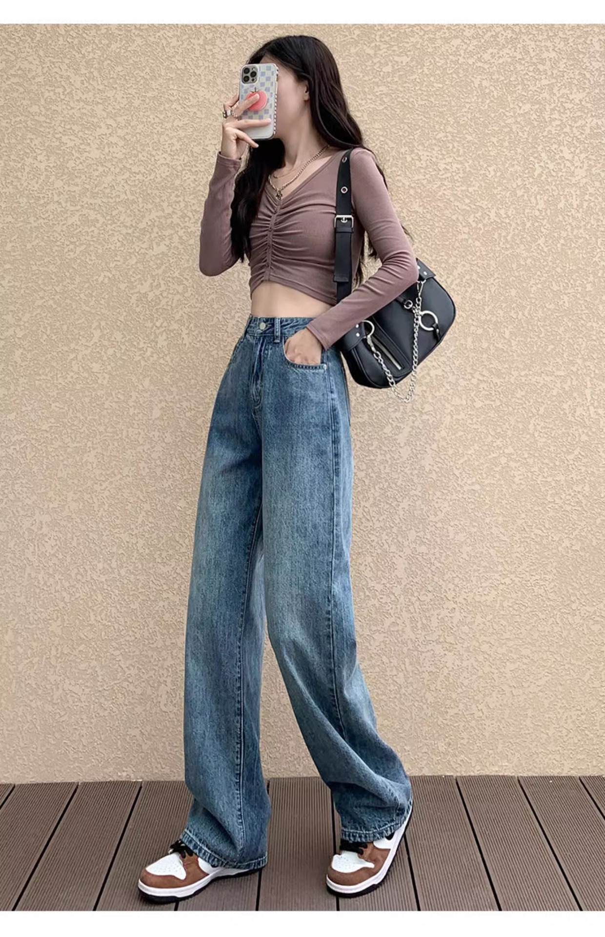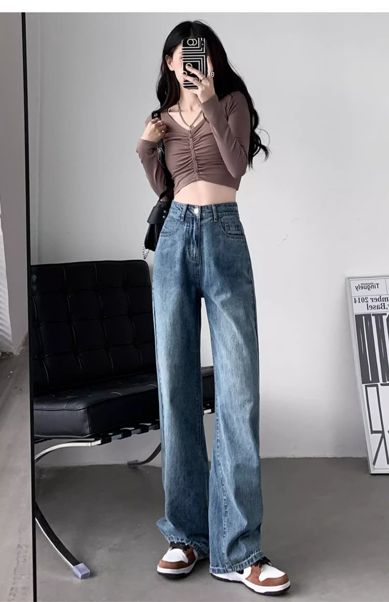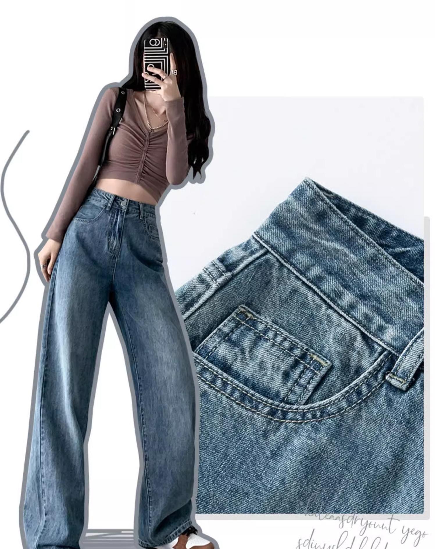 2024 겨울 새로운 빈티지 기모 넓은 다리 청바지 여성용 플립 헤드 하이 허리 스트레이트 바지스토어 가기