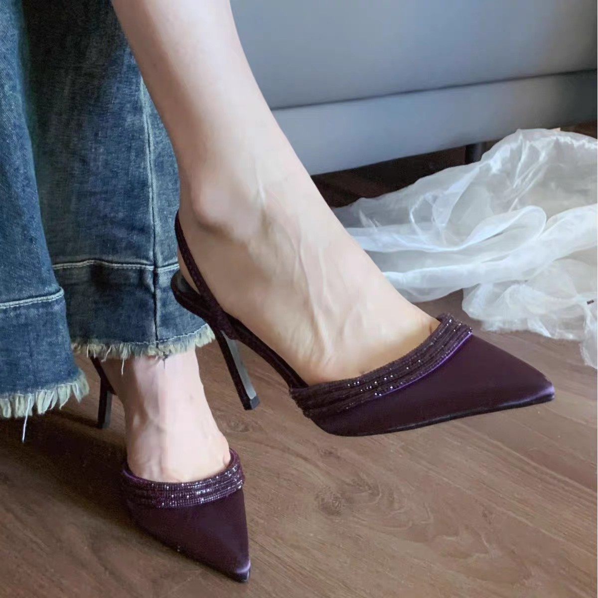 가을 2024 년 새 뾰족한 보라색 얇은 힐 하이힐 얕은 입 라인스톤 원-얕은 새틴 샌들 여성용 반 슬리퍼스토어 가기