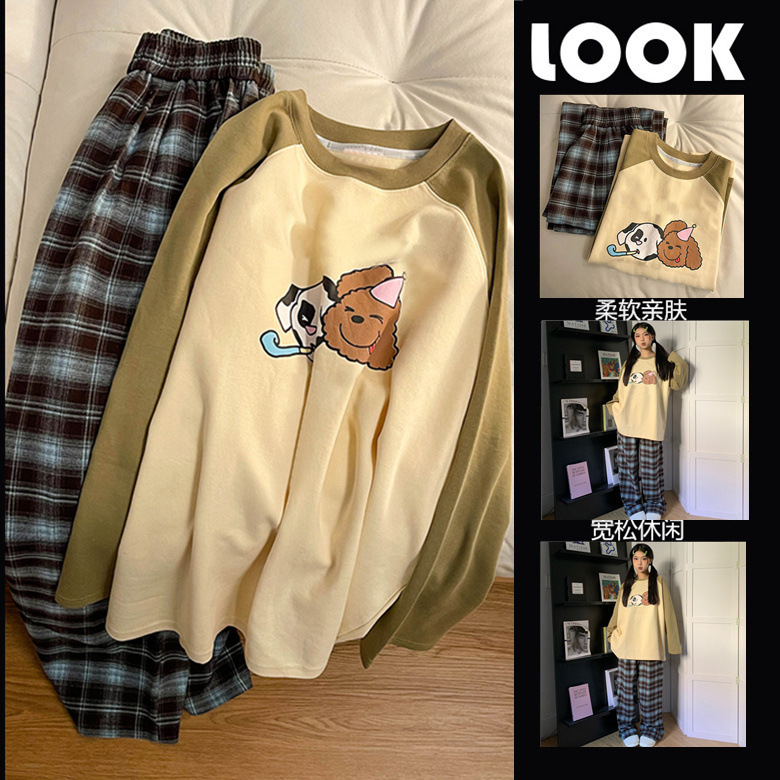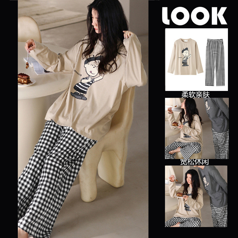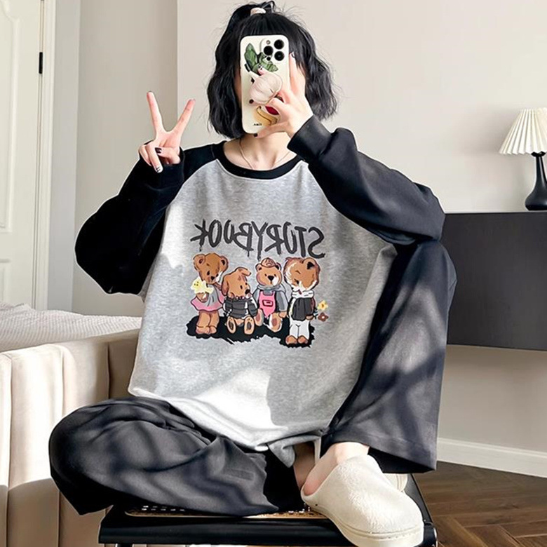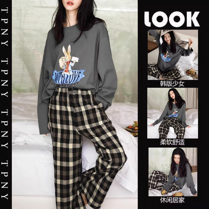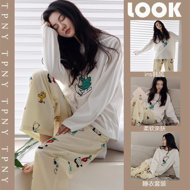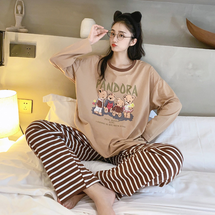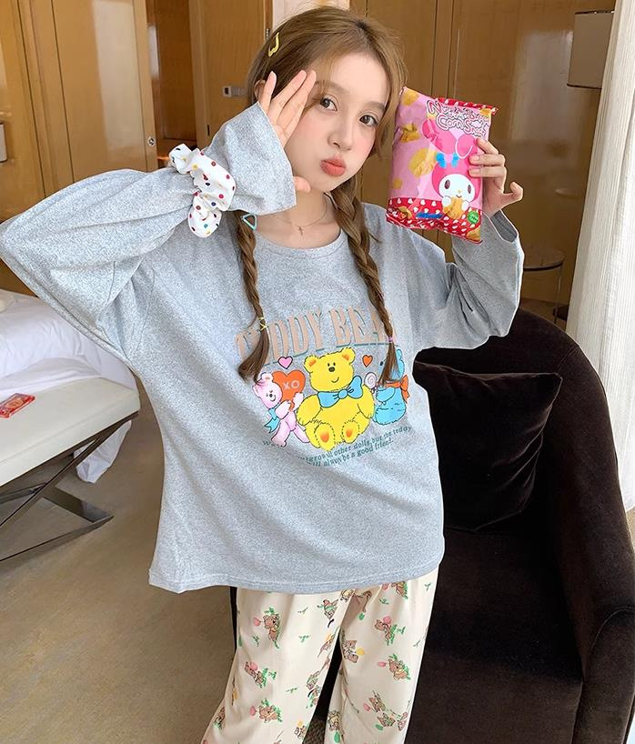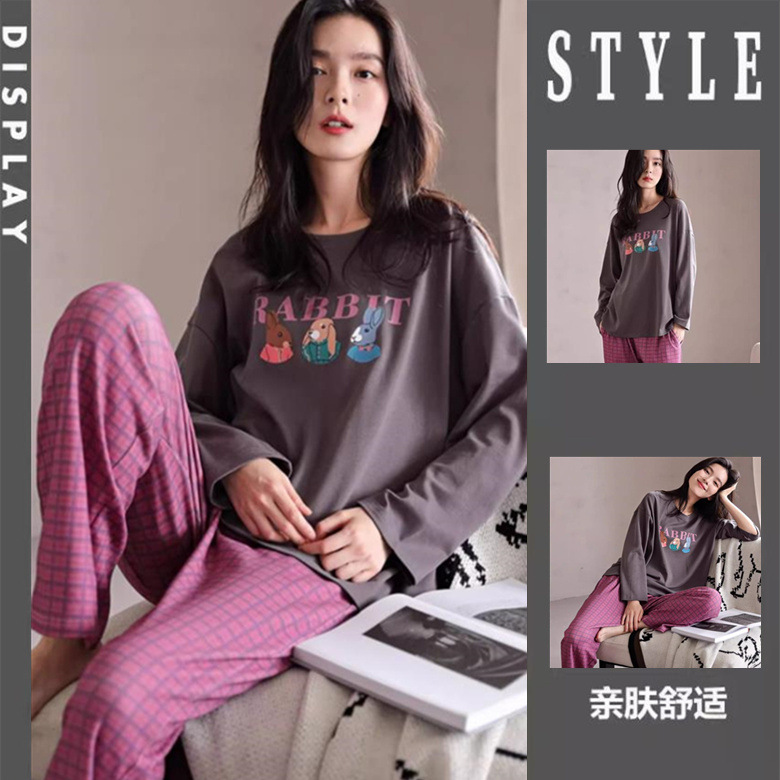 인즈 스타일 파자마 여성용 긴팔 바지 한국 스타일 봄과 가을 달콤한 잠옷 느슨한 홈 의류 세트 대외 무역 국경스토어 가기