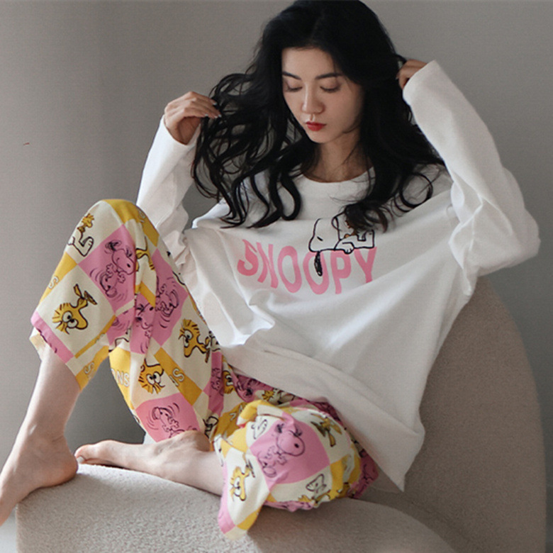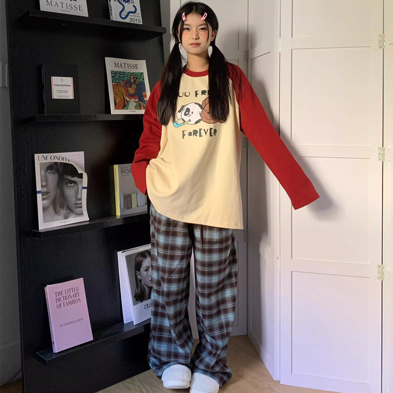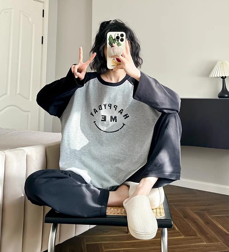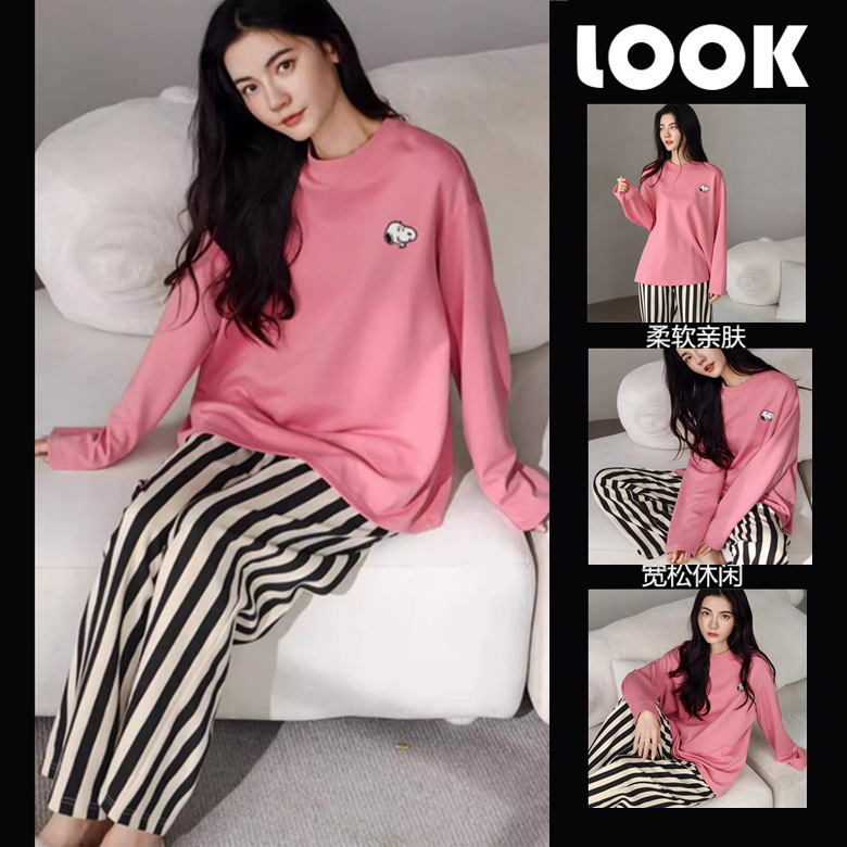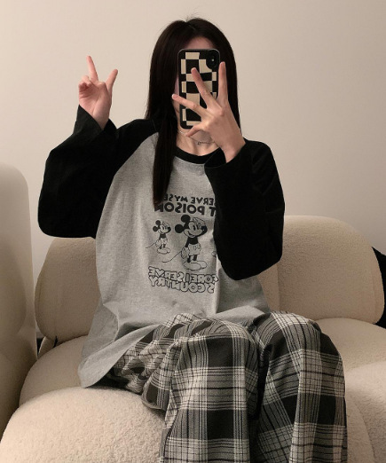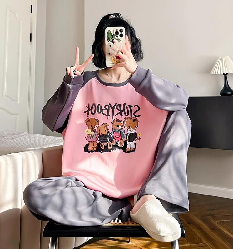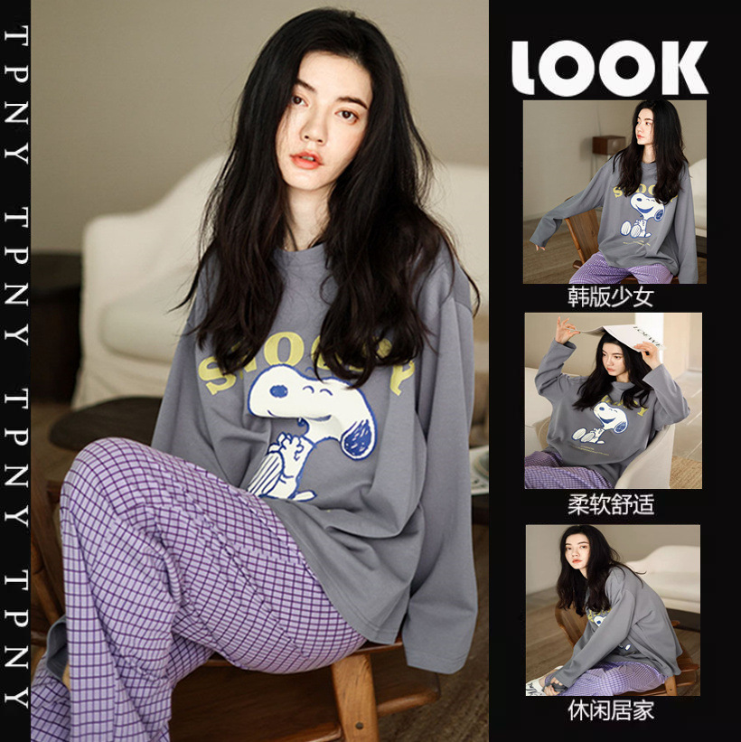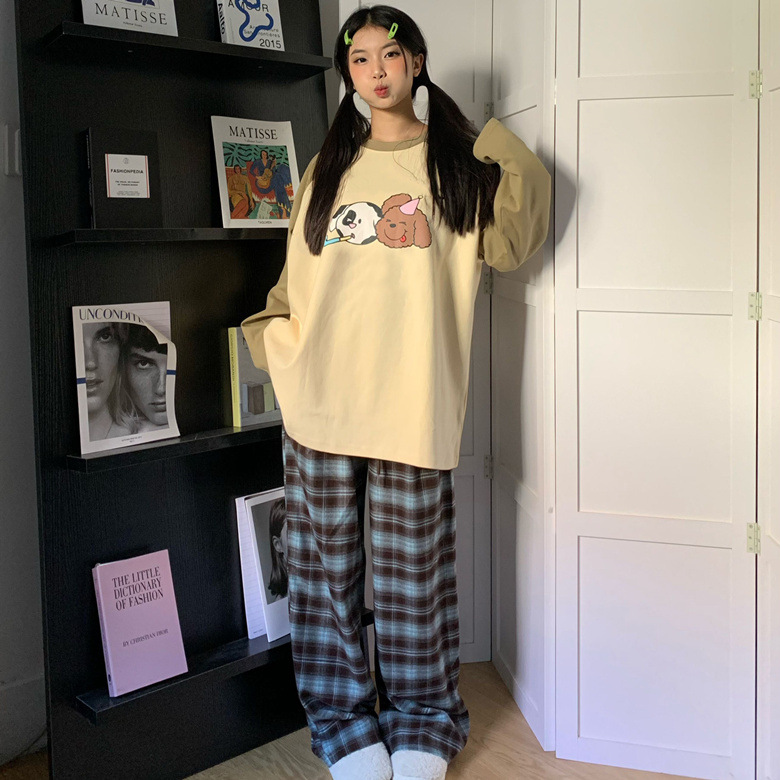 인즈 스타일 파자마 여성용 긴팔 바지 한국 스타일 봄과 가을 달콤한 잠옷 느슨한 홈 의류 세트 대외 무역 국경스토어 가기