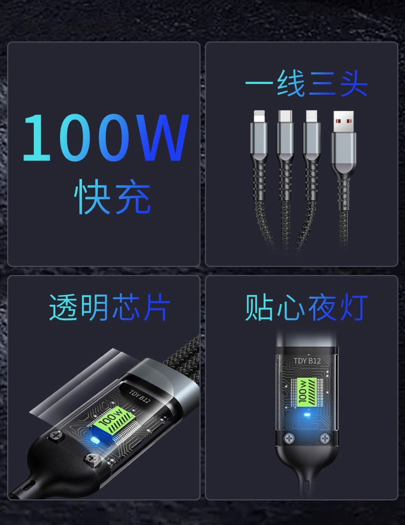 【产品亮点】:一线三头设计,硅胶加粗手感更好,耐拉伸,防缠绕,智能涓流,Type-c接口支持数据传输