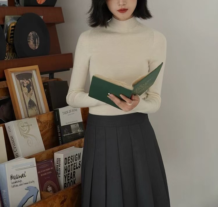 독일 원사 울 원피스 니트 베이스 셔츠 여성용 하프 터틀넥 스웨터 미드 칼라 슬림 핏 이너 탑스토어 가기