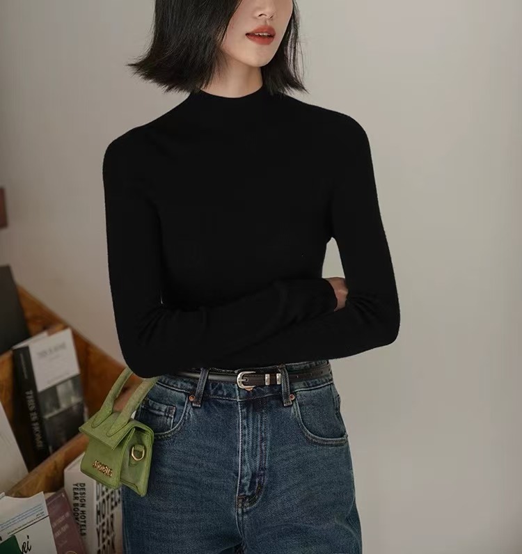 독일 원사 울 원피스 니트 베이스 셔츠 여성용 하프 터틀넥 스웨터 미드 칼라 슬림 핏 이너 탑