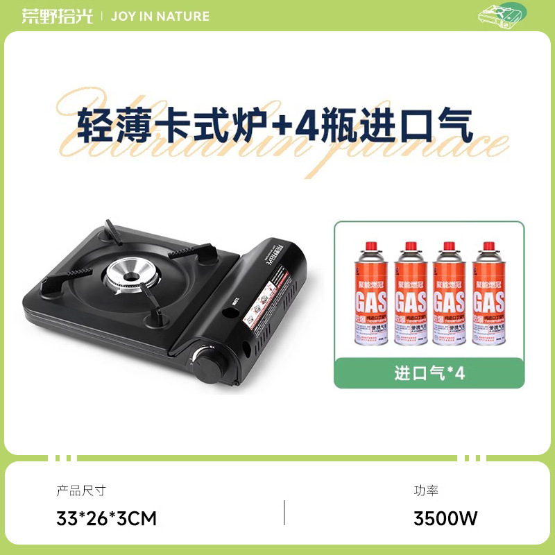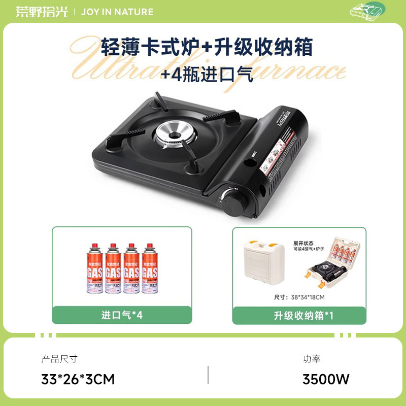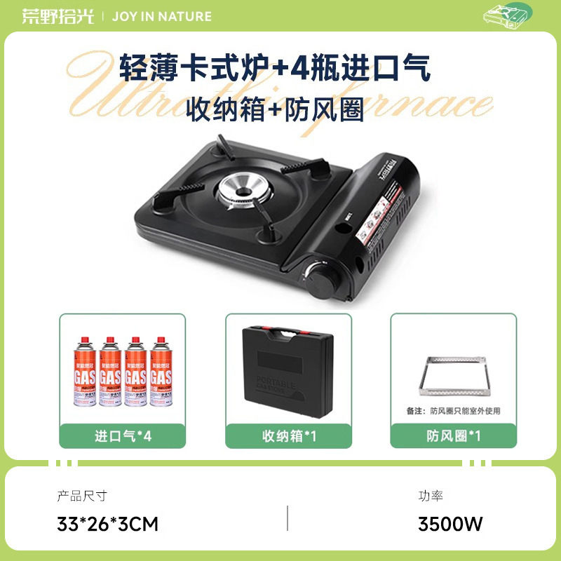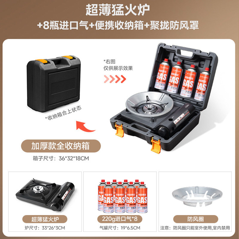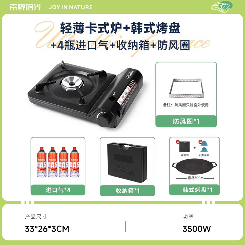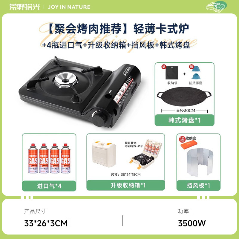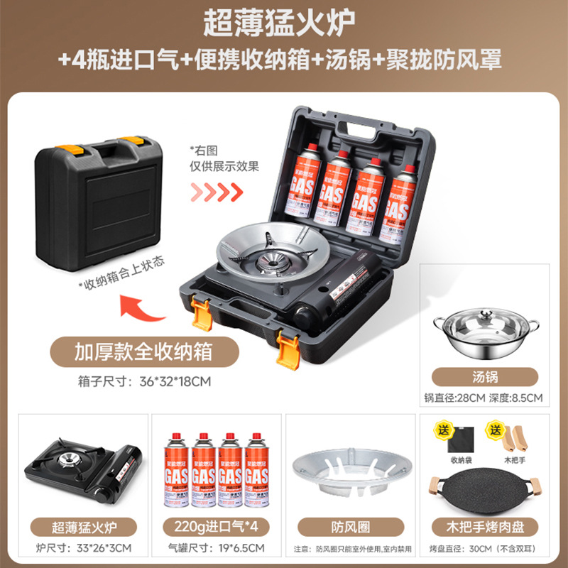 • [인기 판매 모델] 검정색 경량 카세트 스토브 + 가스 탱크 4개 + 보관 상자 + 방풍 링 + 한국식 베이킹 팬