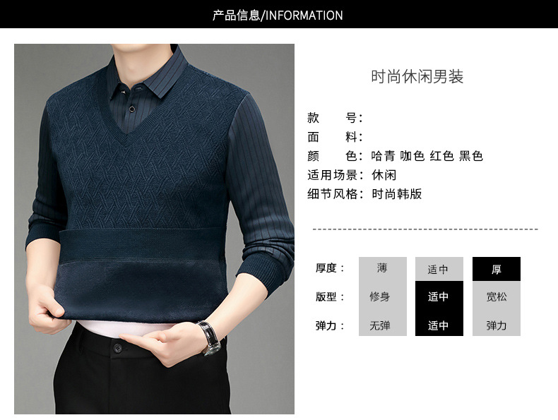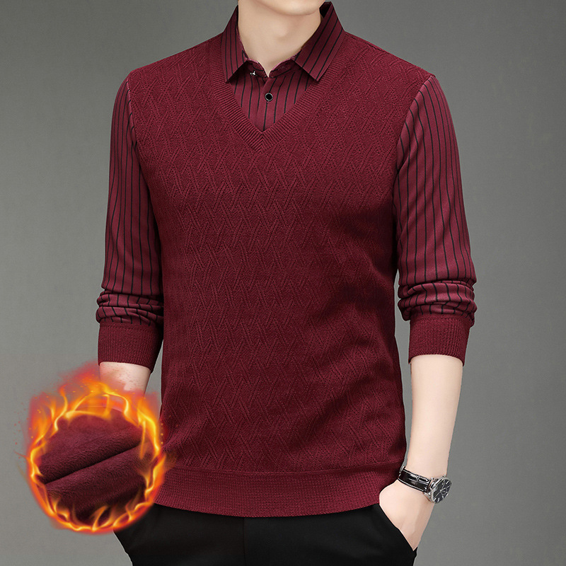 기모 줄무늬 가짜 투피스 남성용 긴팔 티셔츠 가을과 겨울 셔츠 칼라 아빠 비즈니스 남성용 캐주얼 두꺼운 베이스 셔츠