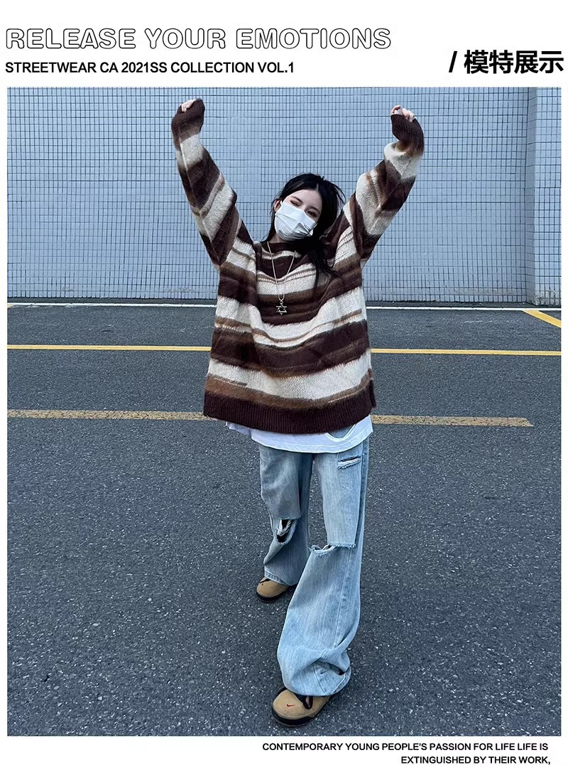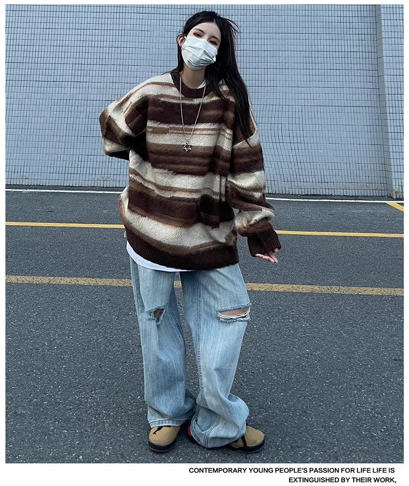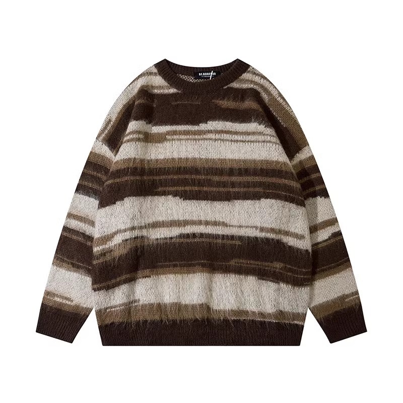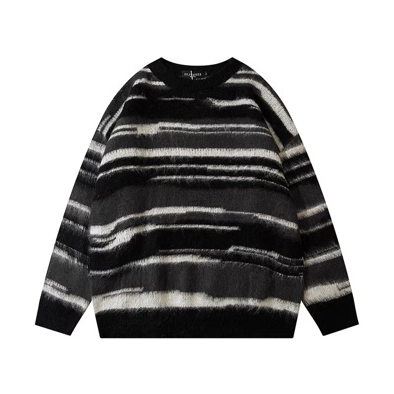 아메리칸 스타일 패션 브랜드 힙합 후치 줄무늬 스웨터 남자 가을 겨울 새로운 복고풍 스웨터 느슨한 캐주얼 탑