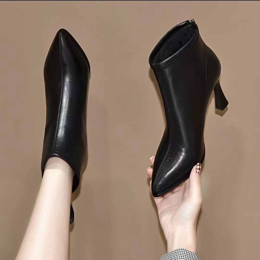 2024 새로운 가을과 겨울 작은 발 뒤꿈치 부츠 여성용 얇은 뒤꿈치 부드러운 가죽 신발 봄과 가을 싱글 부츠 부드러운 가죽 여성 신발 하이힐 마틴 부츠