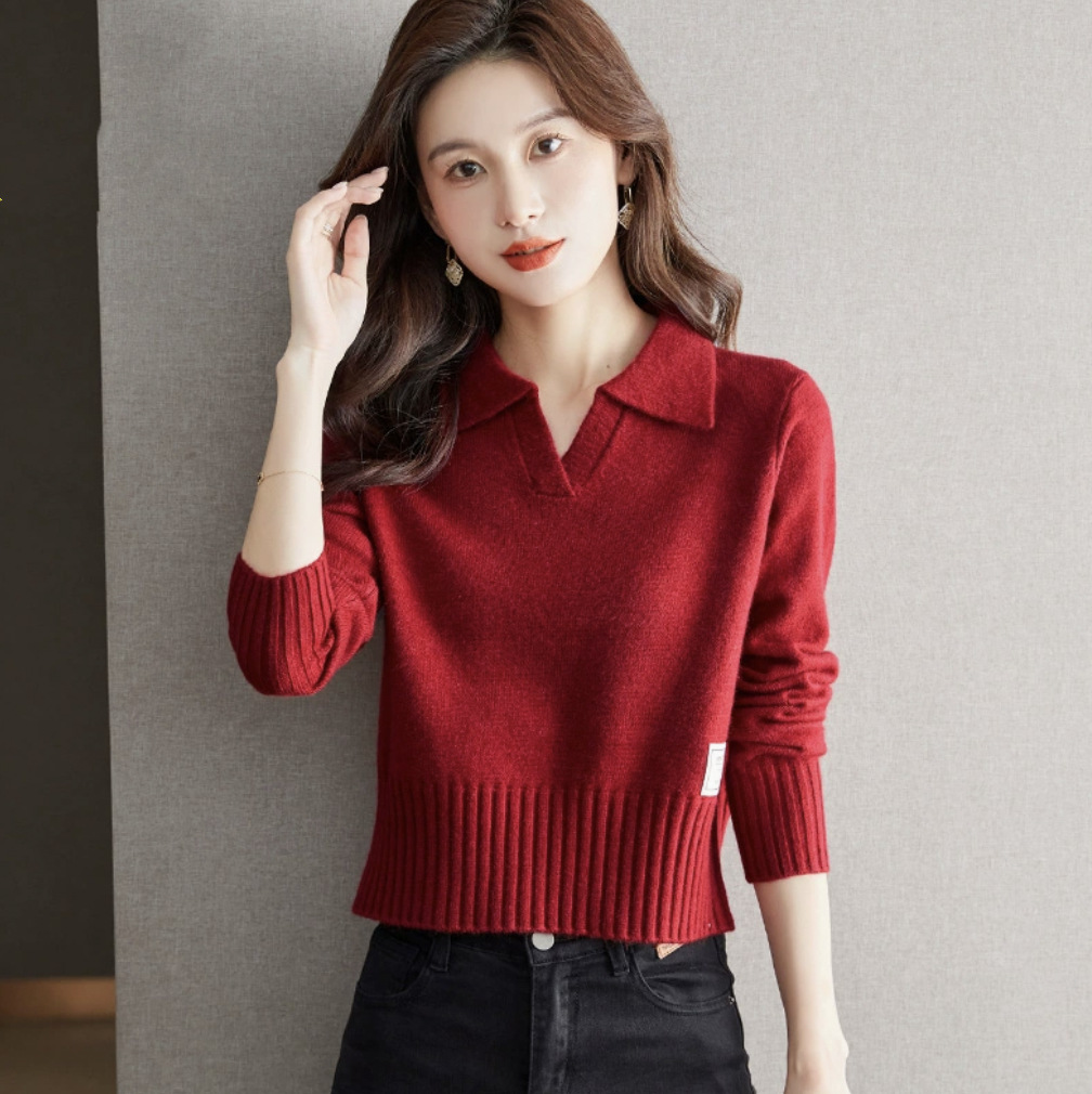 짧은 짧은 높은 허리 유행 서양 스타일 니트 최고 여성베이스 셔츠 가을 2024 새로운 빨간 스웨터