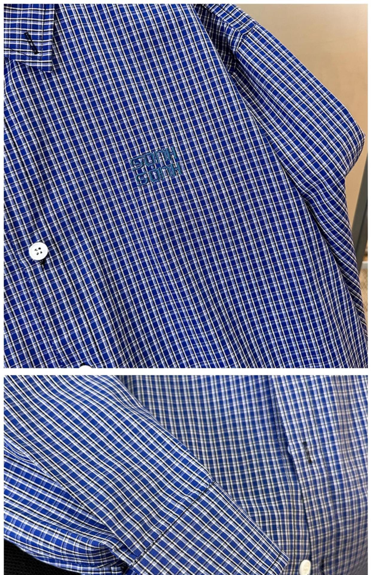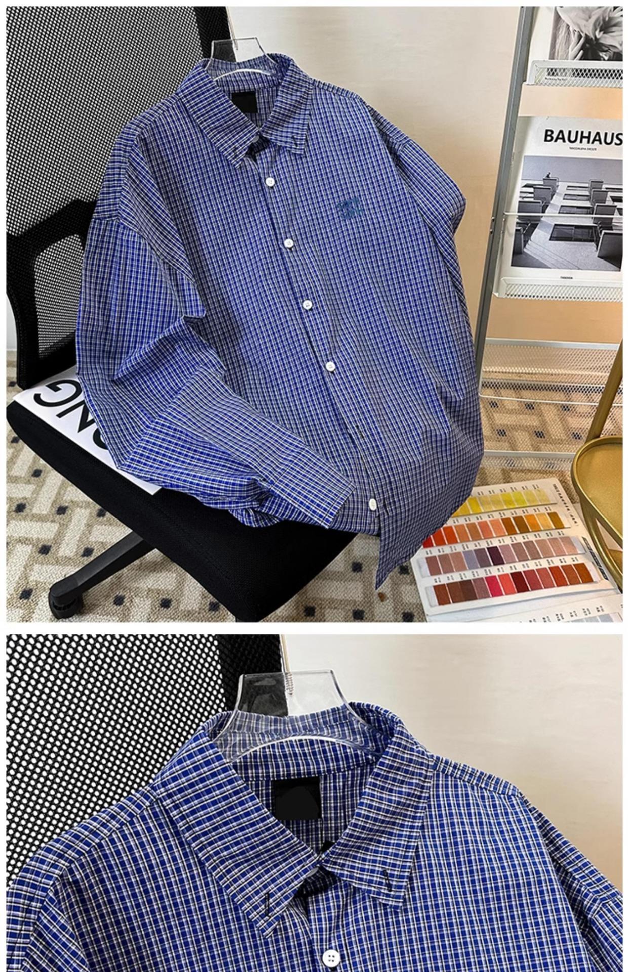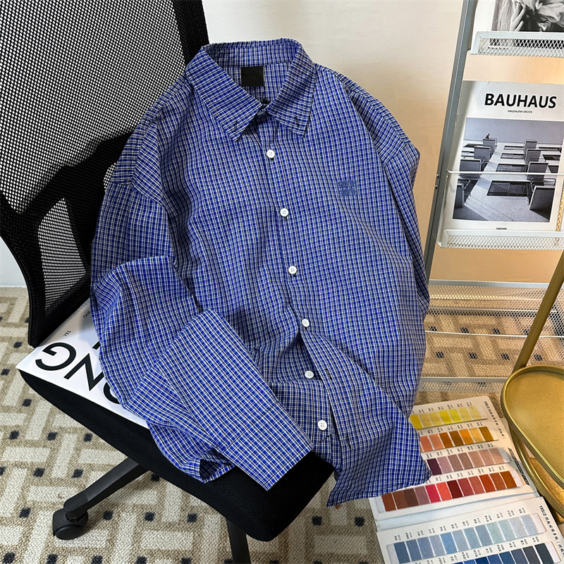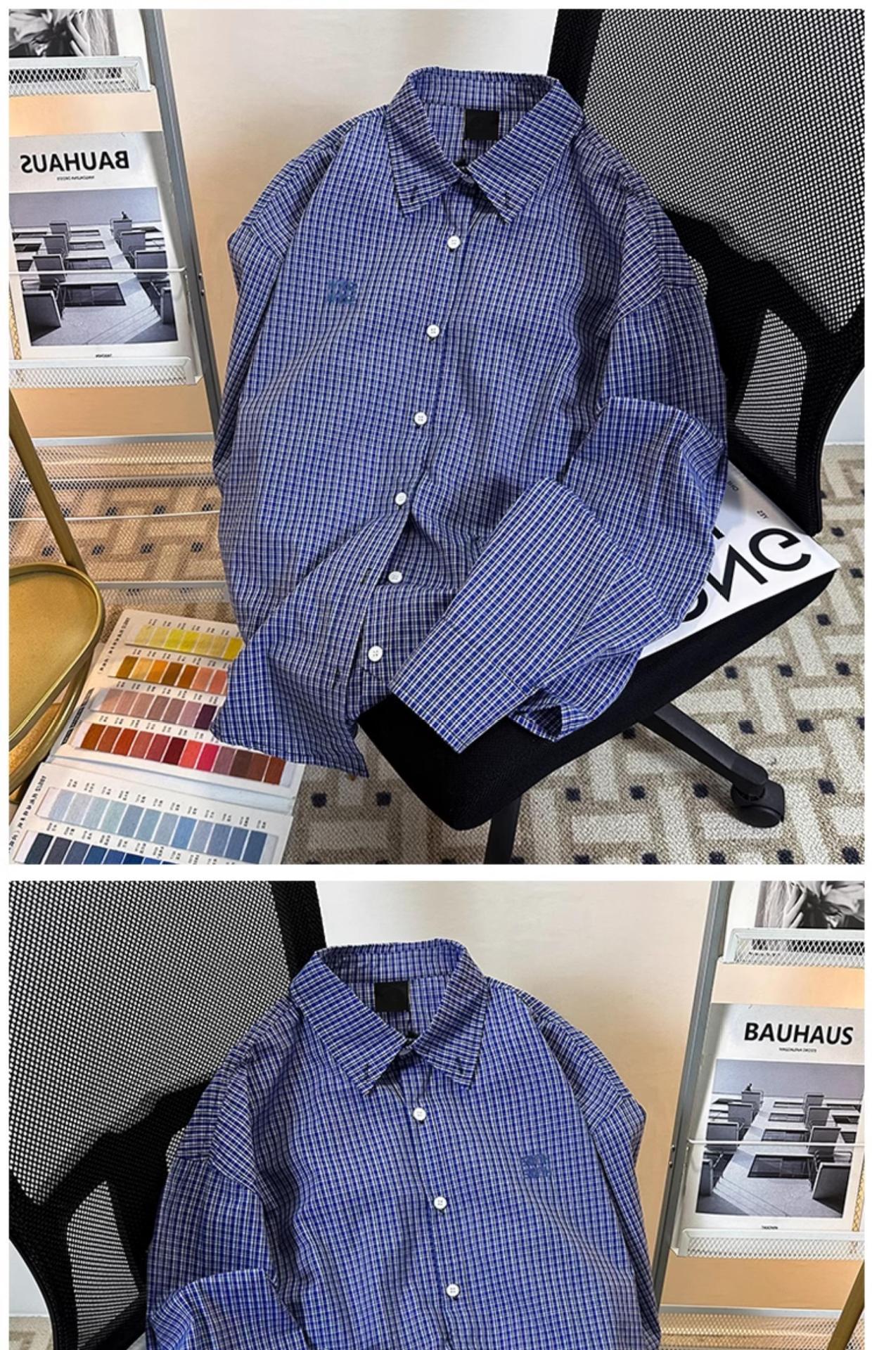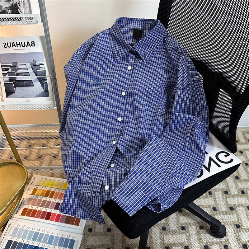 블루 파인 체크 무늬 긴팔 셔츠 남성과 여성을위한 초기 가을 미국 스타일 레트로 루즈 캐주얼 올 매치 커플 셔츠 재킷스토어 가기