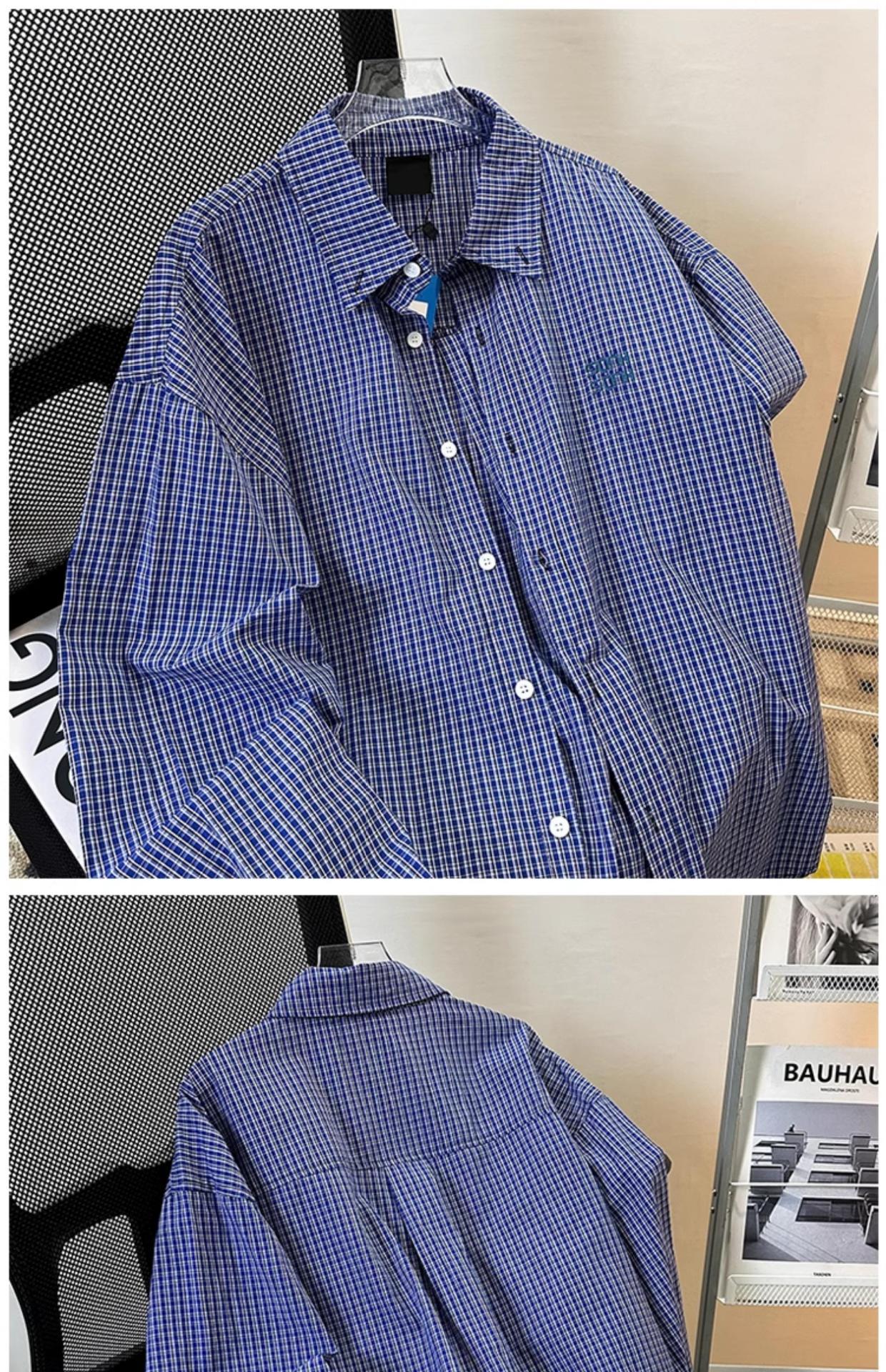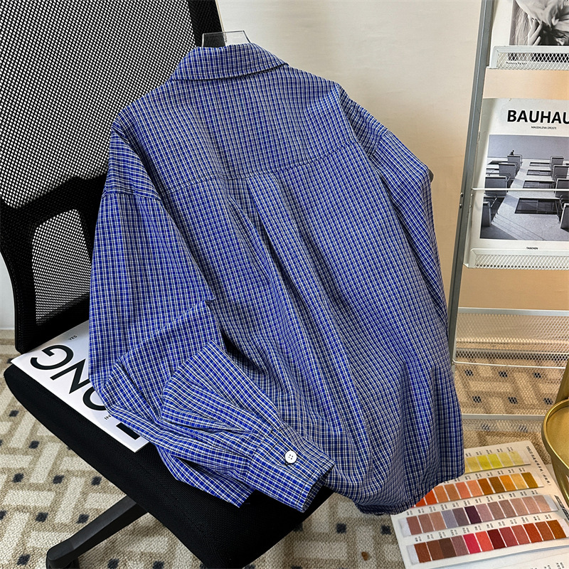 블루 파인 체크 무늬 긴팔 셔츠 남성과 여성을위한 초기 가을 미국 스타일 레트로 루즈 캐주얼 올 매치 커플 셔츠 재킷