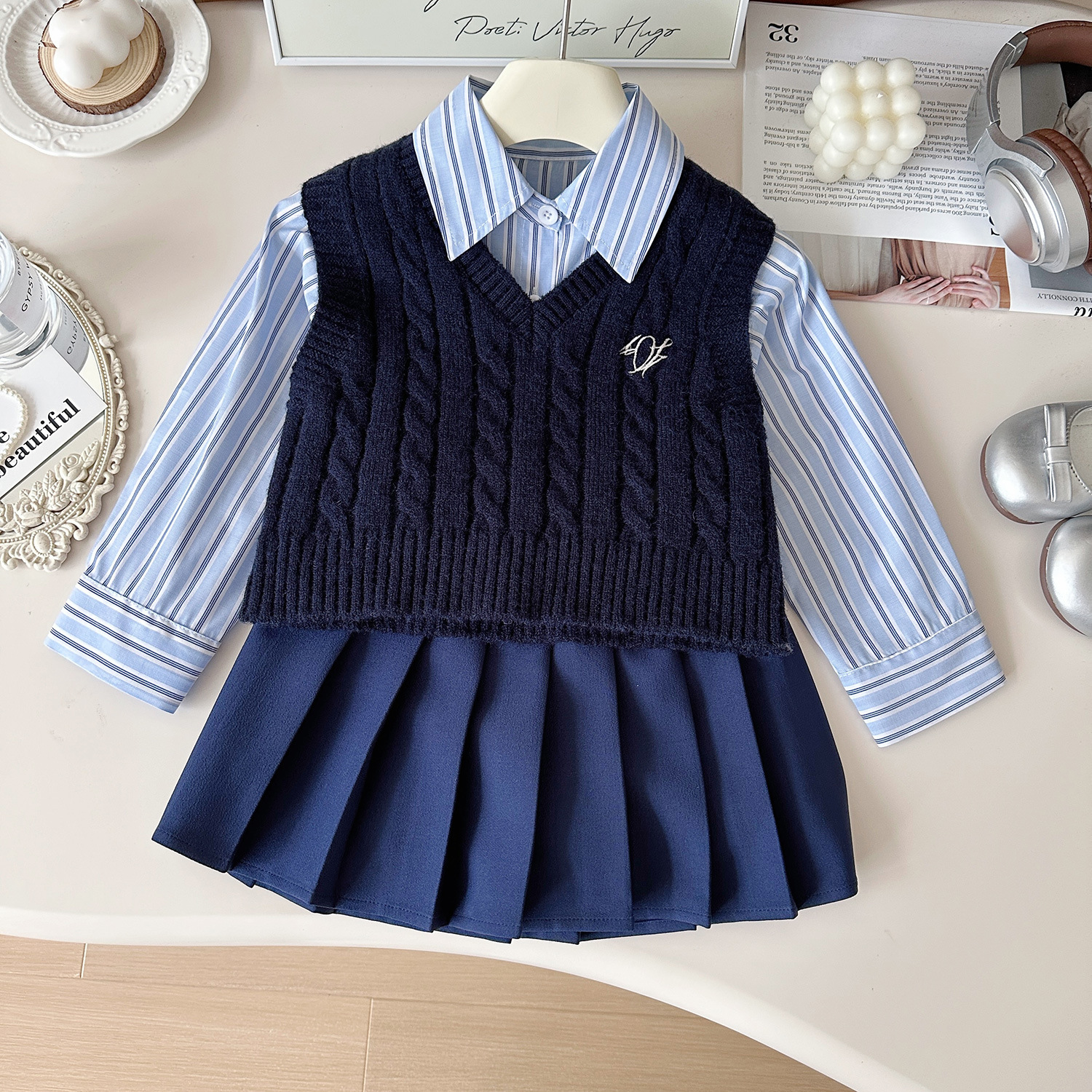 2025년 가을 신상 한국 스타일 여아 니트 조끼 스트라이프 셔츠 컬리지 스타일 플리츠 스커트 3종 세트 도매