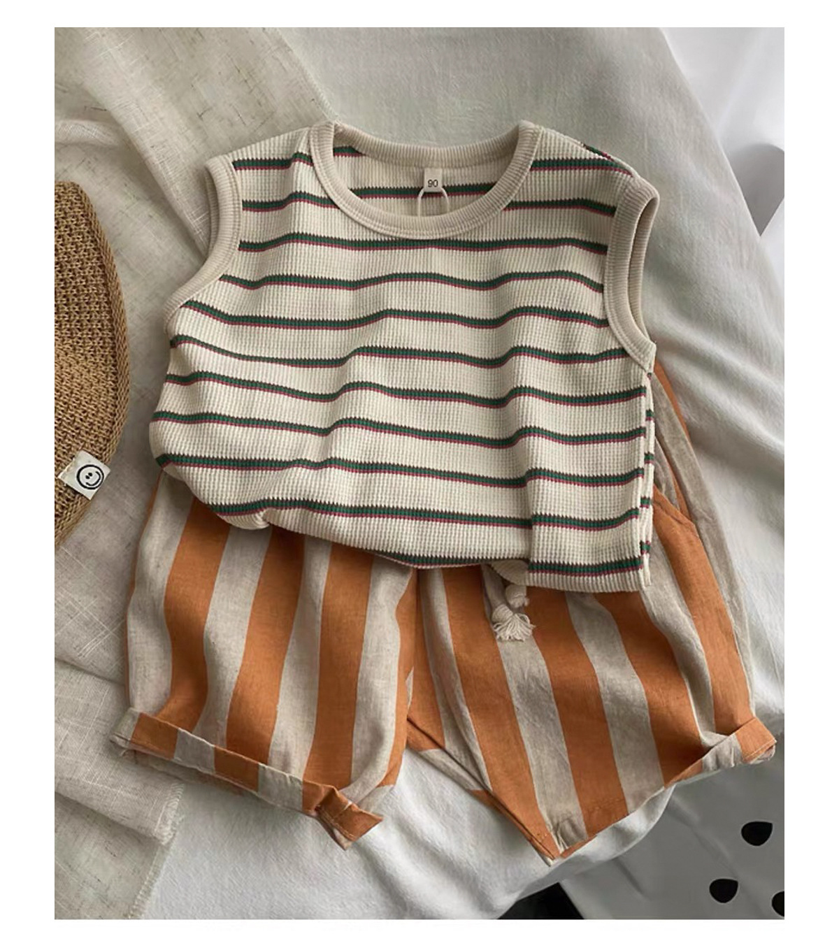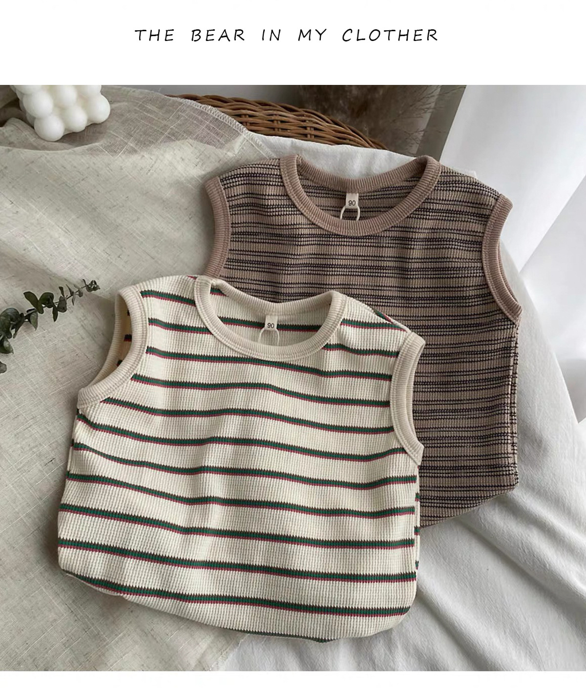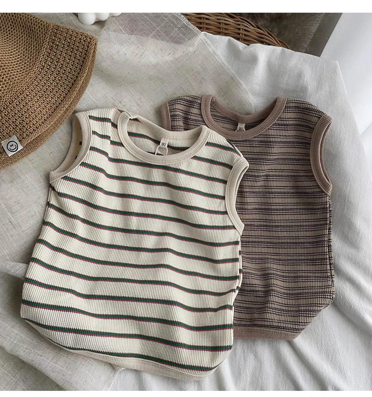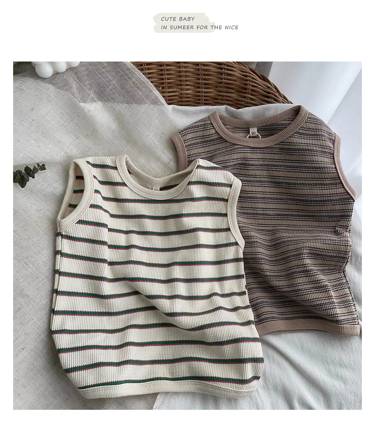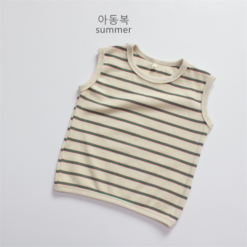 여름 어린이 조끼 한국 스타일 소년 최고 민소매 크루 넥 줄무늬 와플 아기 소년의 조끼 면화 카테고리 A