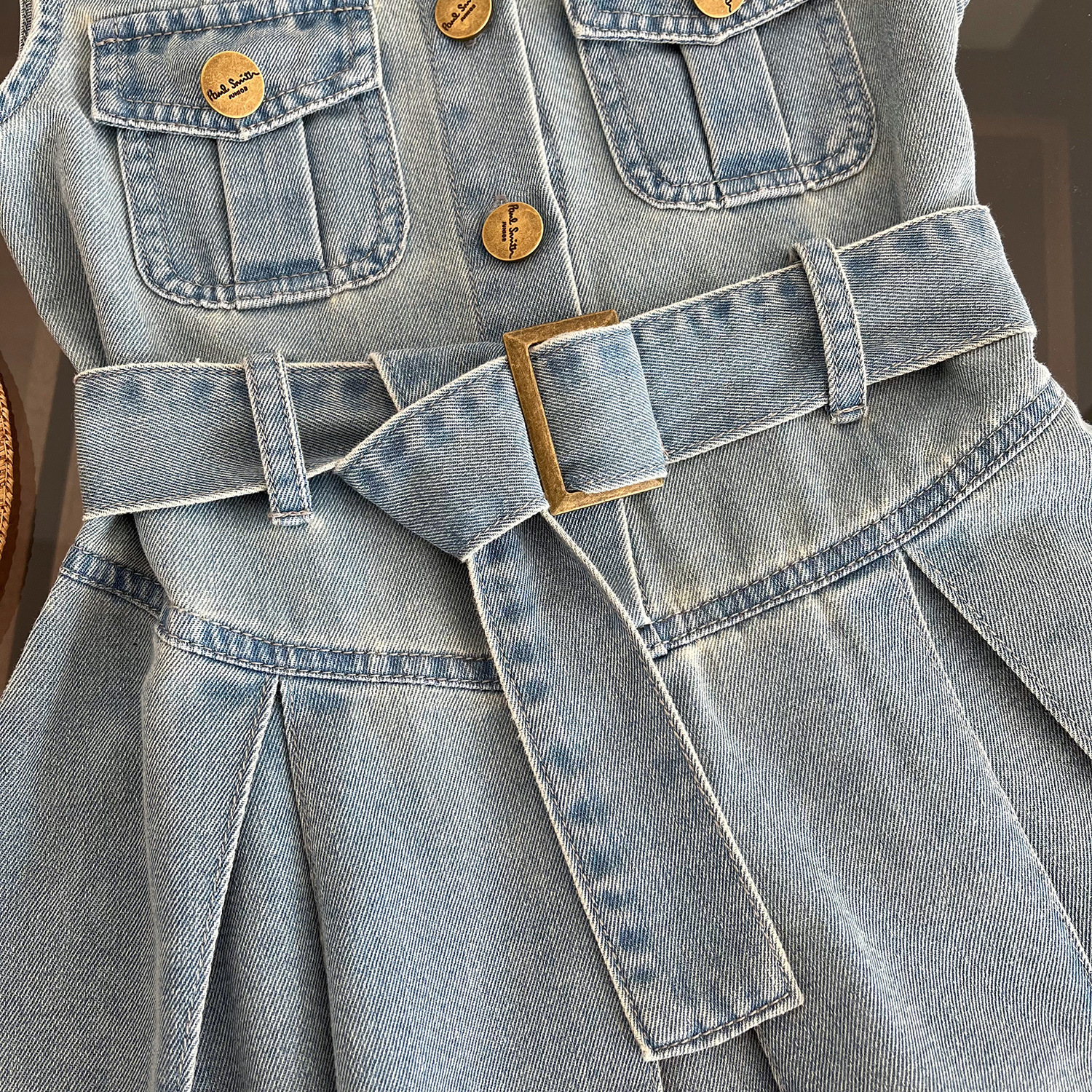 2024 년 여름 새로운 한국 여자 옷깃 민소매 허리 데님 원피스 24157 도매