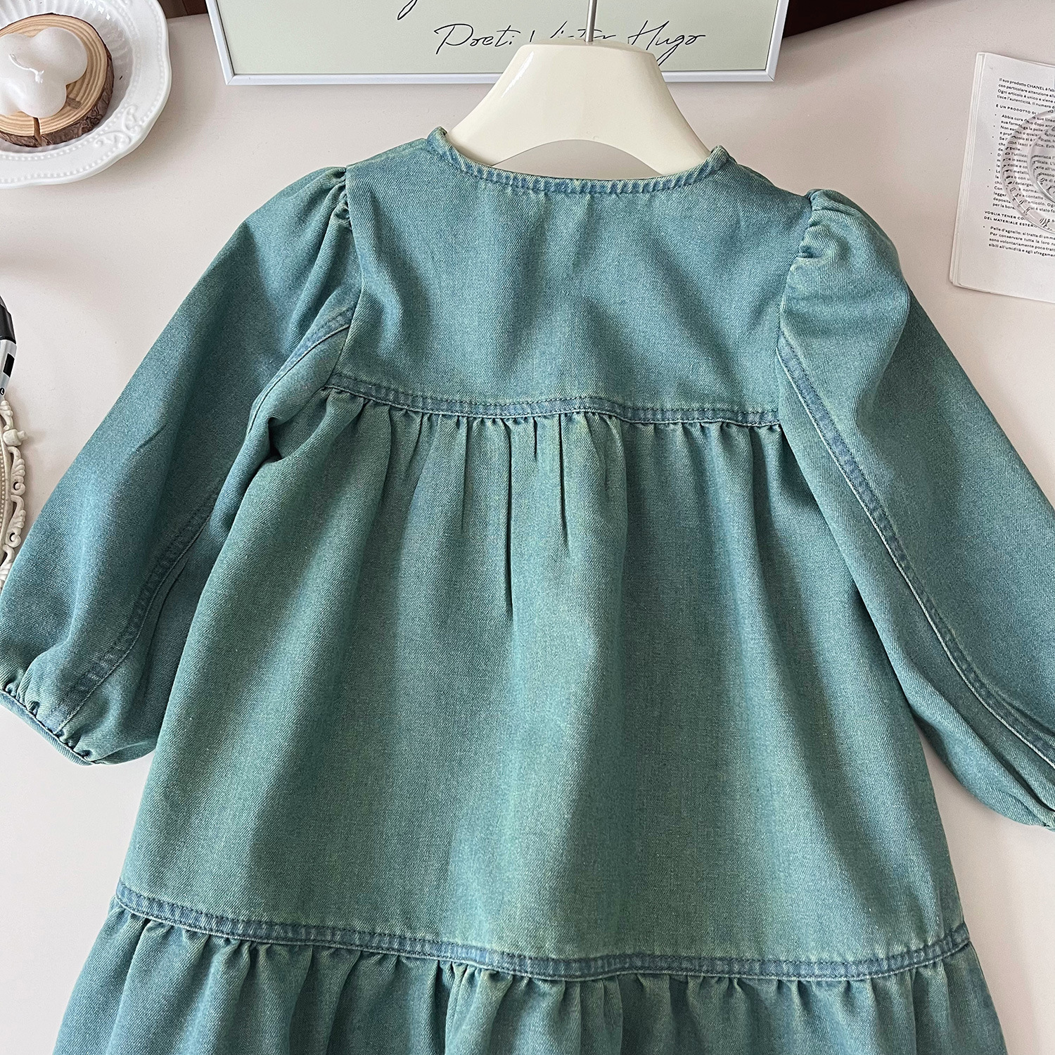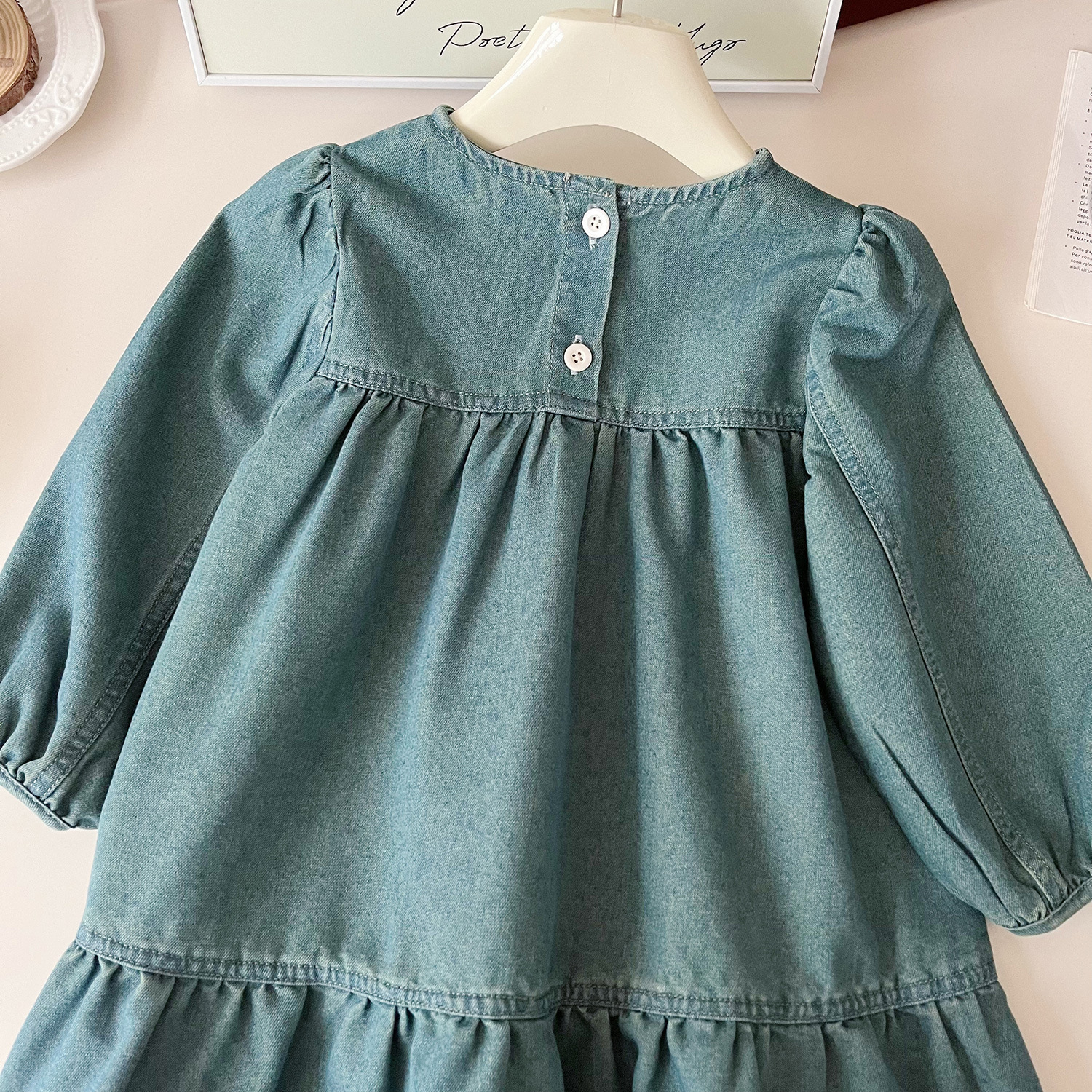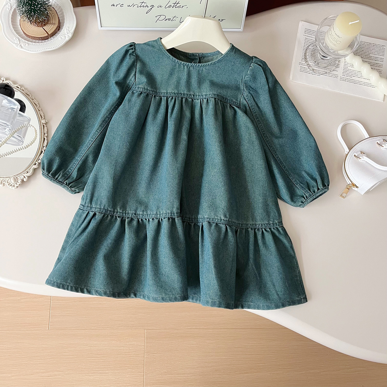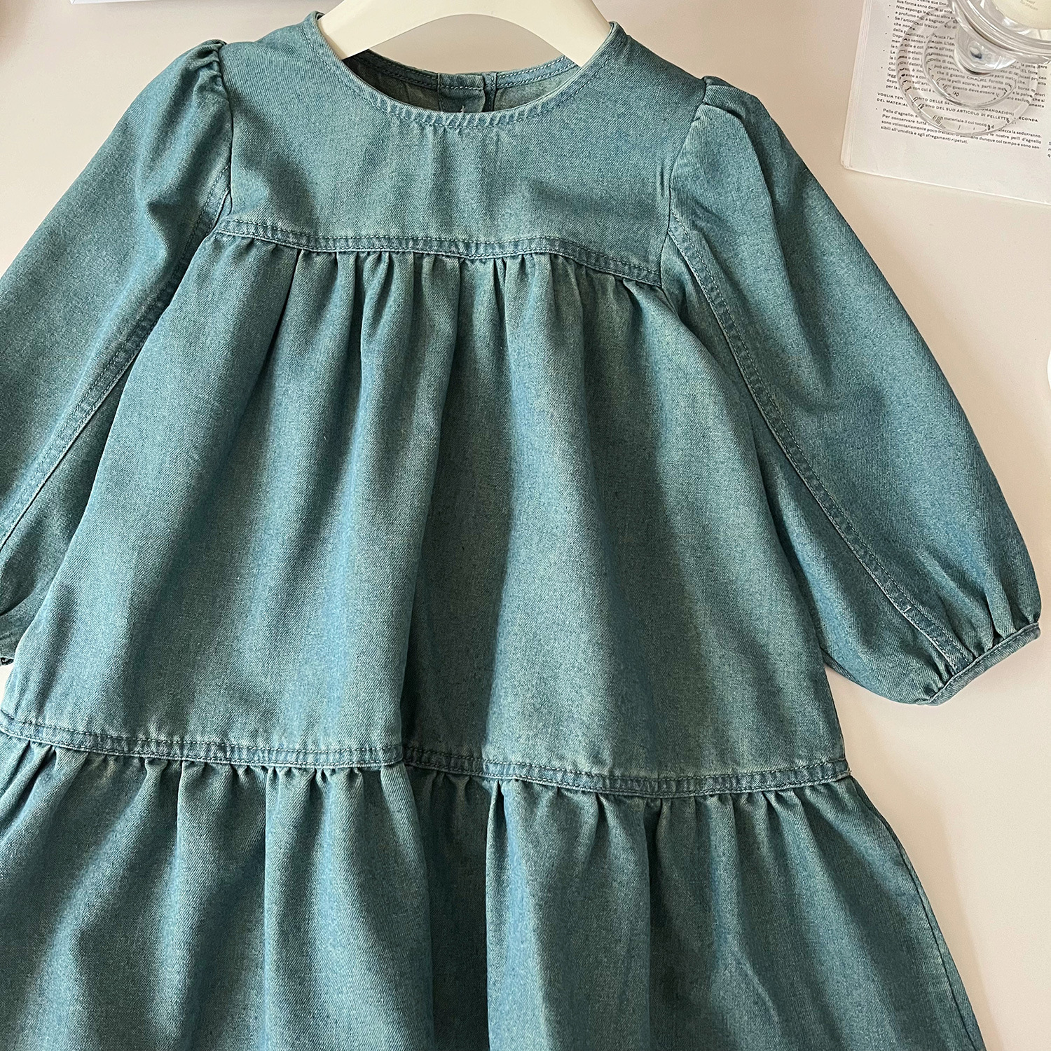 2024 가을 새로운 한국 소녀 데님 단색 원피스 아기 긴팔 가을 아기 치마 아동복 도매스토어 가기