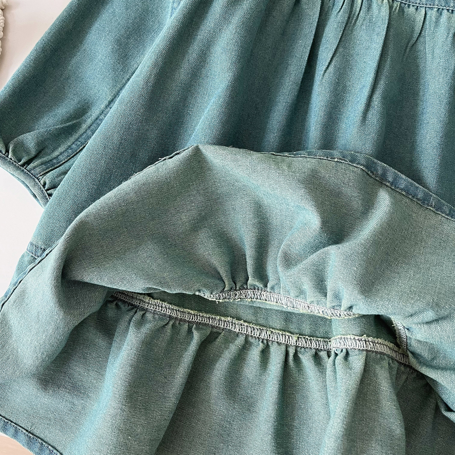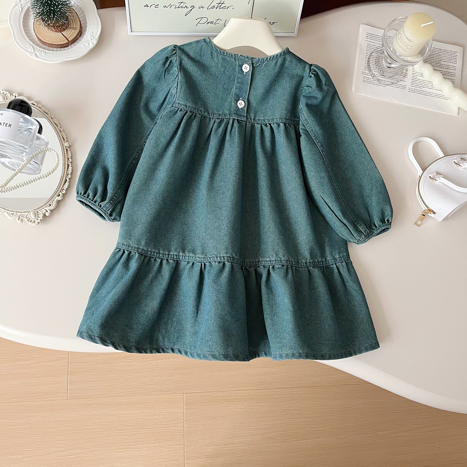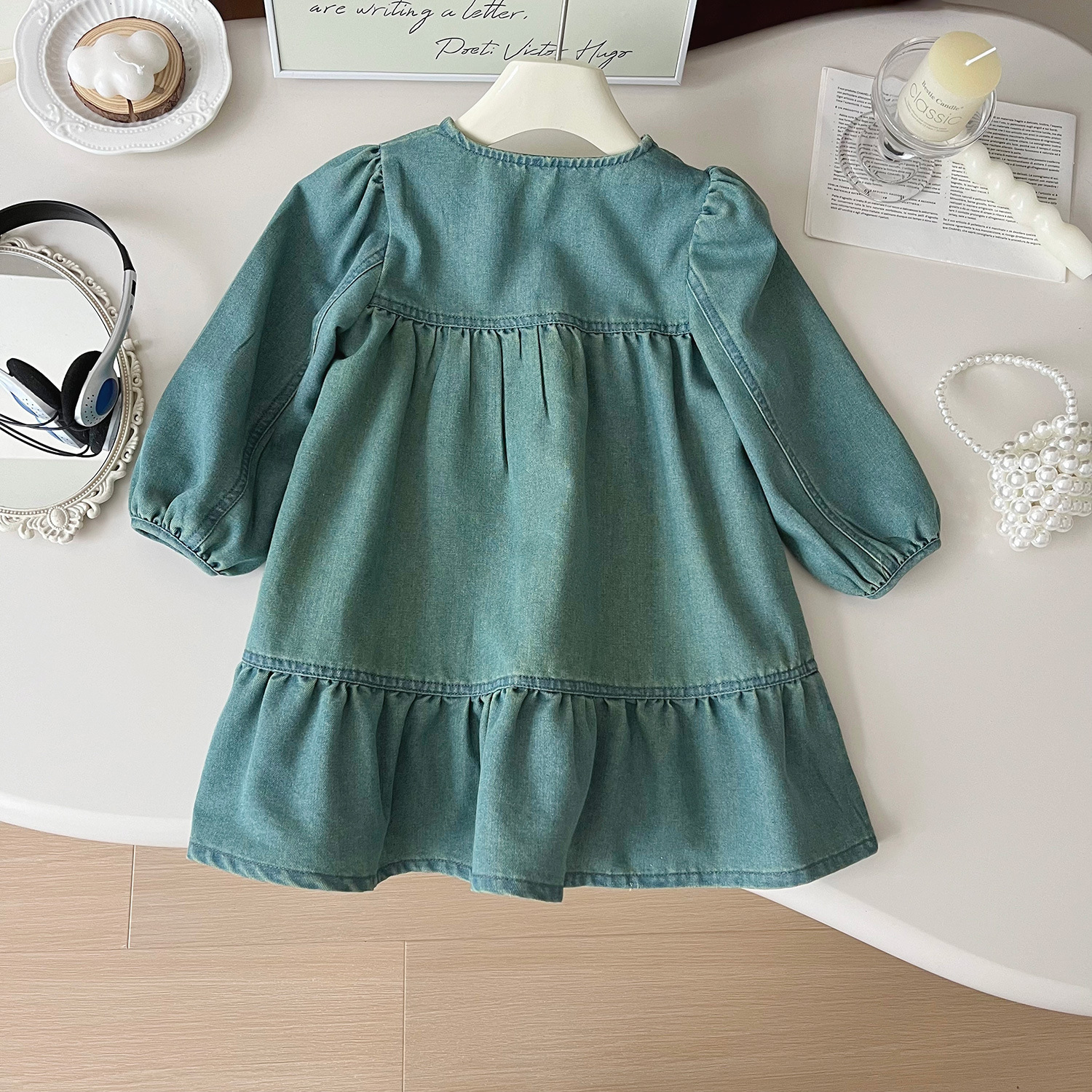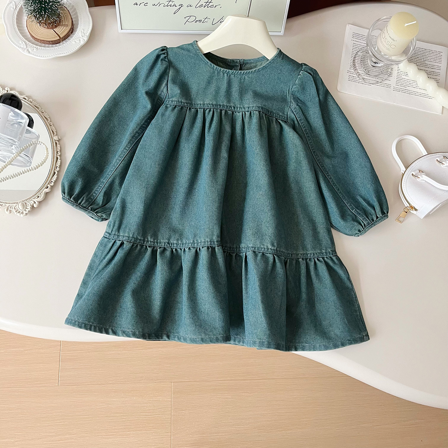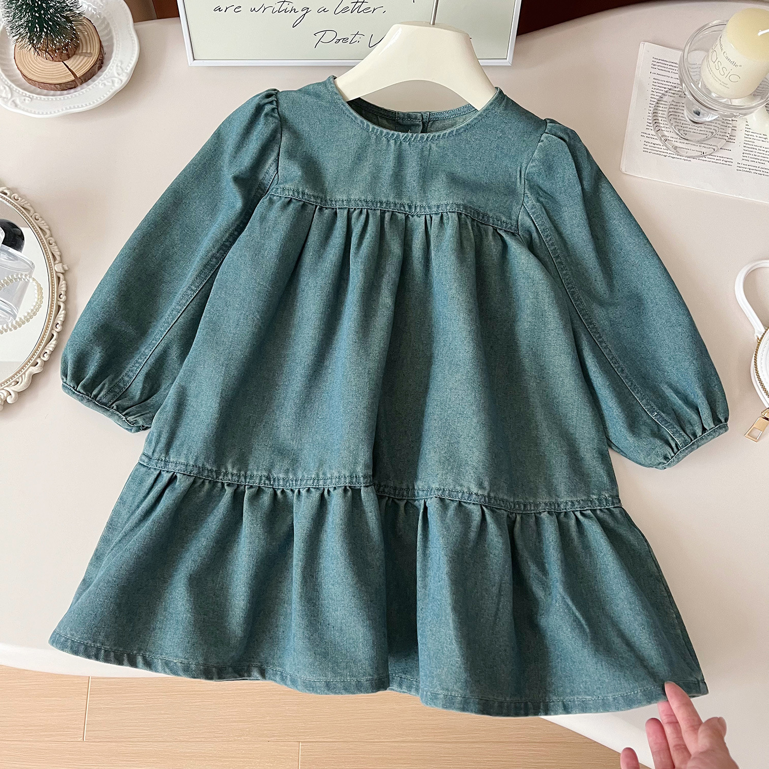 2024 가을 새로운 한국 소녀 데님 단색 원피스 아기 긴팔 가을 아기 치마 아동복 도매
