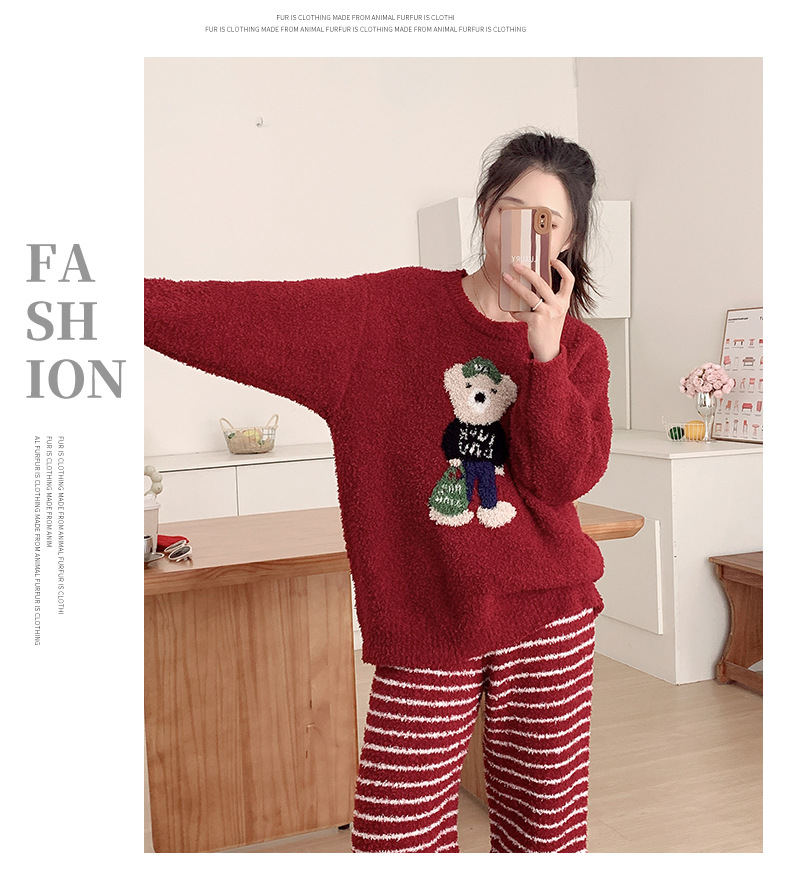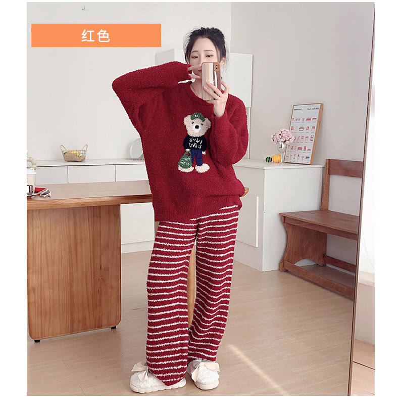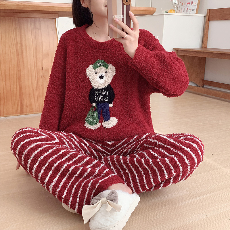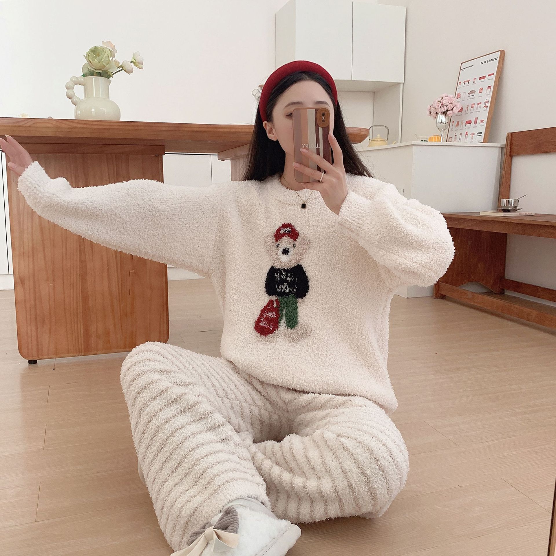 겨울 만화 곰 캐주얼 홈 의류 세트 여성용 느슨한 기모 두꺼운 반쪽 벨벳 따뜻한 파자마스토어 가기