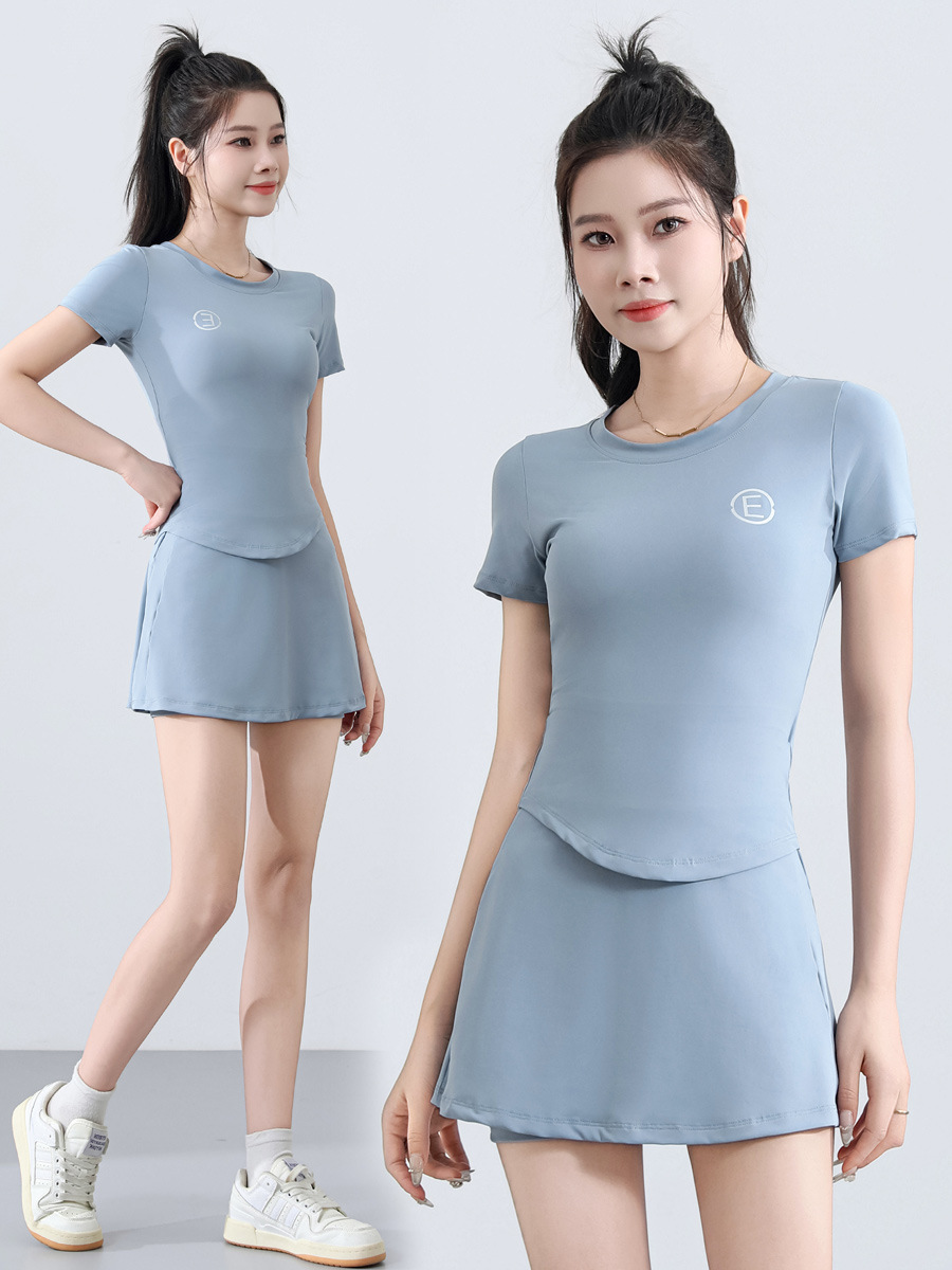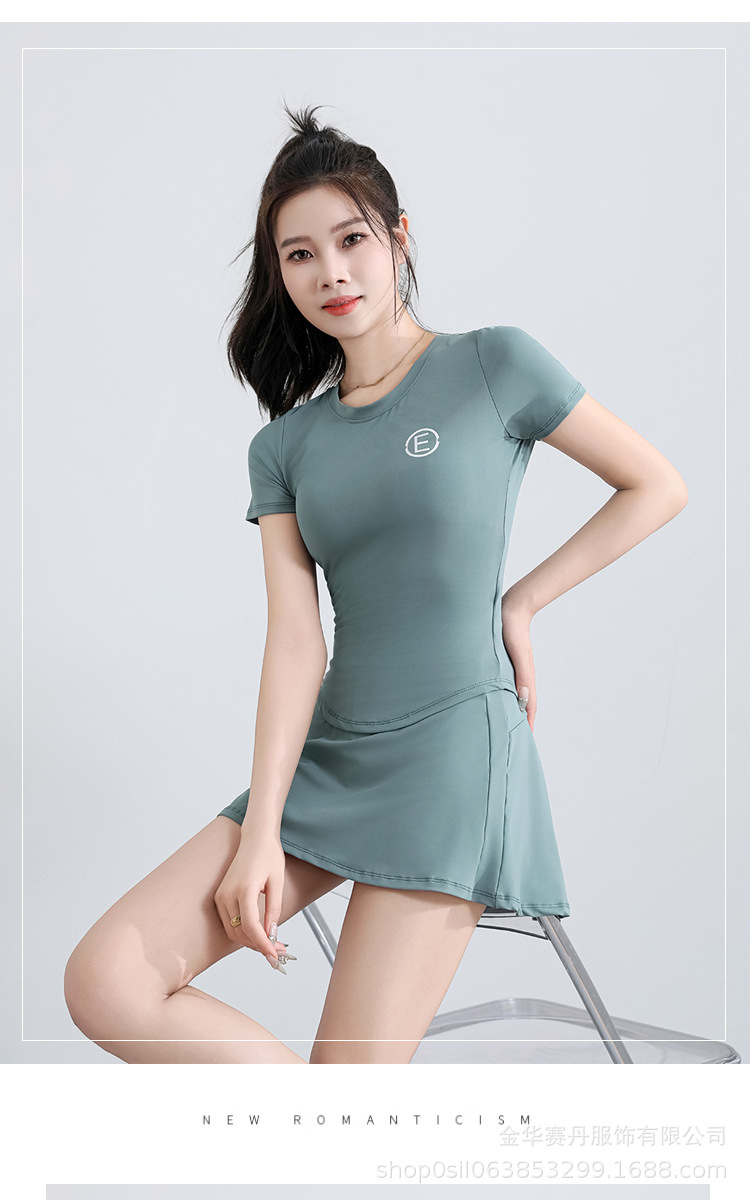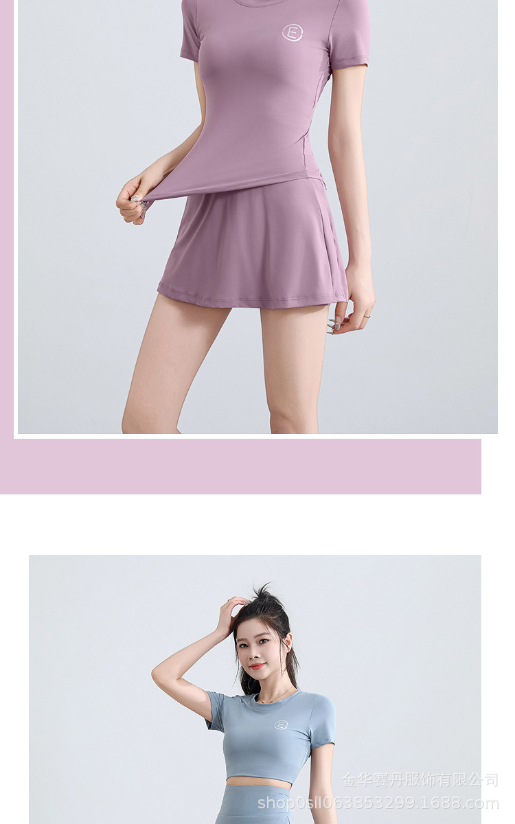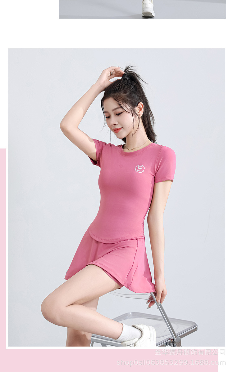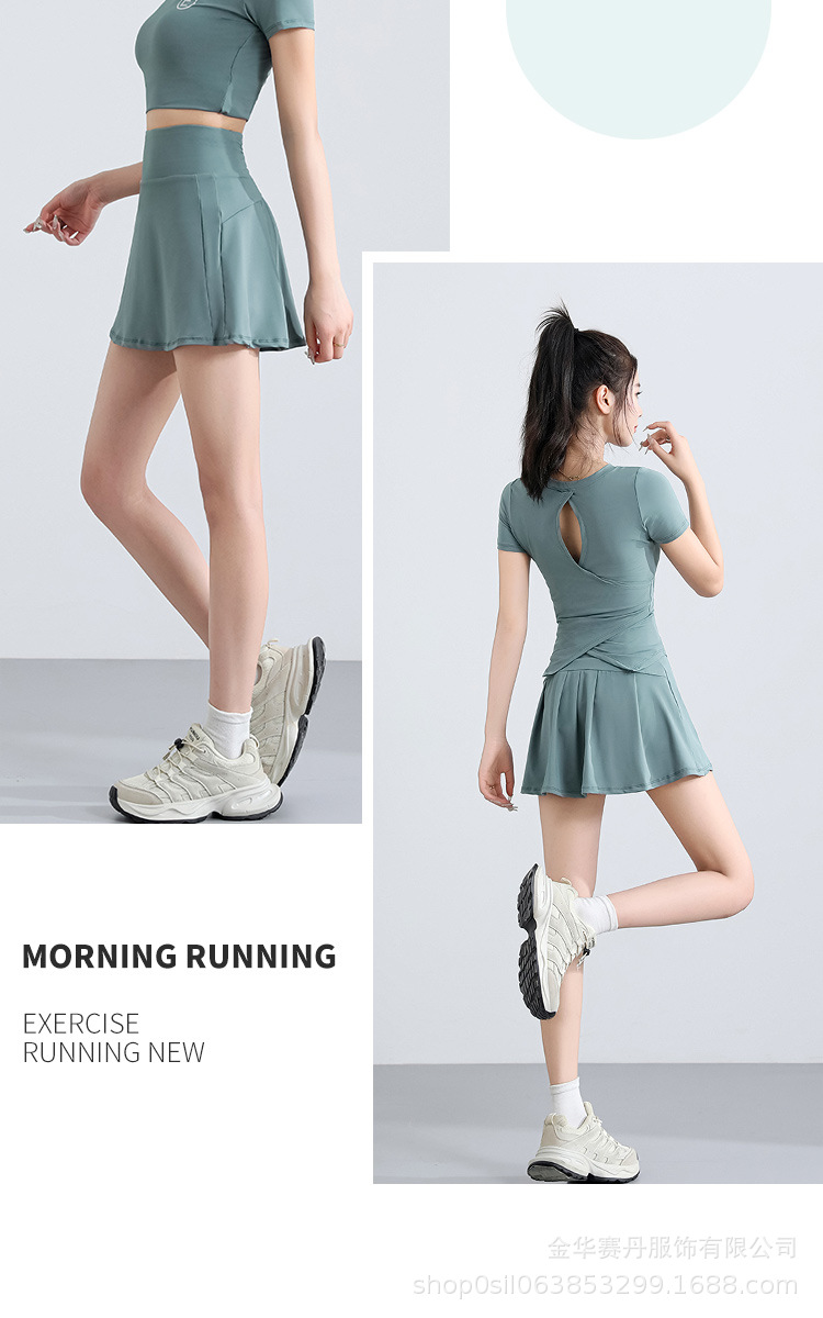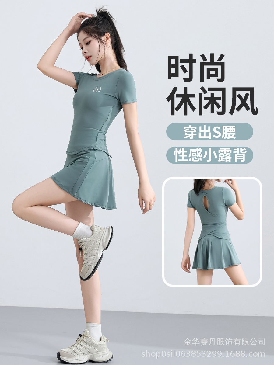 필라테스 섹시 슬림 스포츠 요가 슈트 노출 방지 페이크 투피스 스커트 피트니스 슬리밍 아름다운 등 티셔츠
