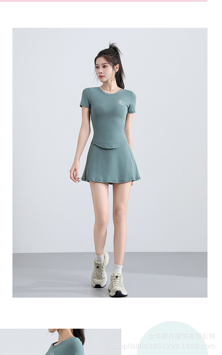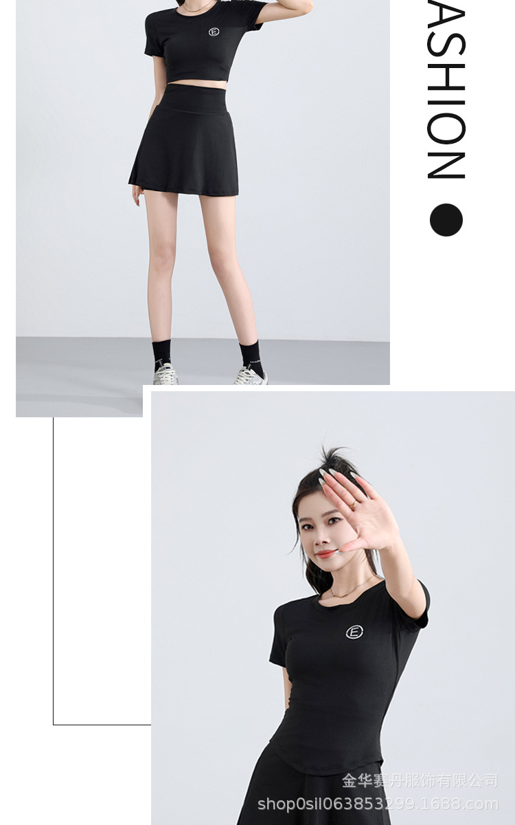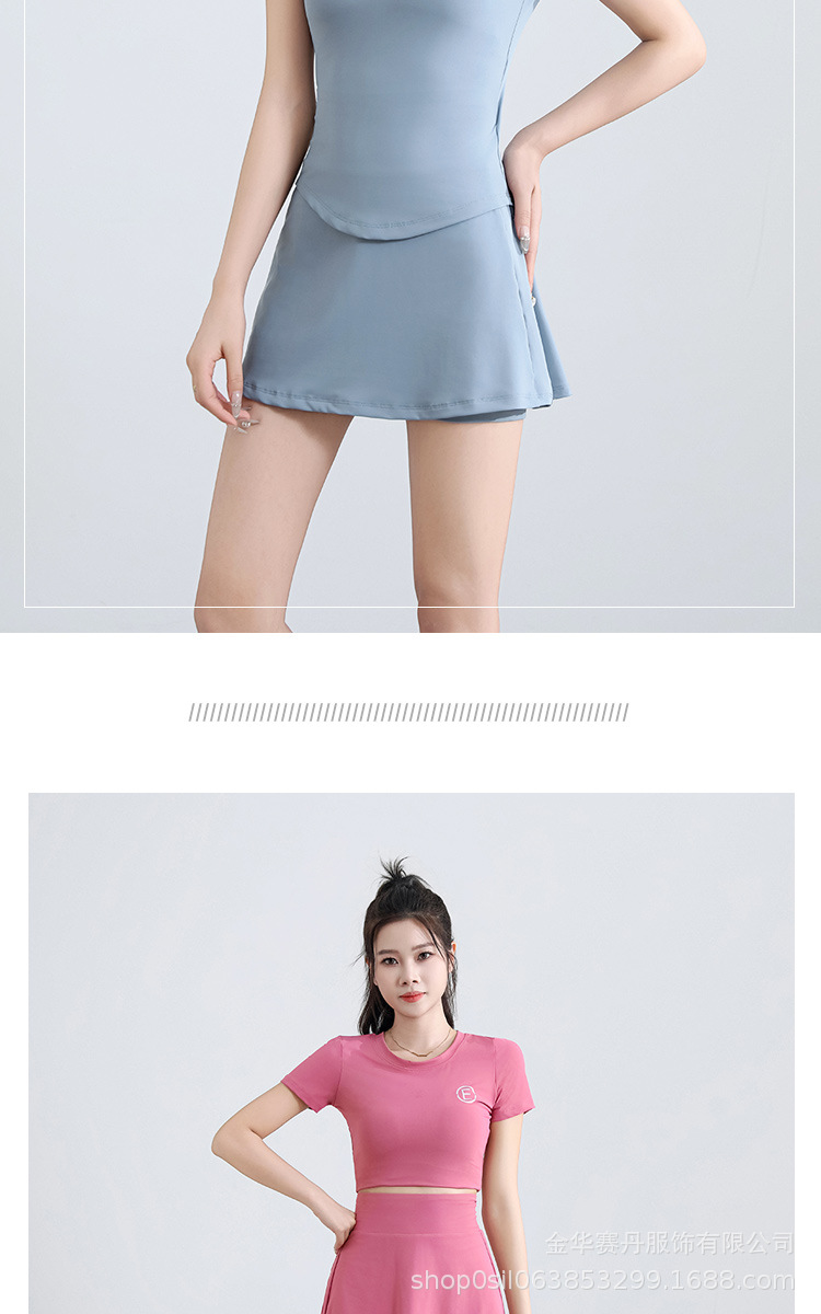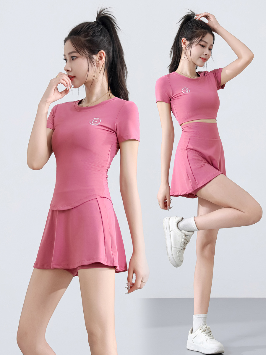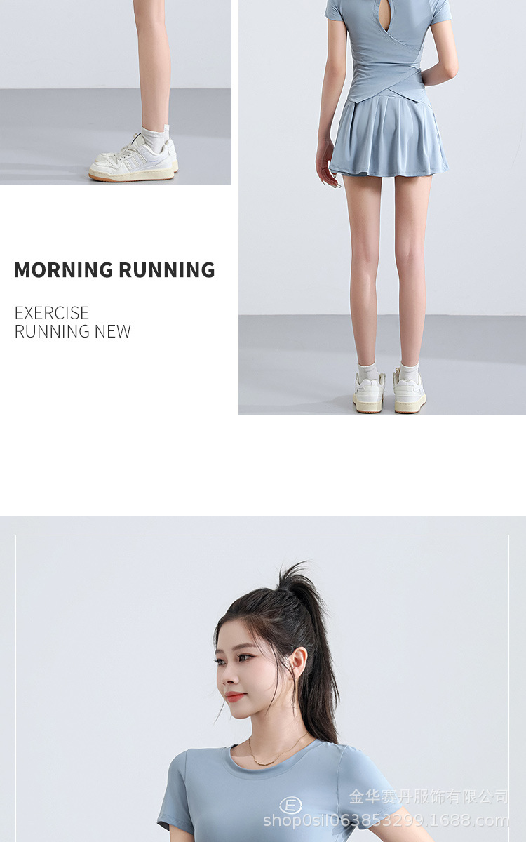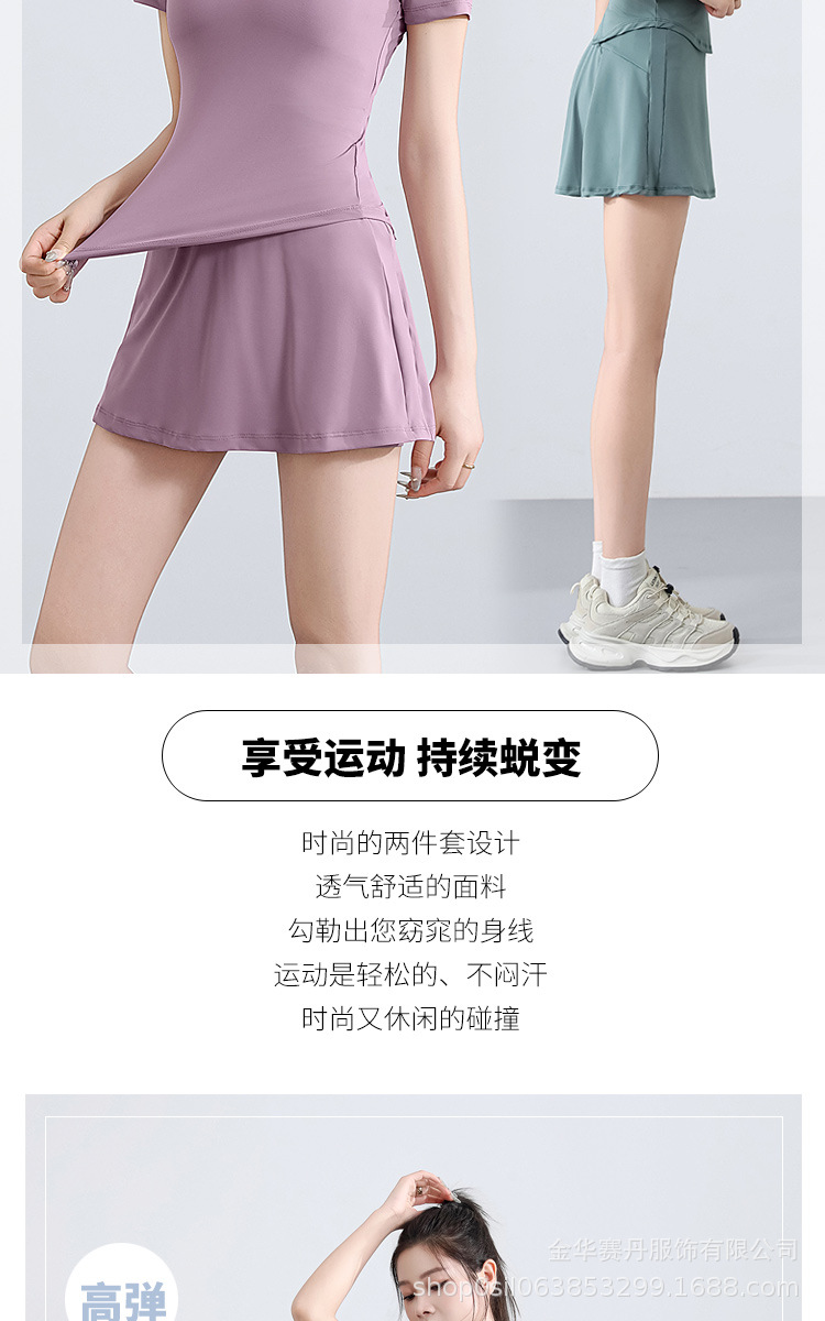 필라테스 섹시 슬림 스포츠 요가 슈트 노출 방지 페이크 투피스 스커트 피트니스 슬리밍 아름다운 등 티셔츠