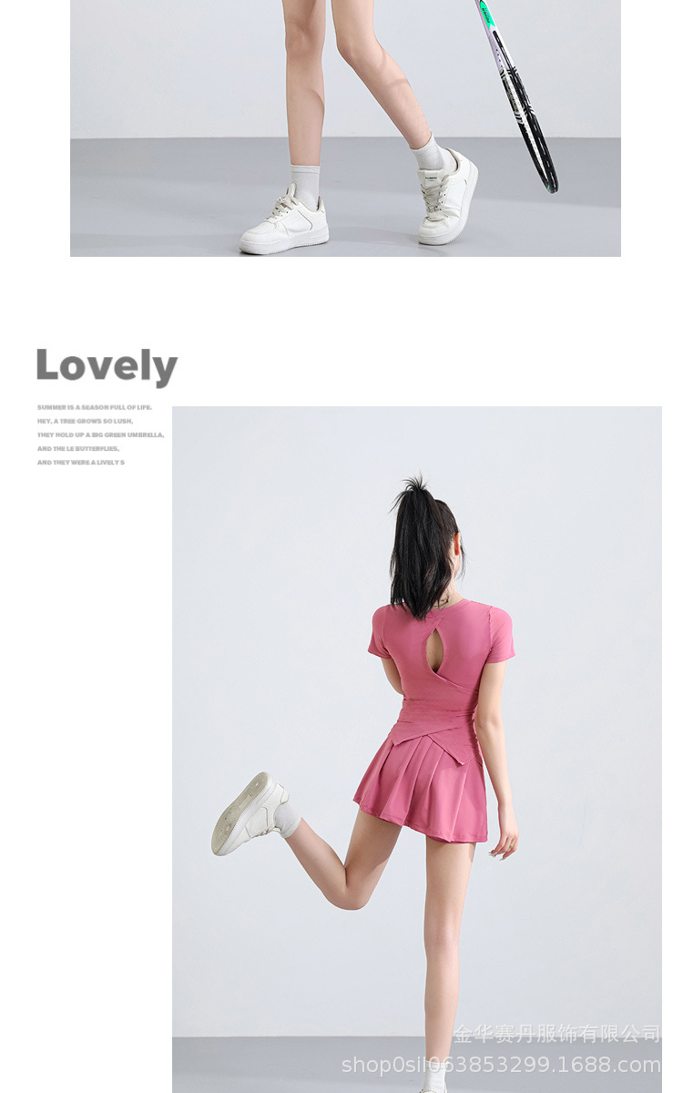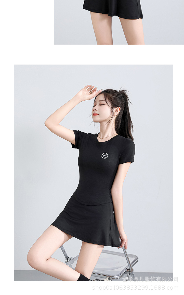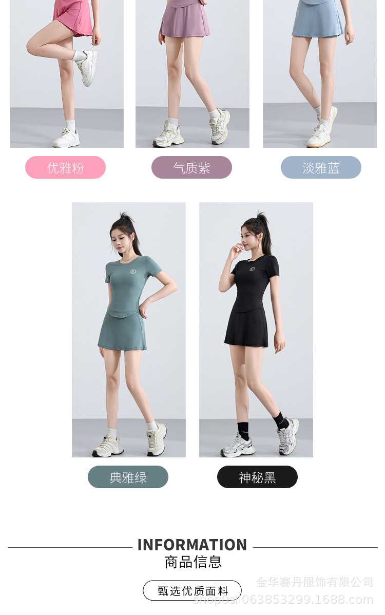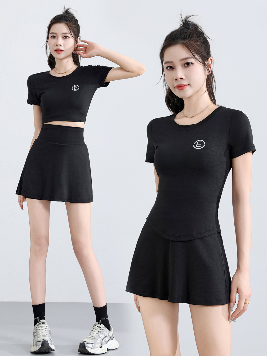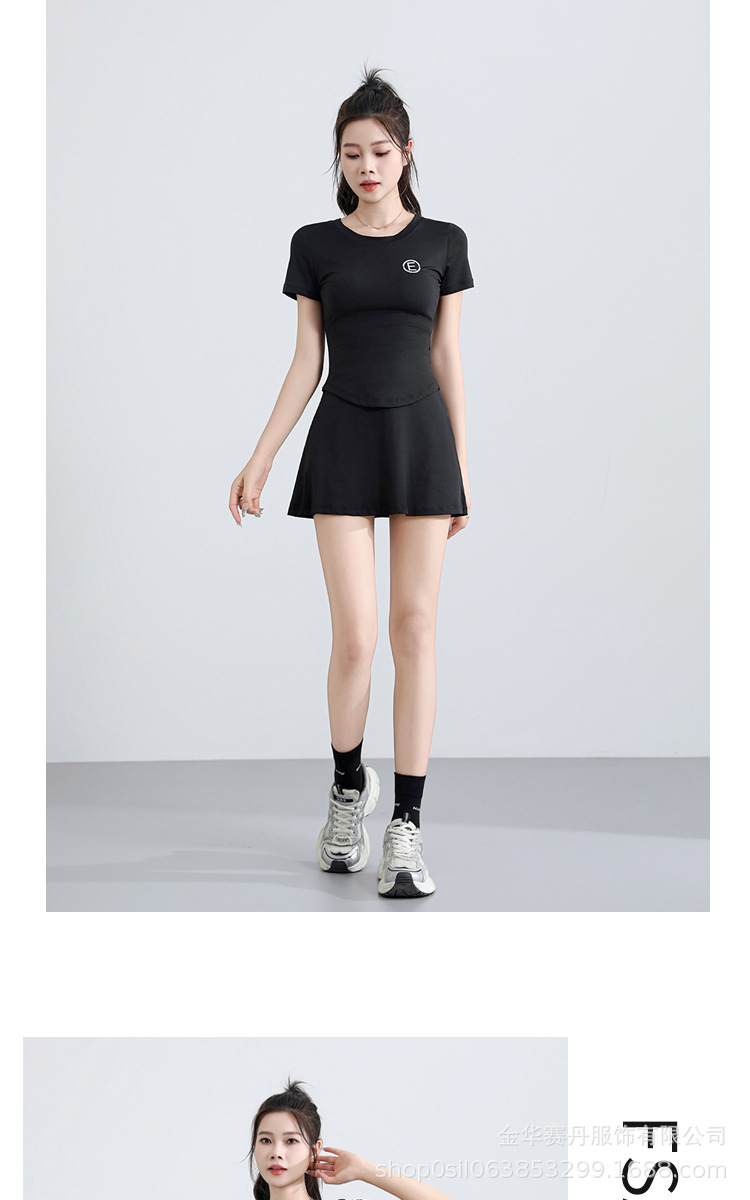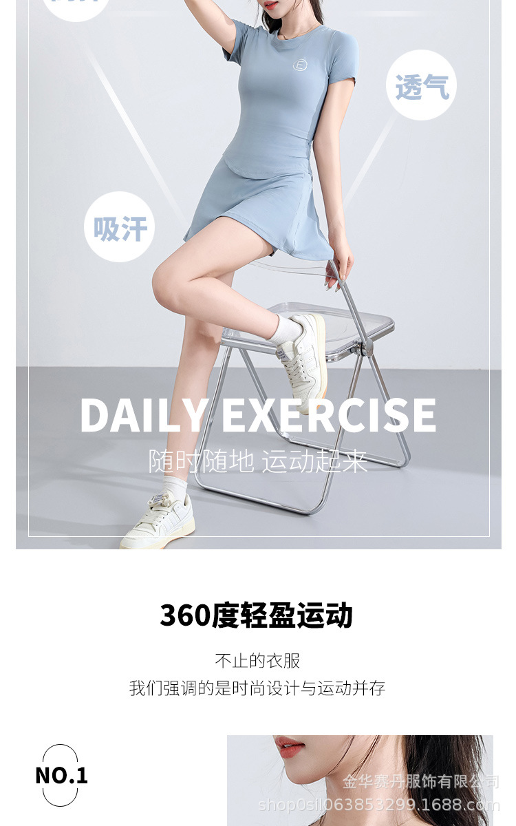 필라테스 섹시 슬림 스포츠 요가 슈트 노출 방지 페이크 투피스 스커트 피트니스 슬리밍 아름다운 등 티셔츠