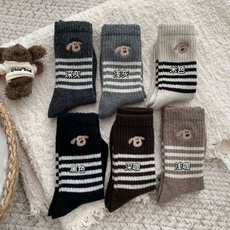 줄무늬 양모 양말 여성 회색 중간 길이 양말 가을과 겨울 두꺼운 따뜻한 빈티지 마일러 만화 강아지 스타킹
