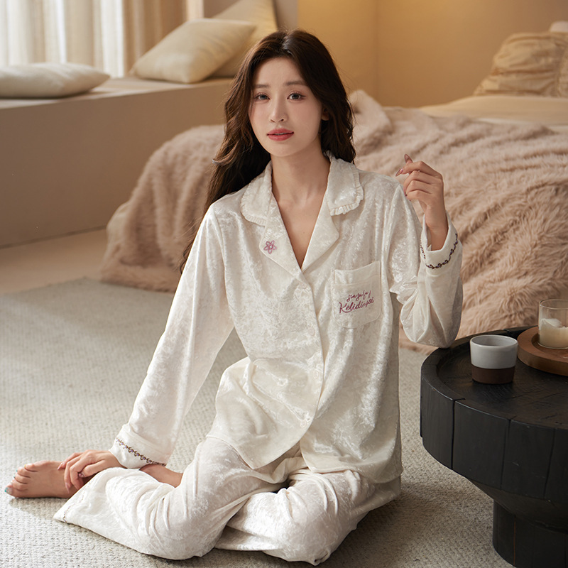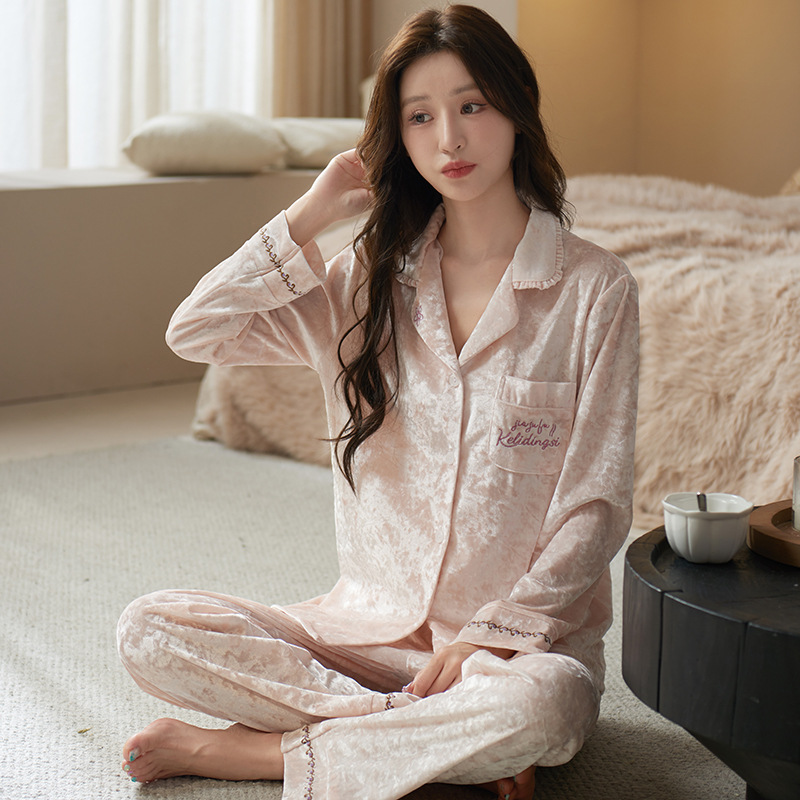 하이 엔드 센스 골든 벨벳 파자마 여성용 긴팔 바지 옷깃 따뜻한 가을과 겨울 카디건 홈 의류 겉옷 세트스토어 가기