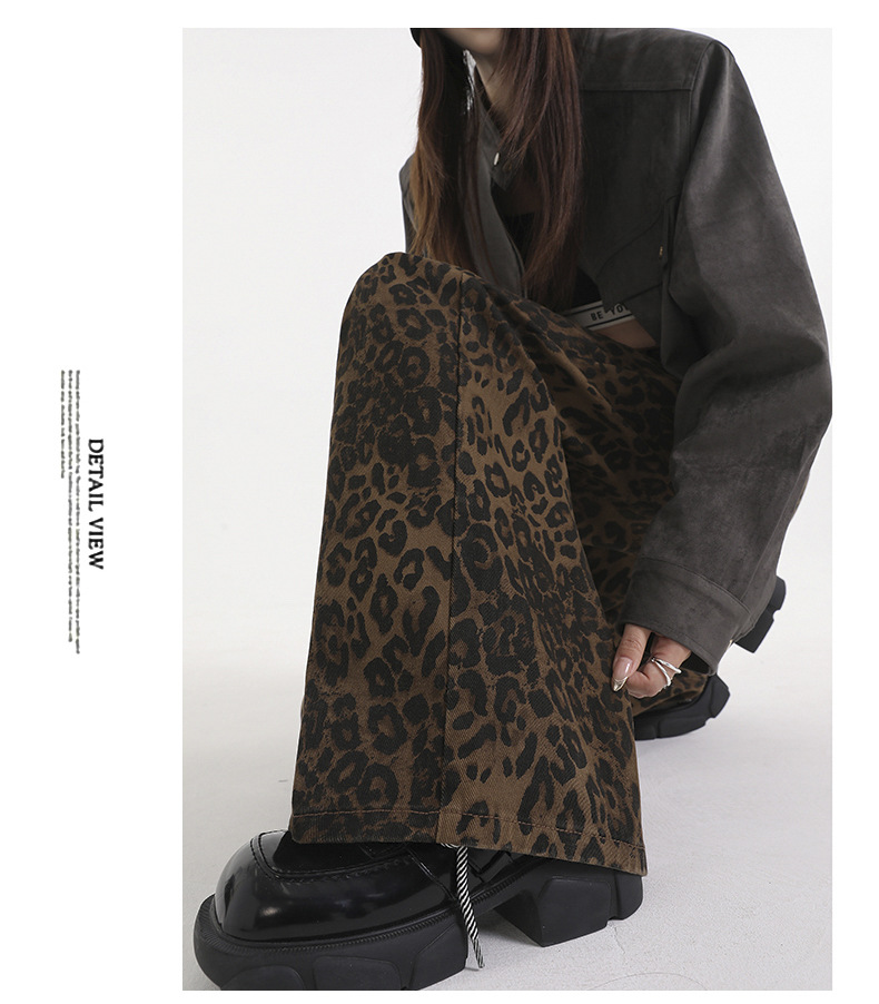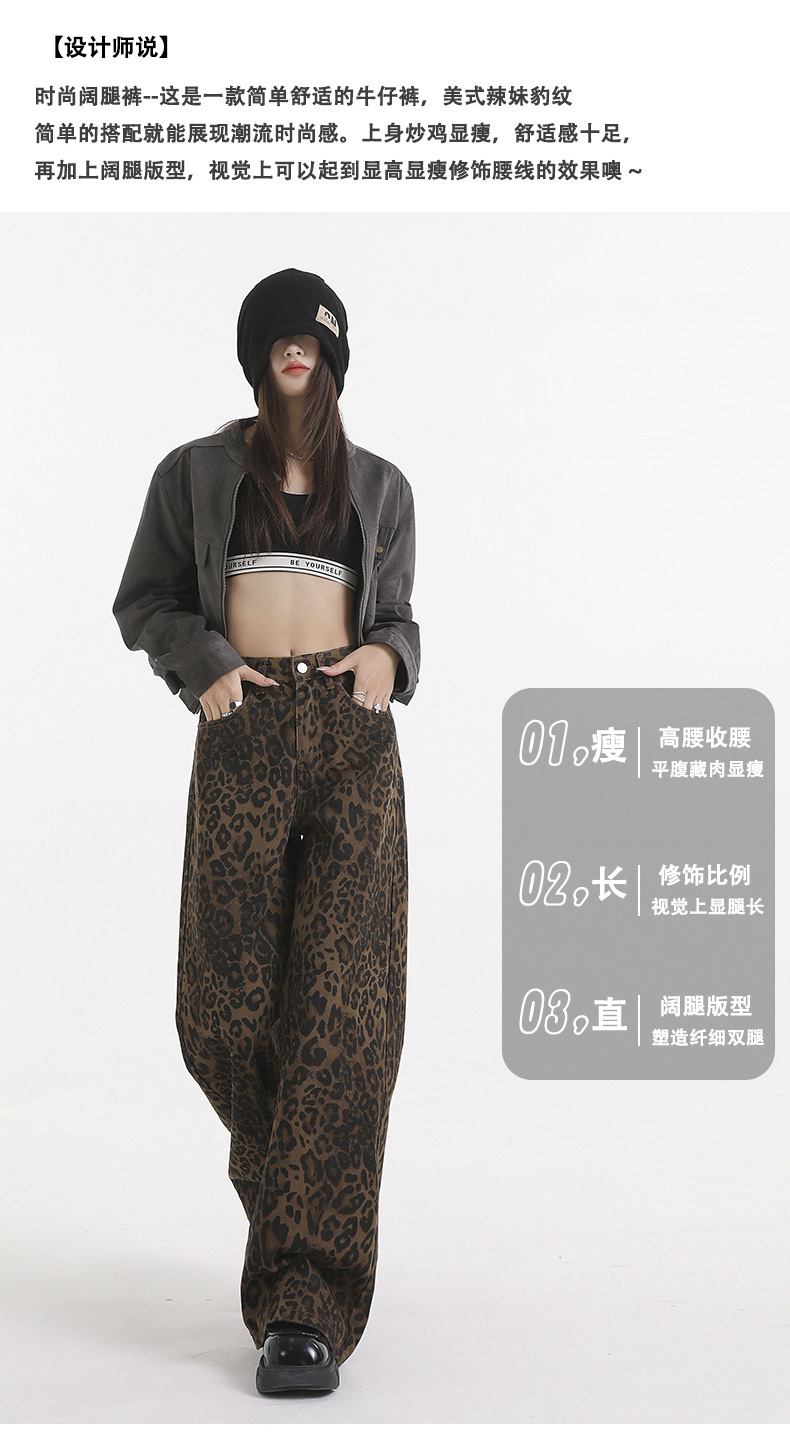 Jiajun Xintang 여성 의류 미국 스타일 빈티지 스파이스 소녀 레오파드 무늬 느슨한 넓은 다리 바지 틈새 캐주얼 와이드 다리 스트레이트 데님