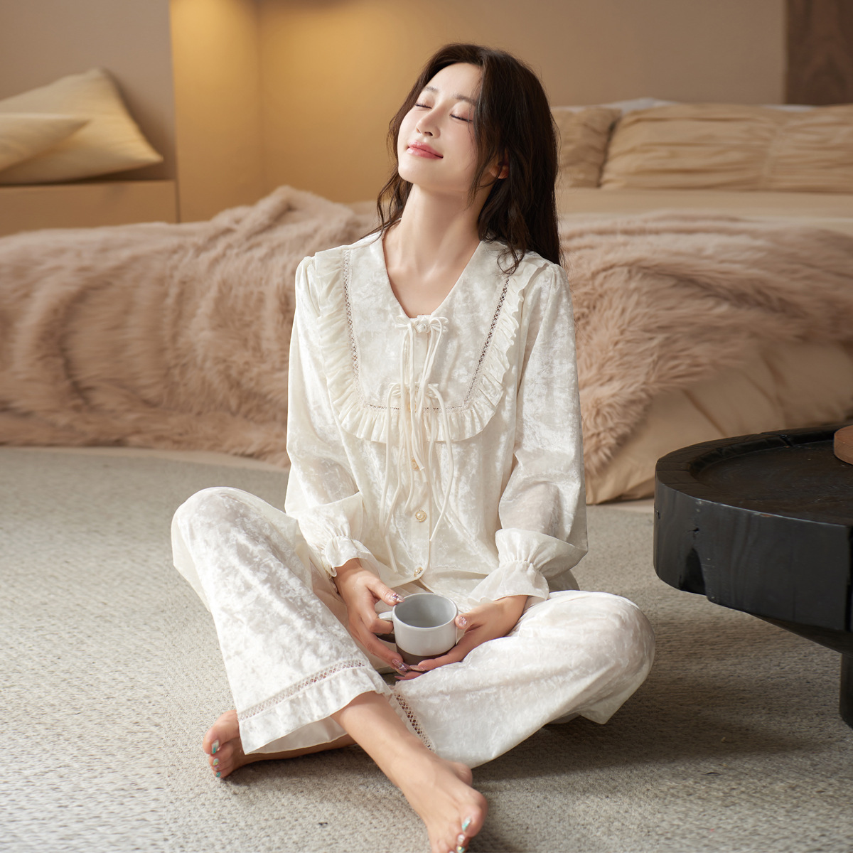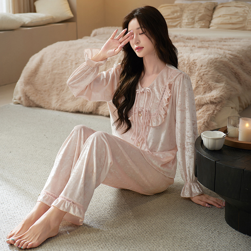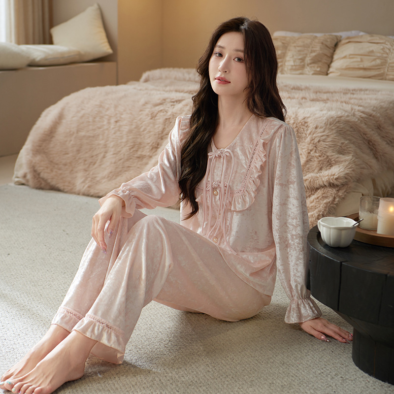 골드 벨벳 긴팔 잠옷 여성용 2025 신상 달콤한 공주 스타일 고급스러운 캐주얼 한국 스타일 골드 다이아몬드 벨벳 홈웨어