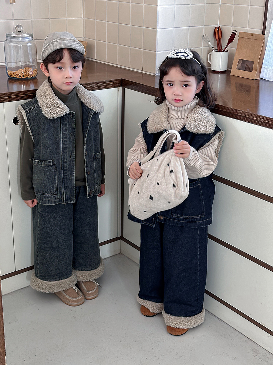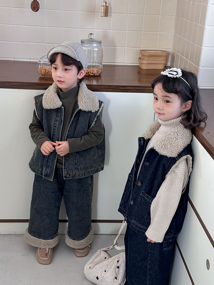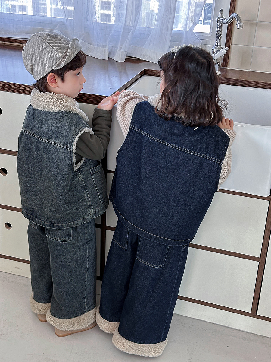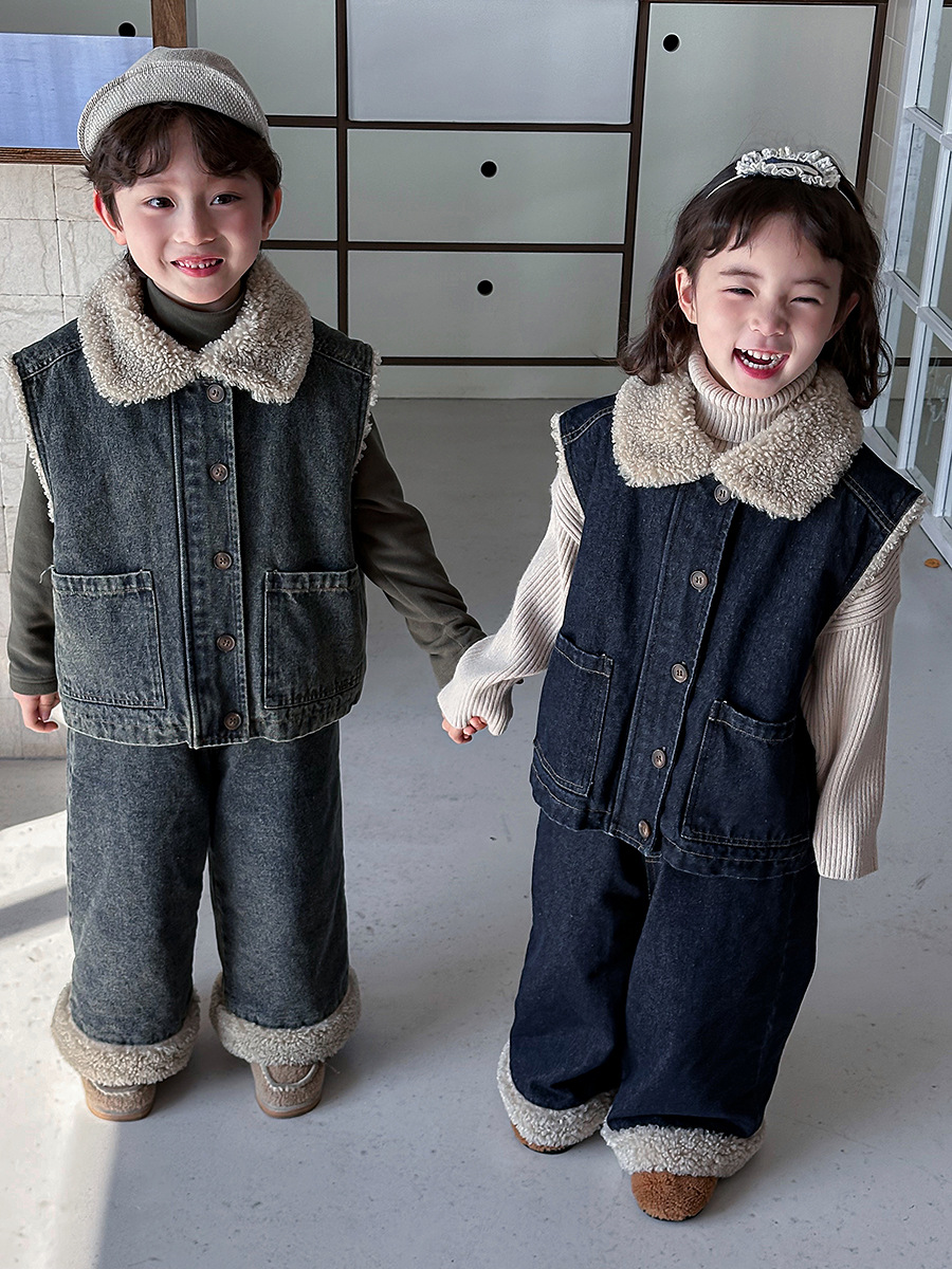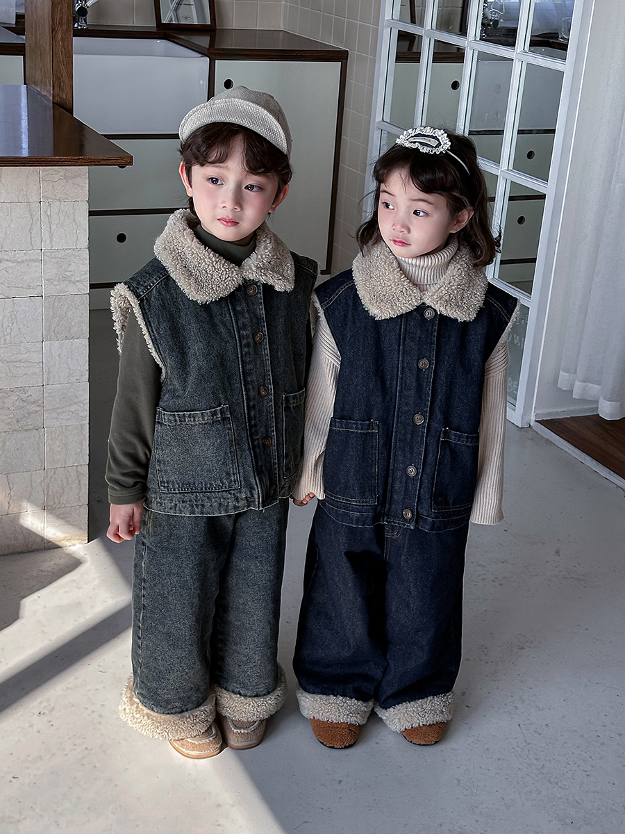 지아예 어린이 제품 2025 남아용 겨울 양털 데님 조끼 코트 중소형 어린이용 두꺼운 와이드 팬츠 투피스 세트스토어 가기